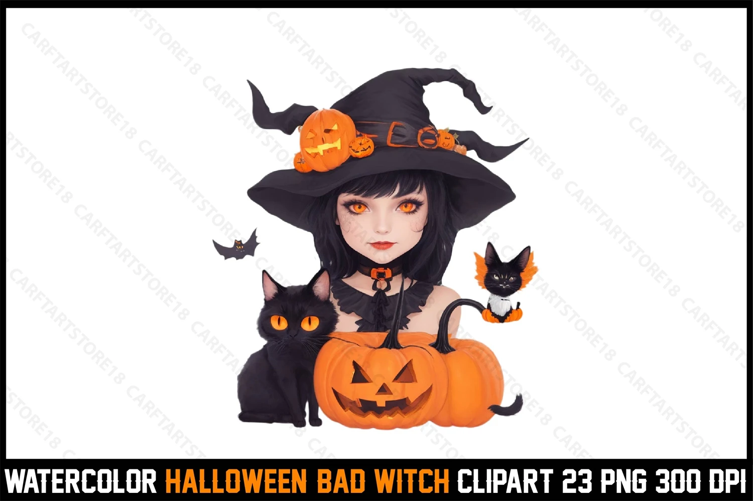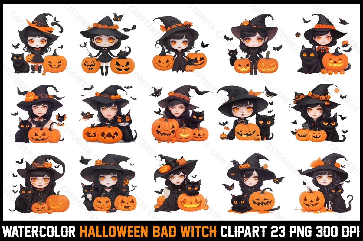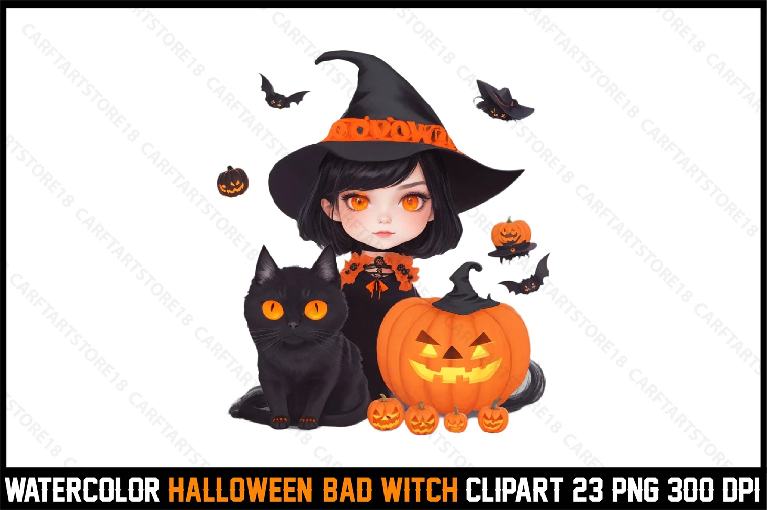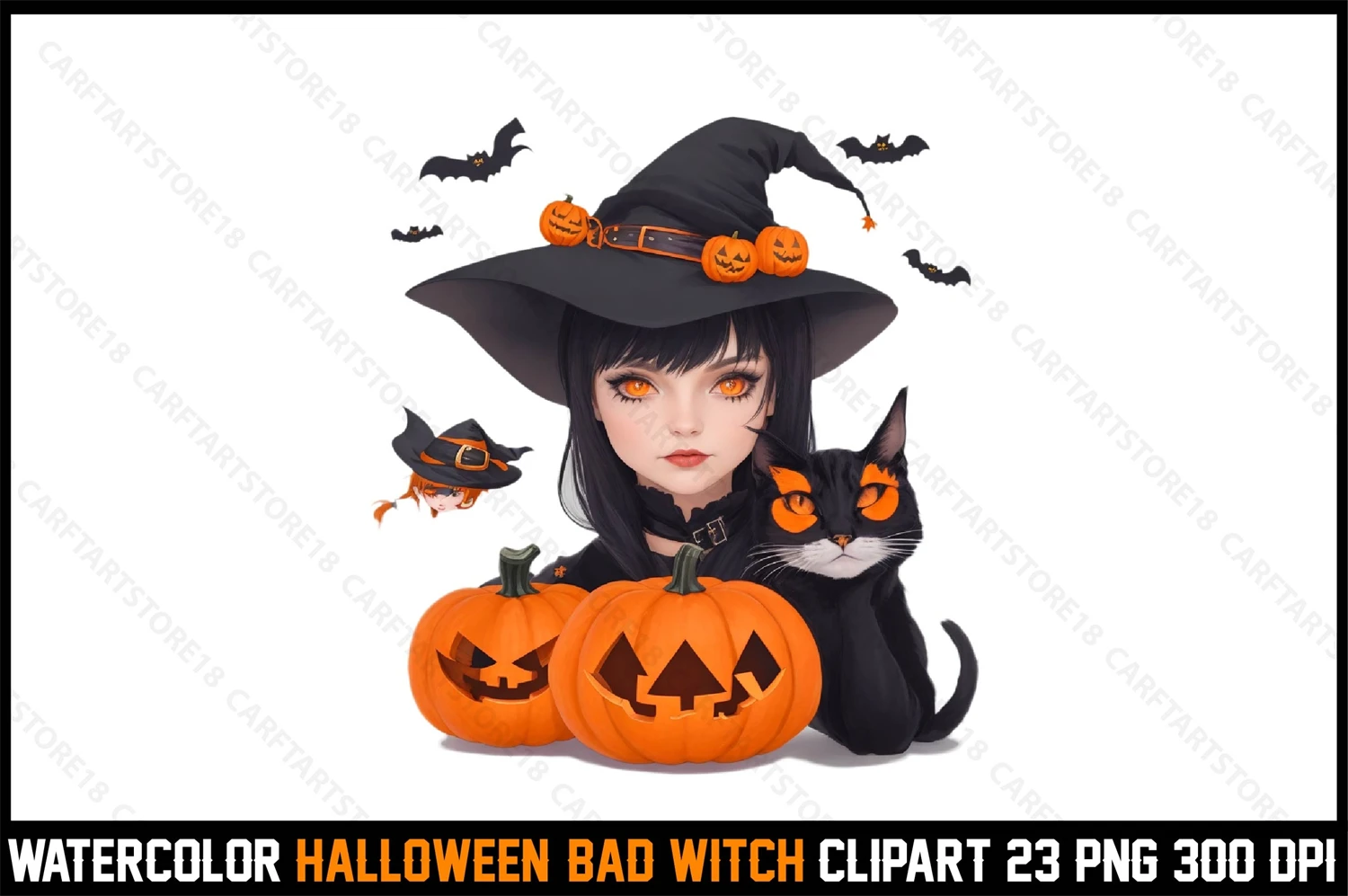 Watercolor Halloween Bad Witch Clipart T-Shirt Design Bundle digital download cutting file for Circuit And Silhouette