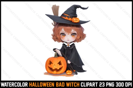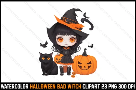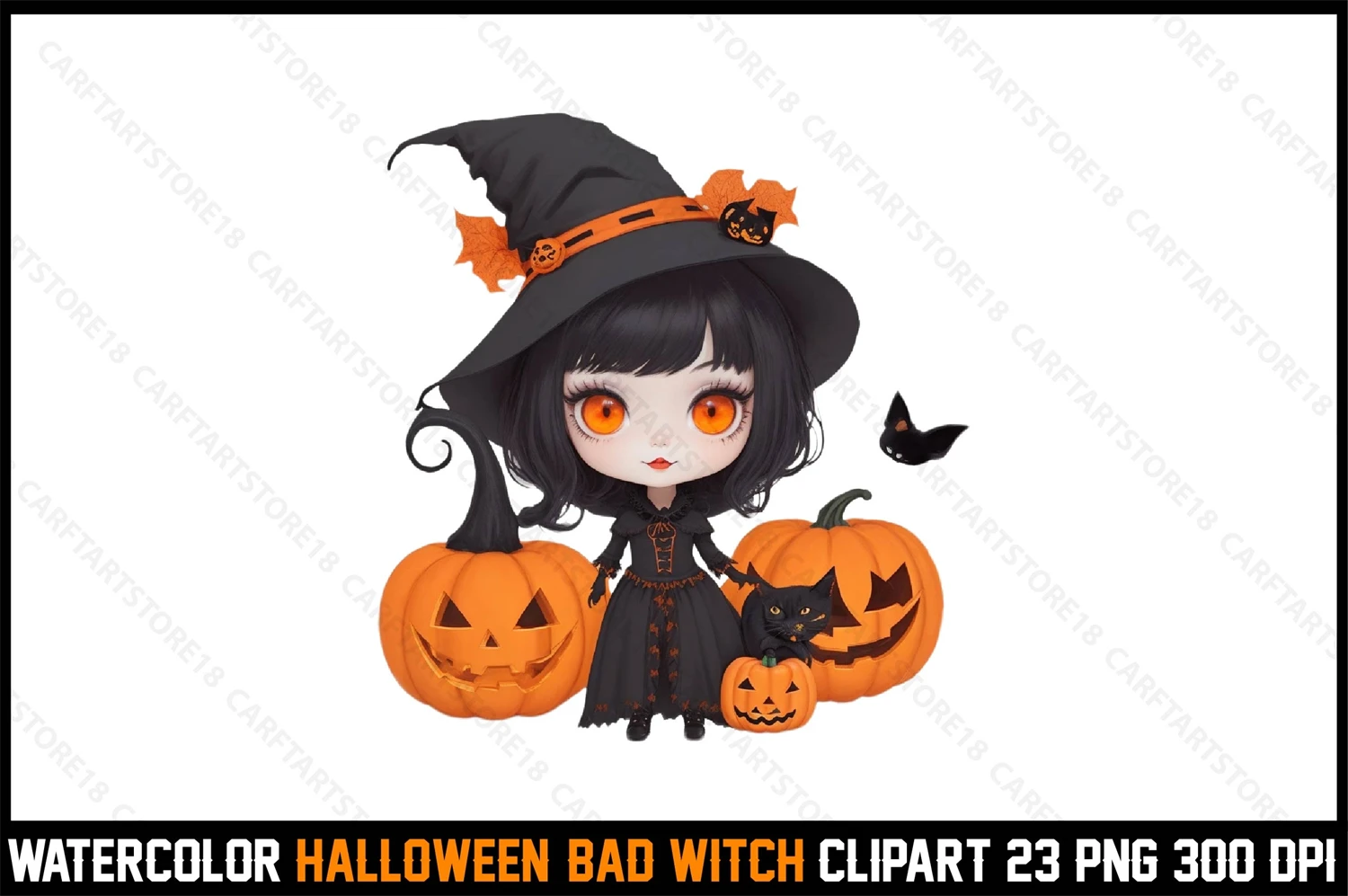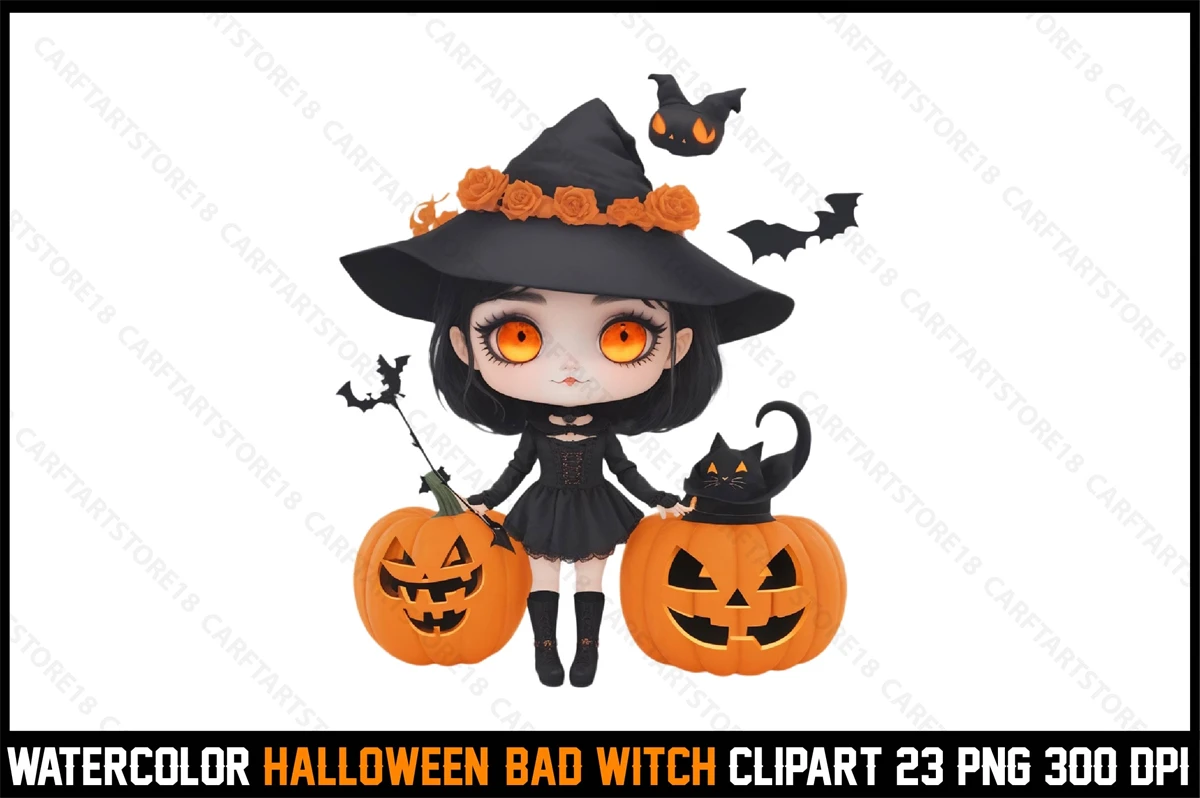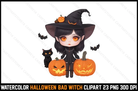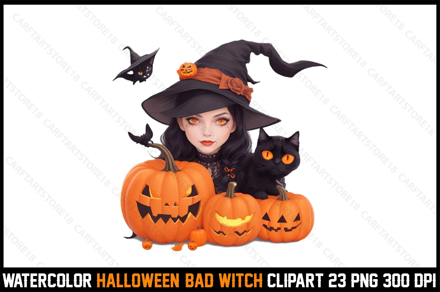Watercolor Halloween Bad Witch Clipart T-Shirt Design Bundle digital download cutting file for Circuit And Silhouette
