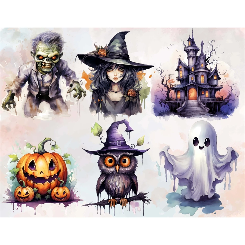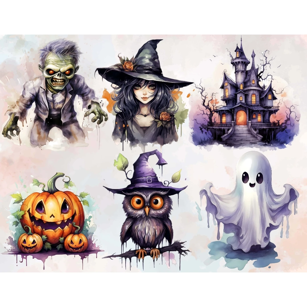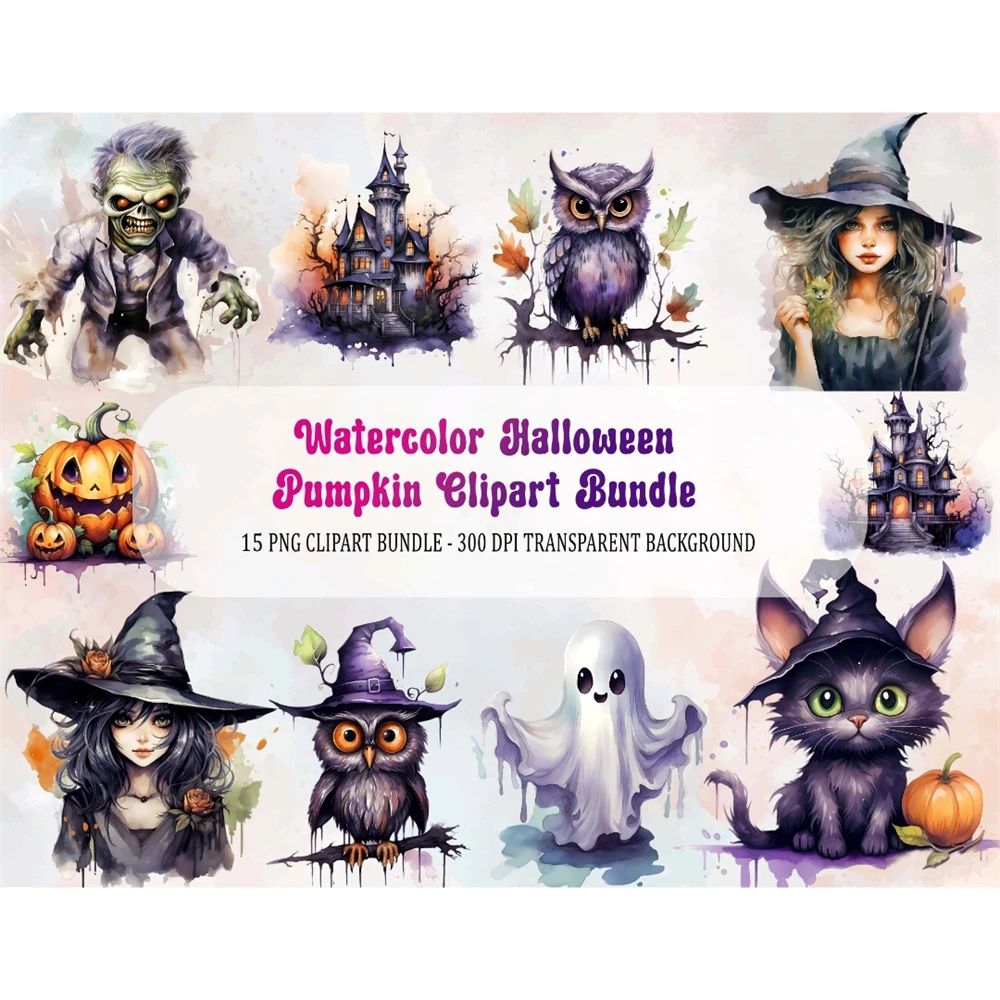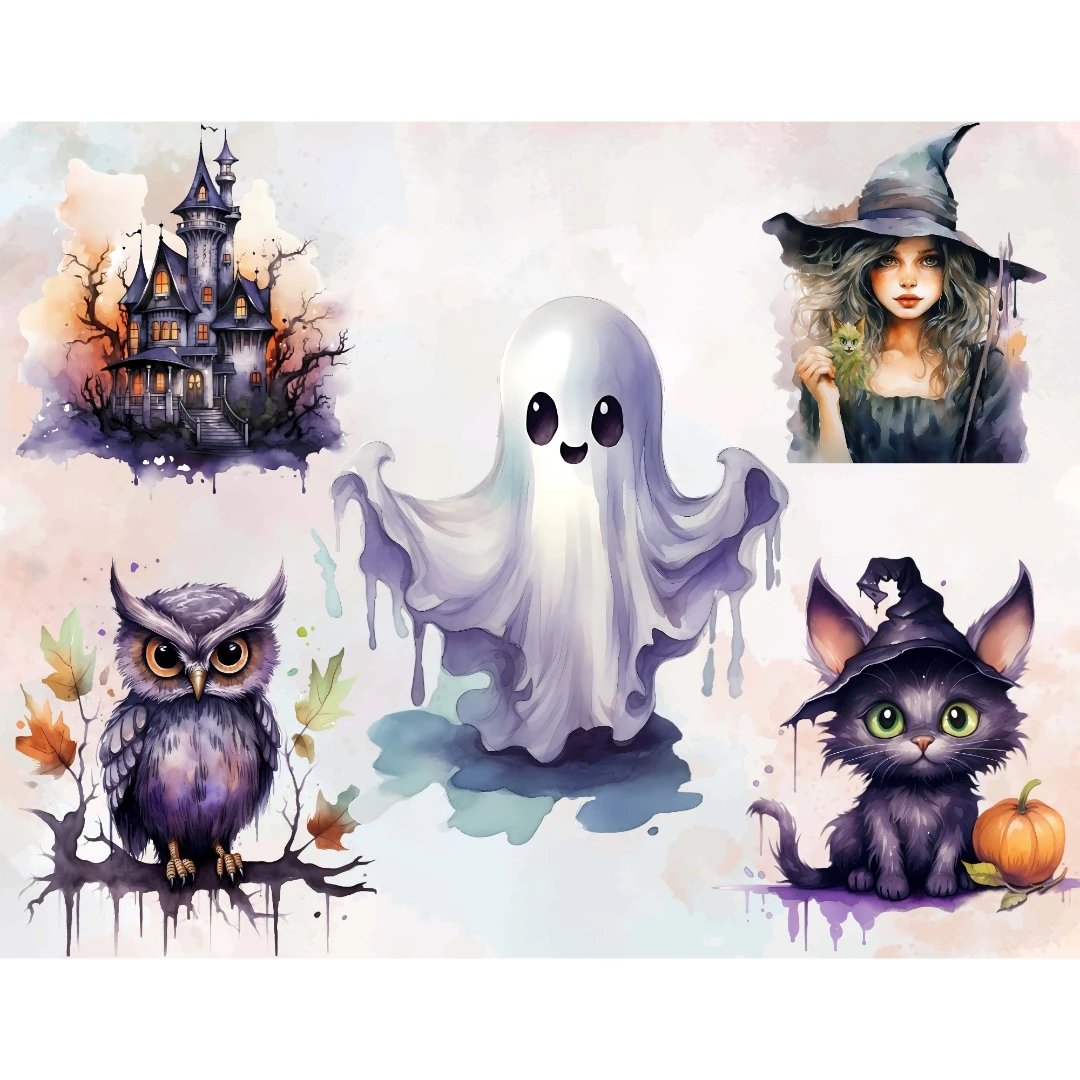 Watercolor Halloween Cats Owls Ghosts Witch Clipart Bundle