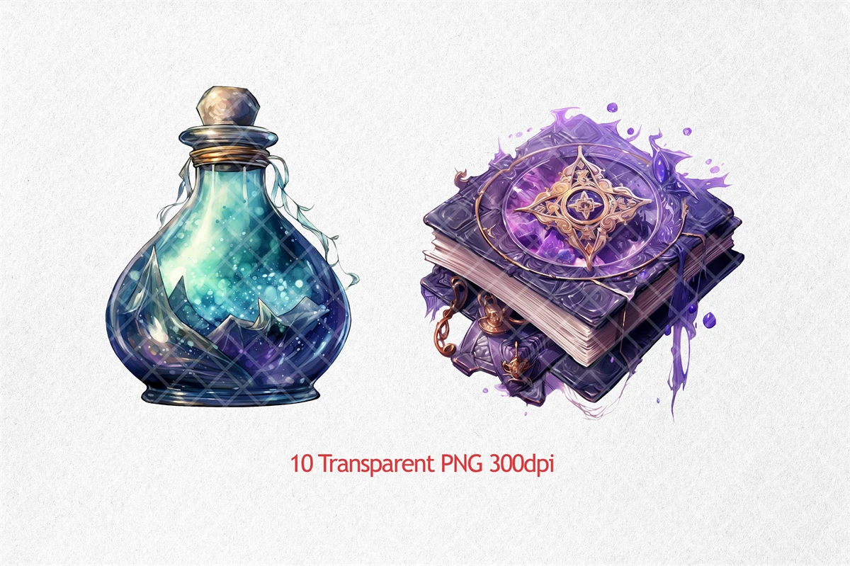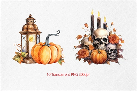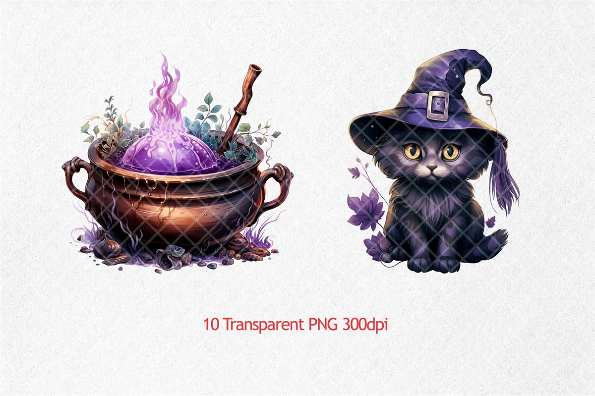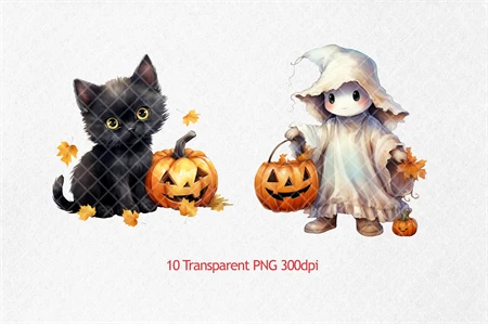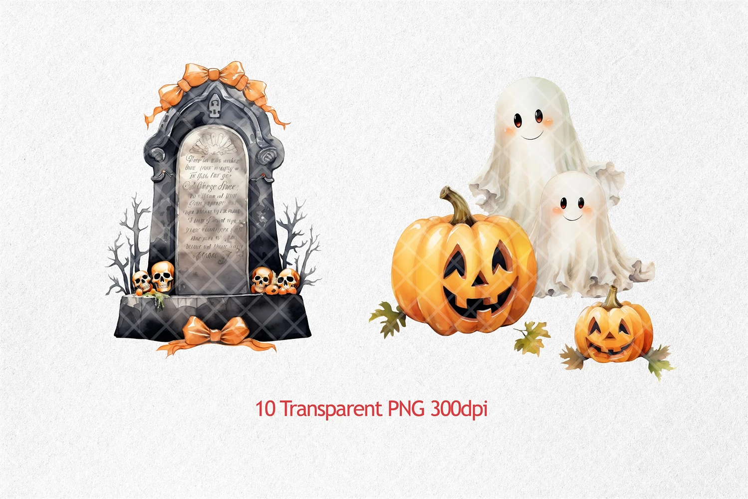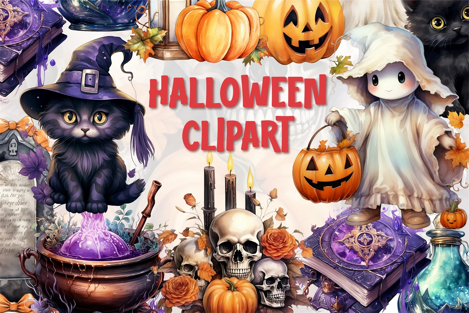 Watercolor Halloween Clipart, Black Cat Pumpkin Witch Ghost PNG, Spooky Halloween Clipart, Halloween PNG, Skull Pumpkin Candles, PNG File. All elements are high-resolution (300dpi) PNG files with transparent backgrounds.