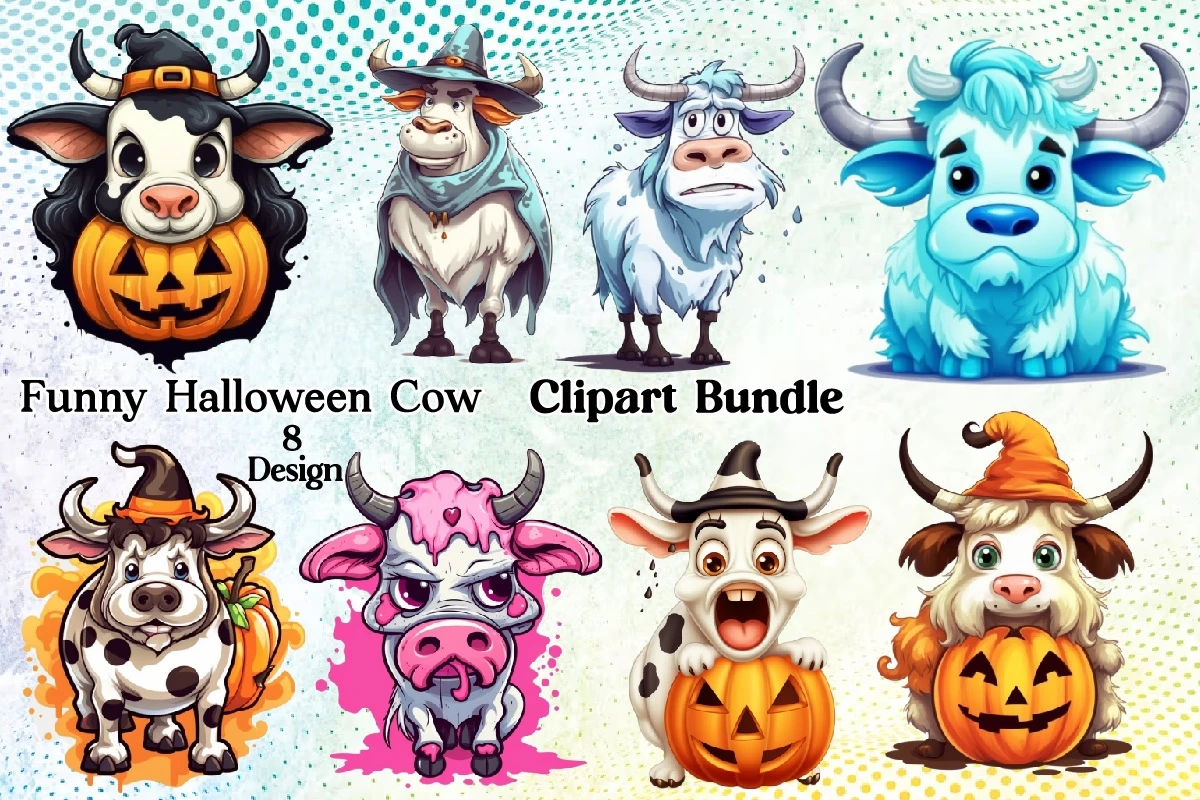 Watercolor Halloween Funny Cow Sublimation Design Bundle