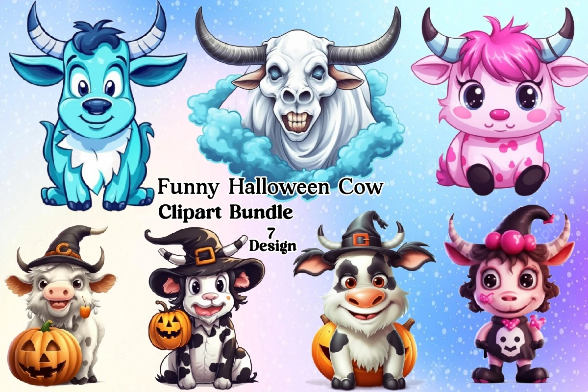 Watercolor Halloween Funny Cow Sublimation Design Bundle