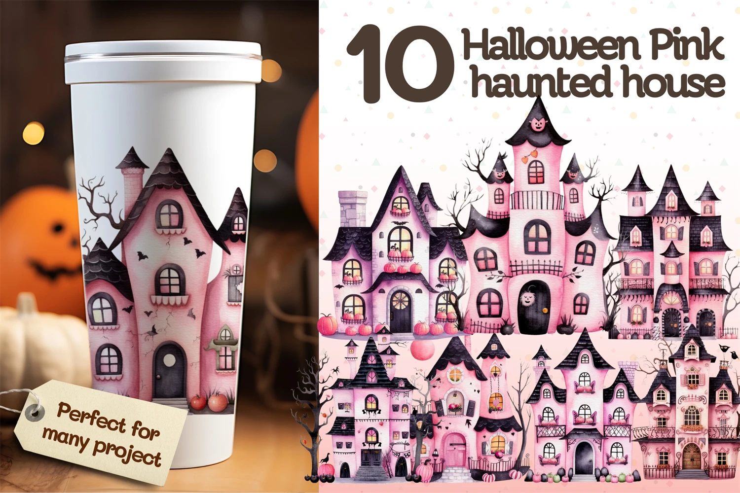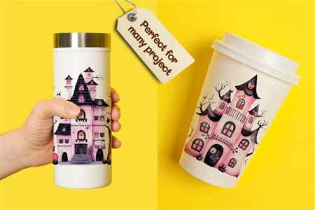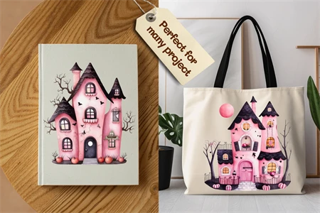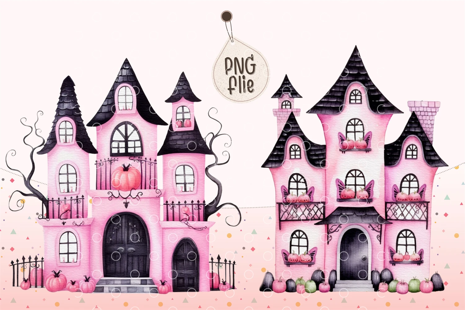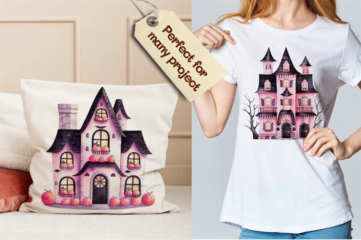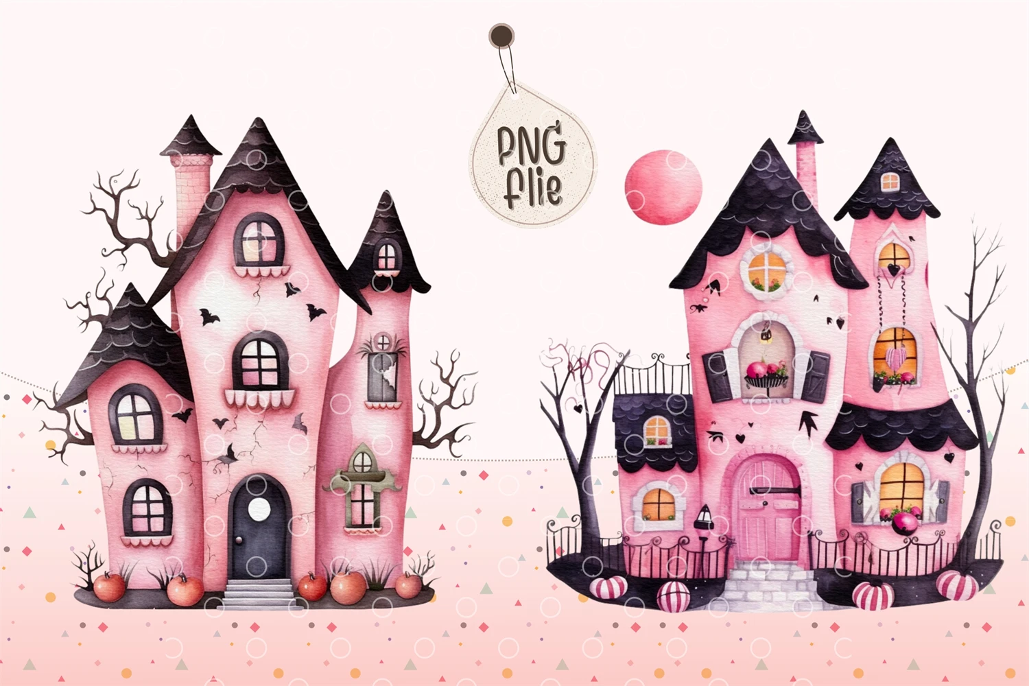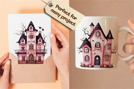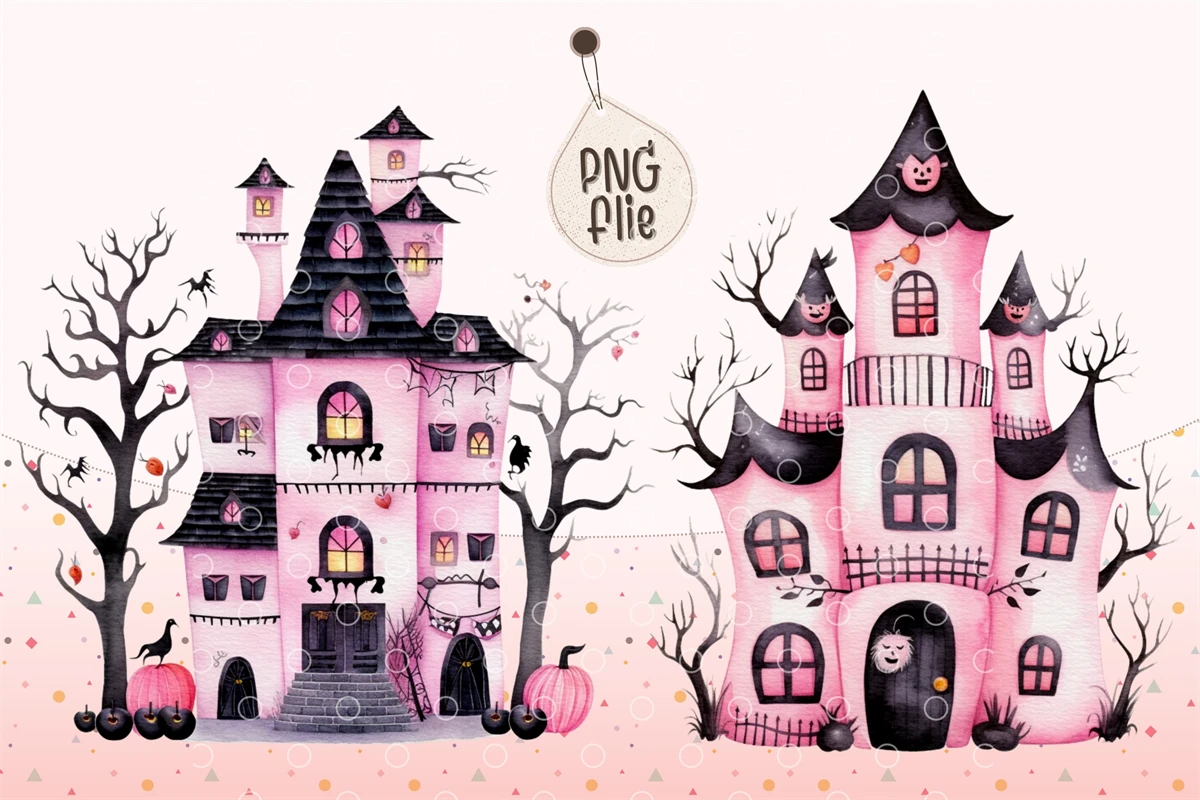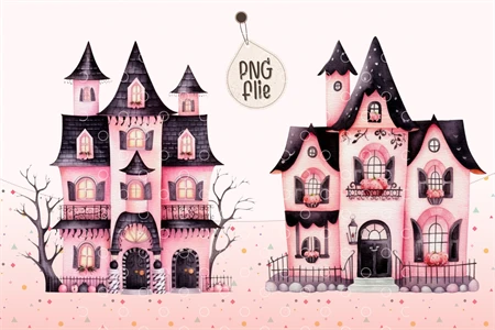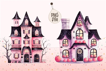 Watercolor Halloween Pink haunted house