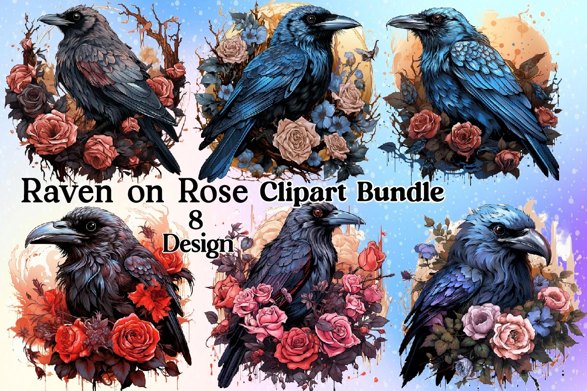 Watercolor Halloween Raven Rose Sublimation Design Bundle