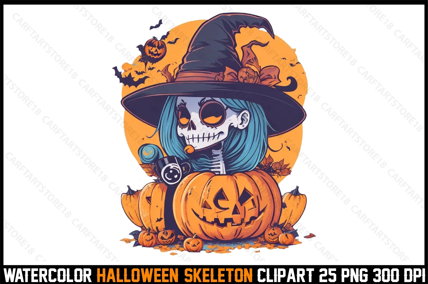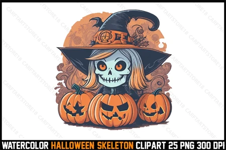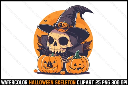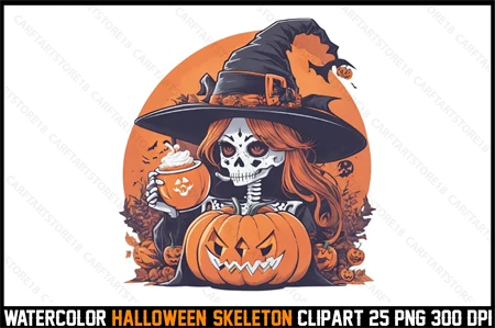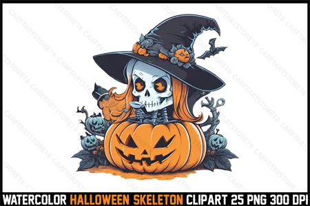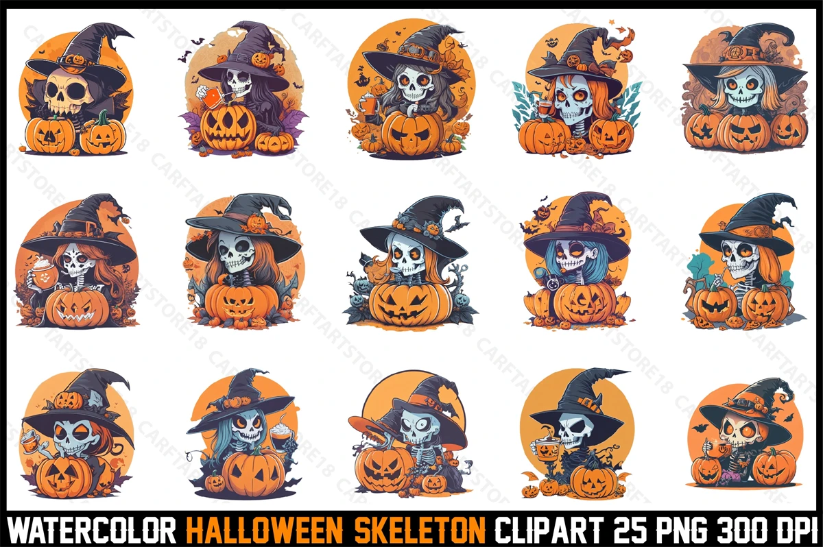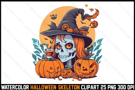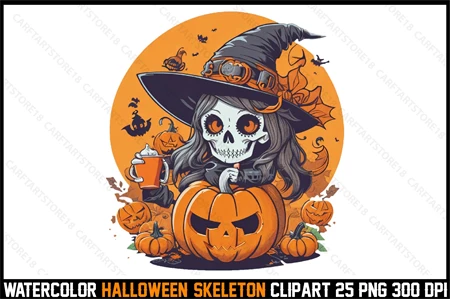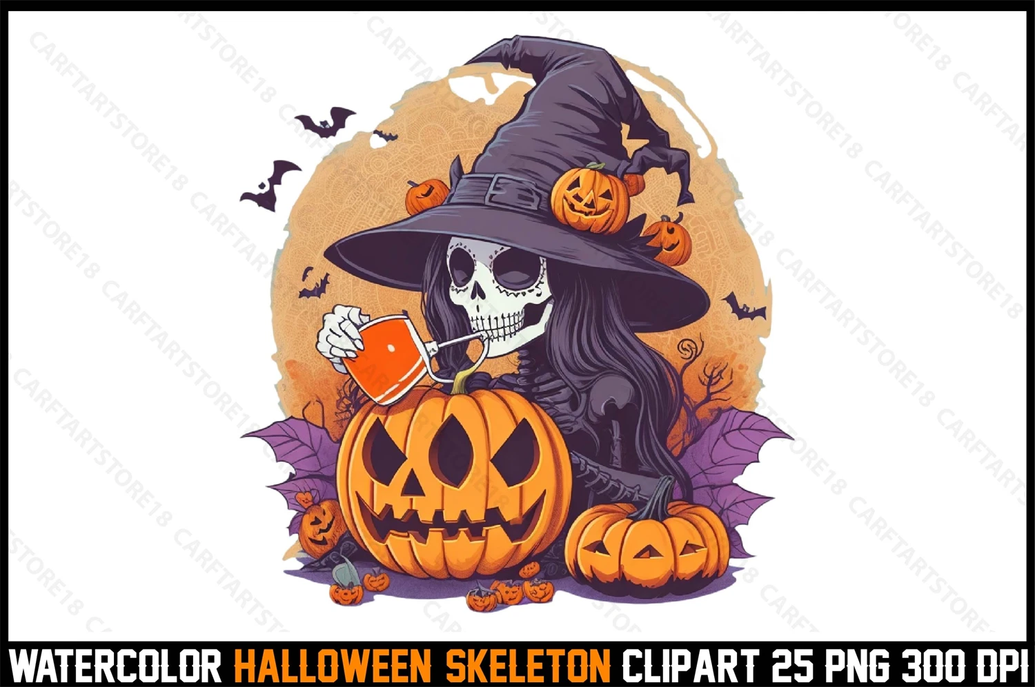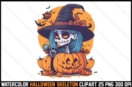 Watercolor Halloween Skeleton Clipart T-Shirt Design Bundle digital download cutting file for Circuit And Silhouette