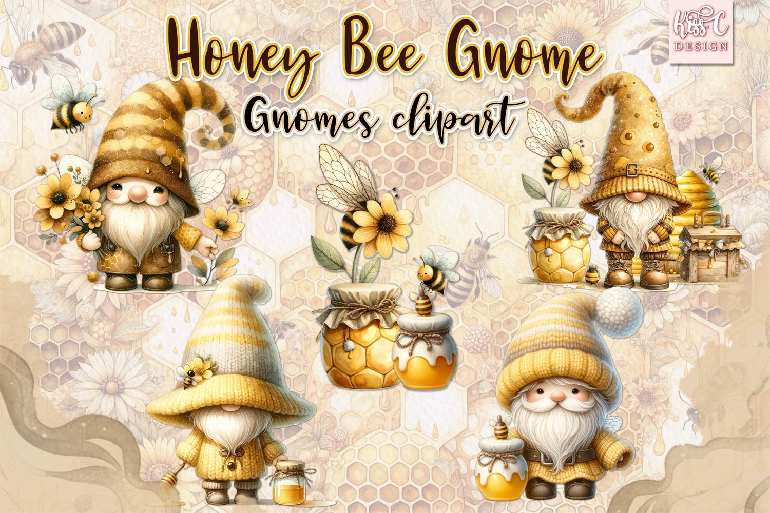 Watercolor Honey Bee Gnomes PNG Sublimation Clipart.
