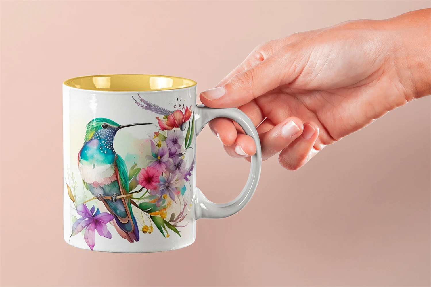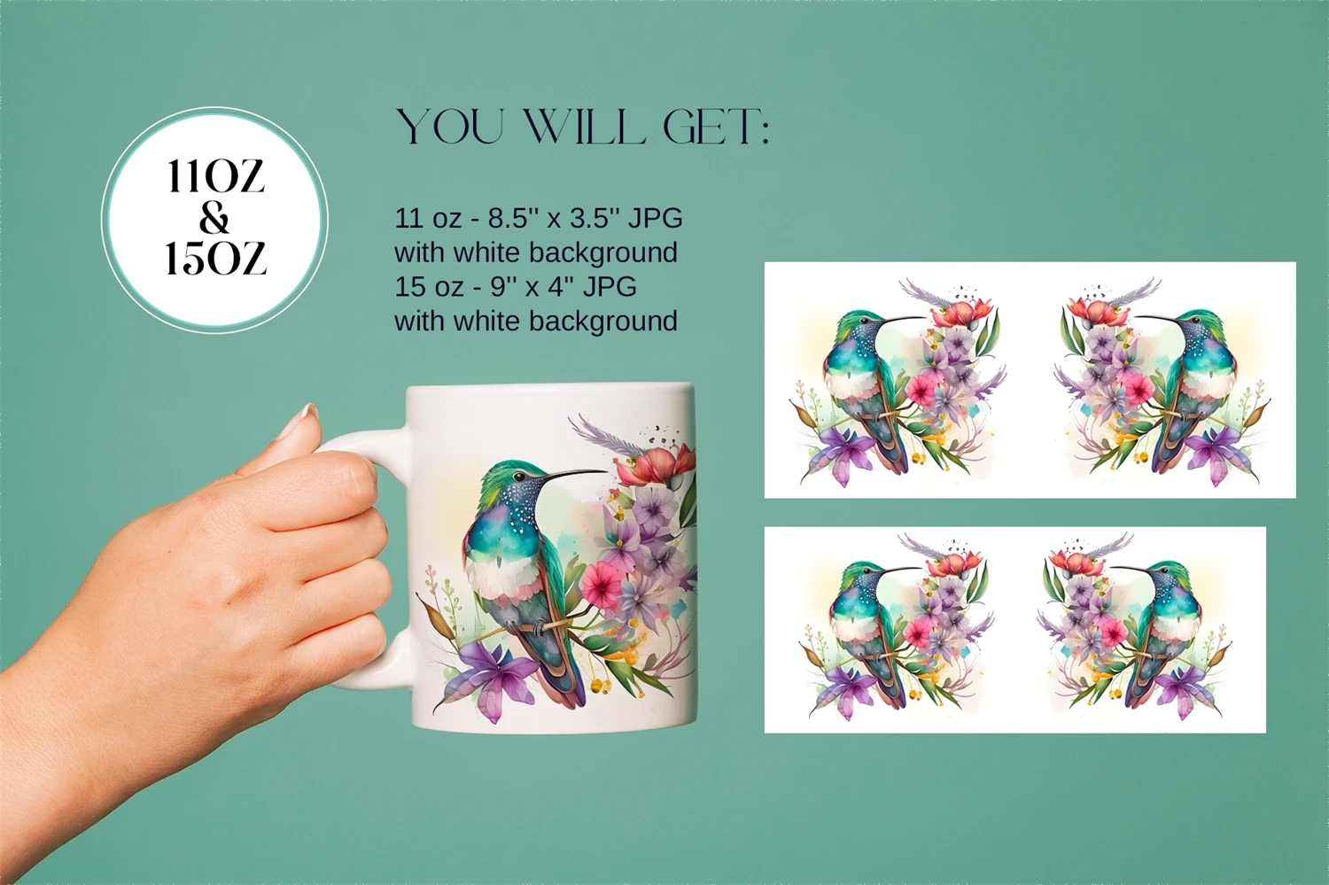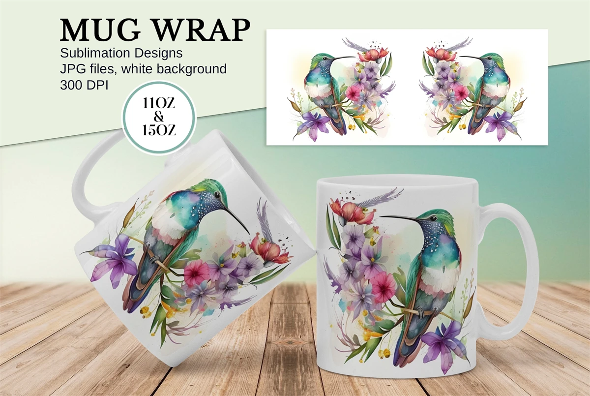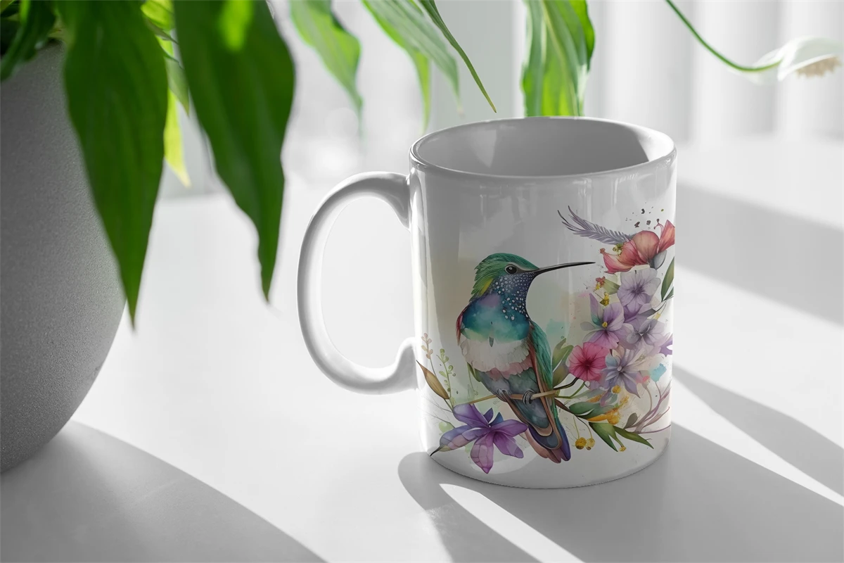 Mug Sublimation design with watercolor flowers, watercolor bird, Hummingbird illustrations. Use these flowers mug sublimation designs to create mugs for you and your friends.
