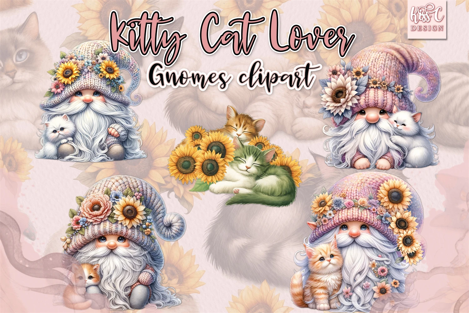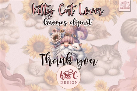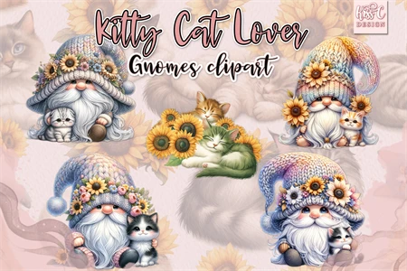 Watercolor Kitty Cat Lover Gnomes PNG Sublimation Clipart.