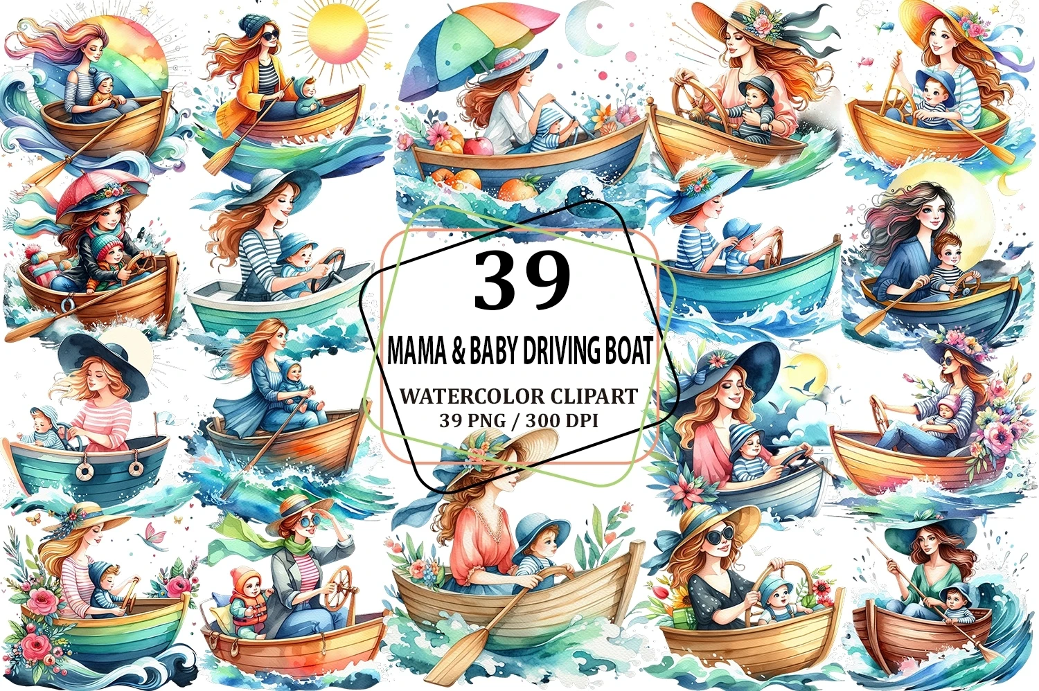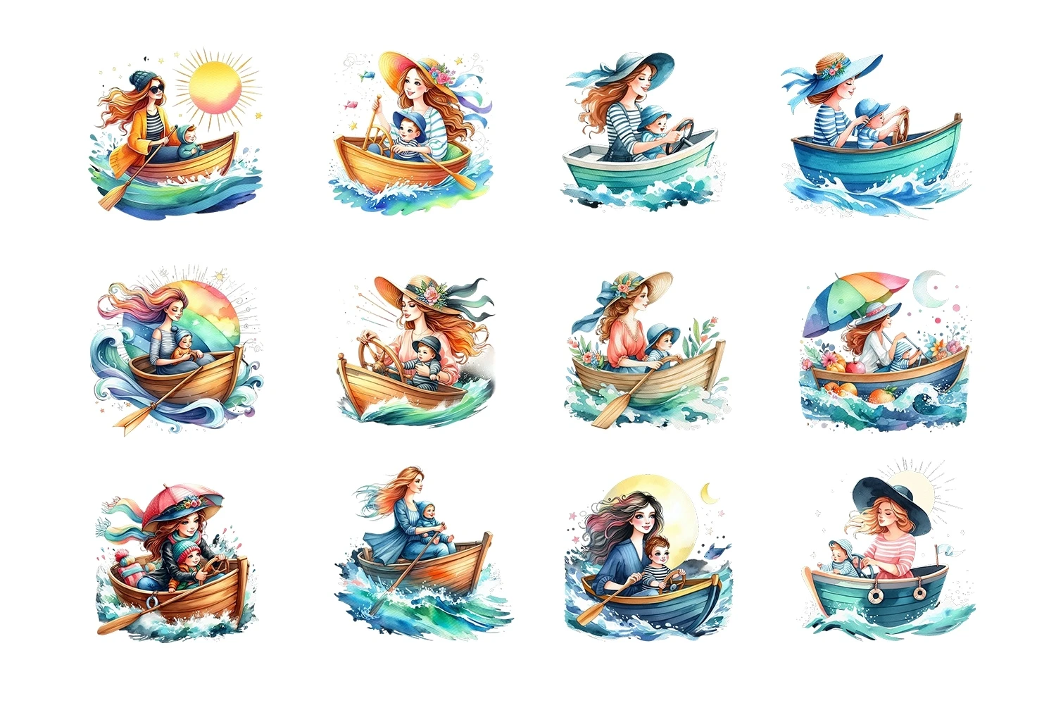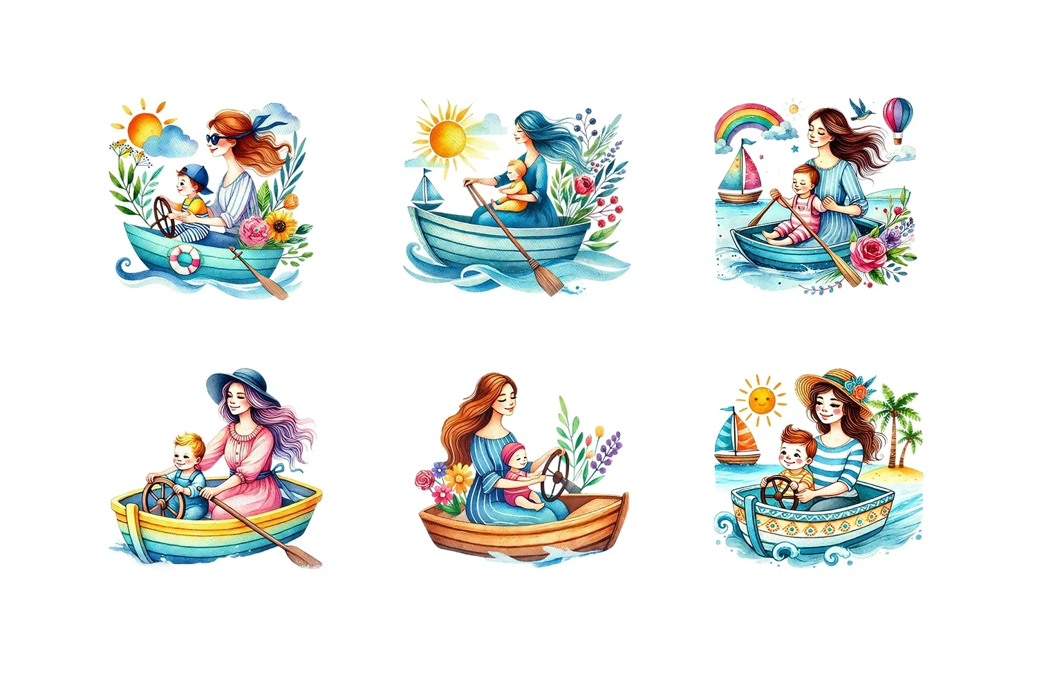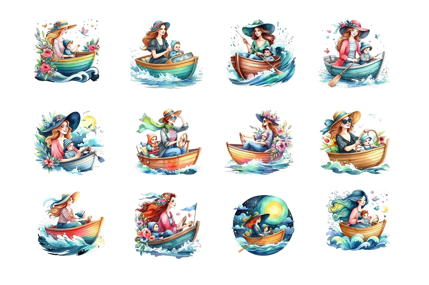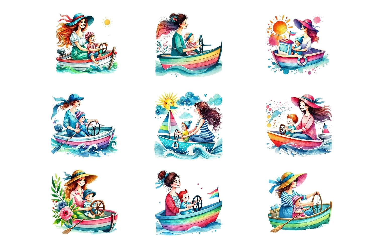 Watercolor Mama & Baby Driving Boat Clipart Sublimation (AI-generated).