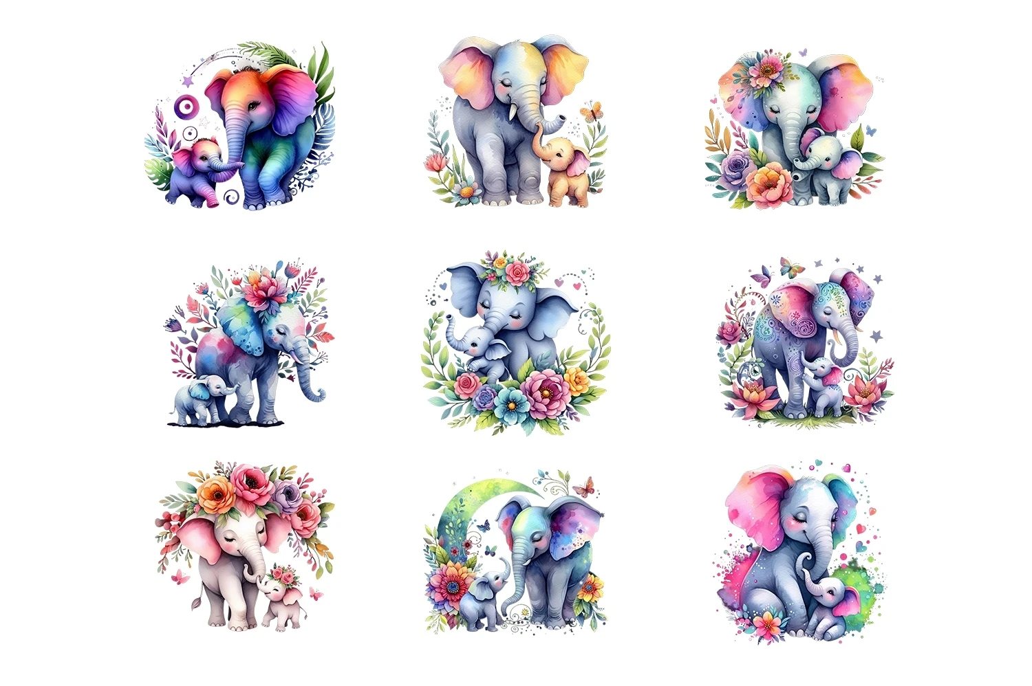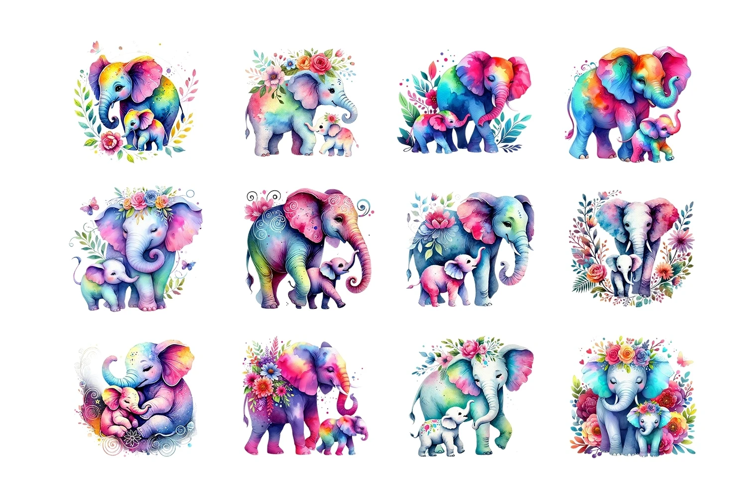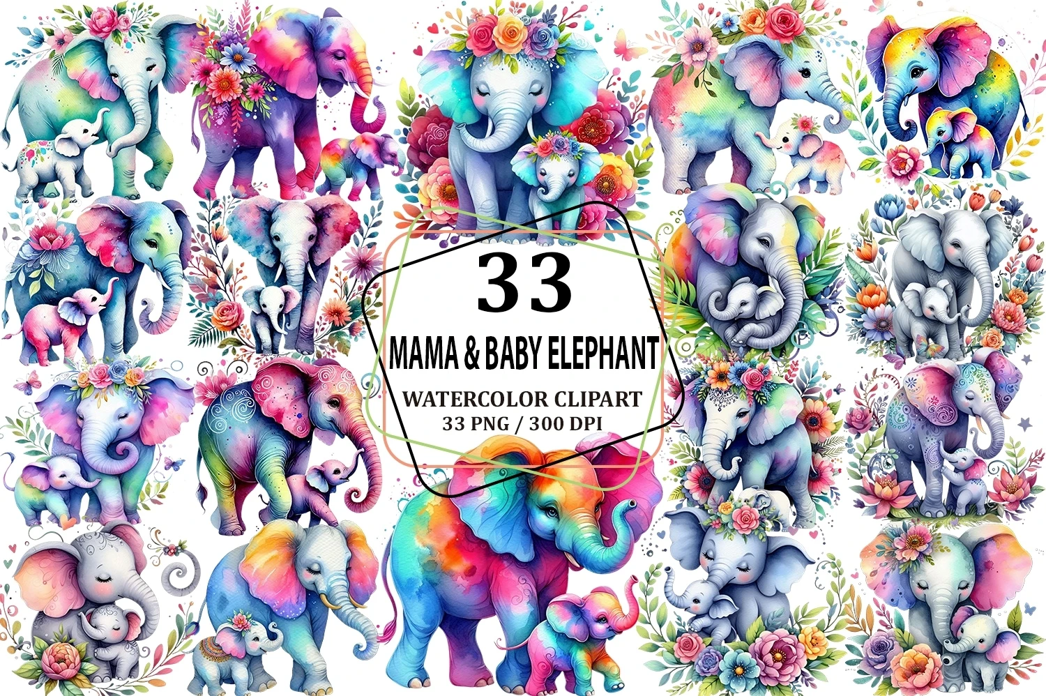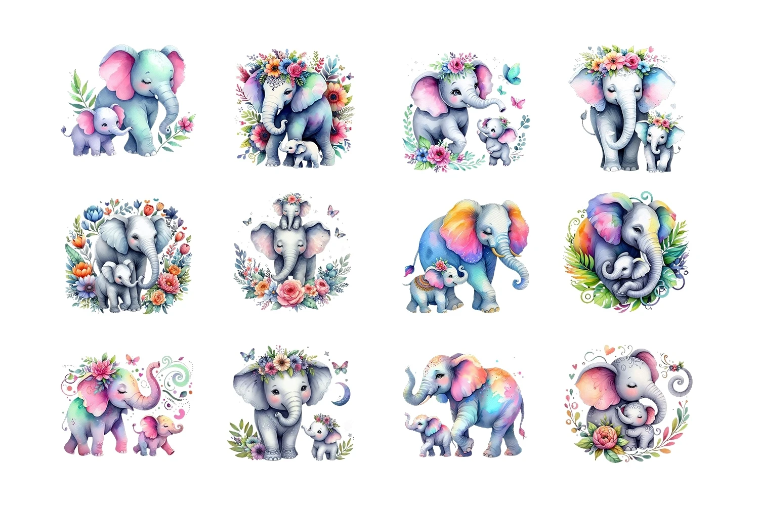 Watercolor Mama & Baby Elephant Clipart Sublimation (AI-generated).