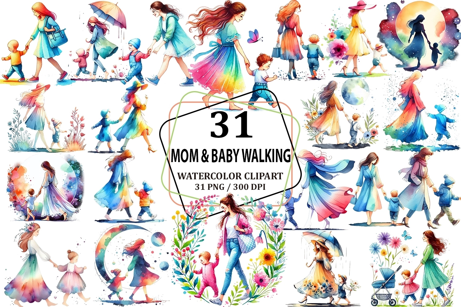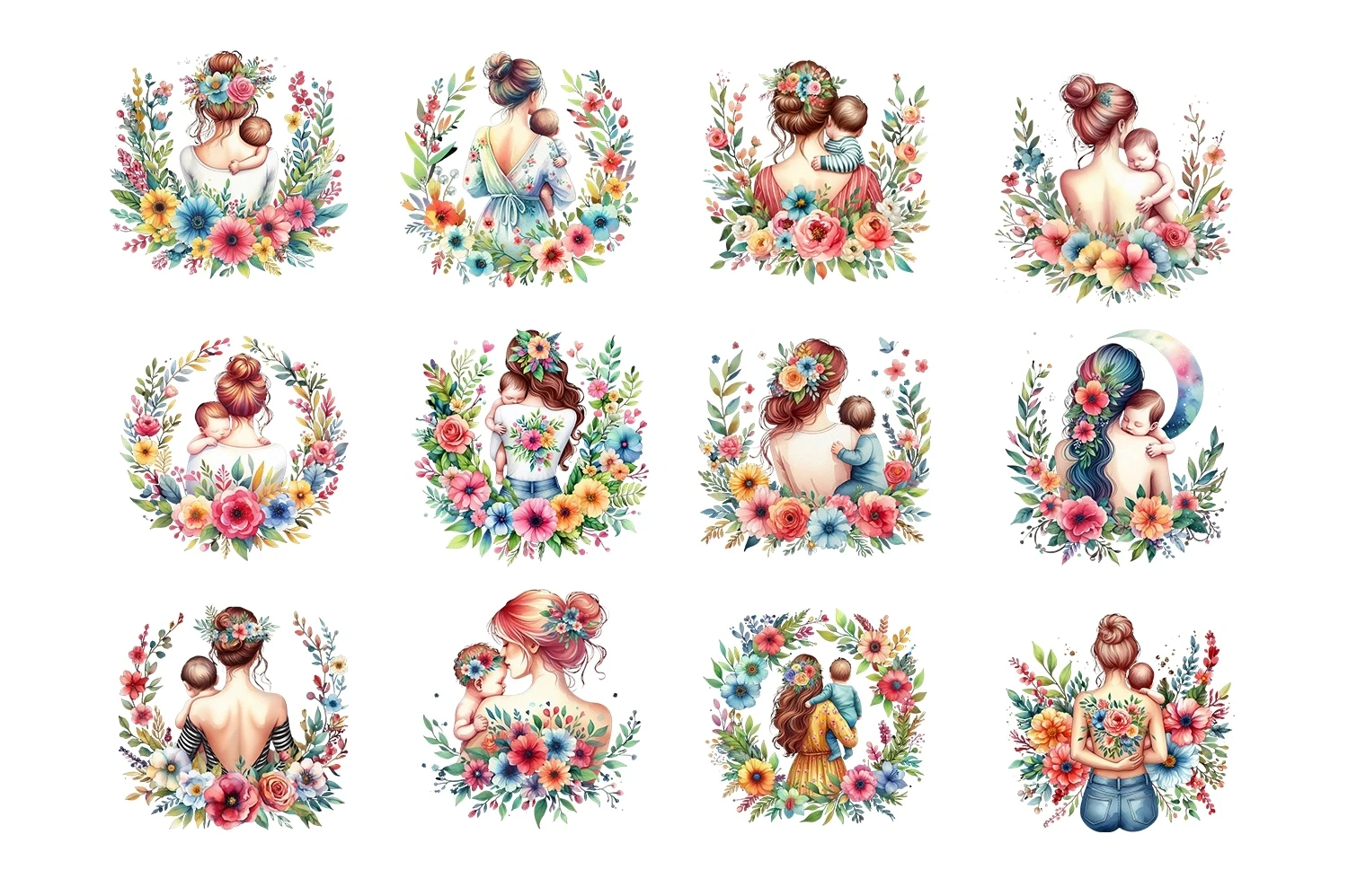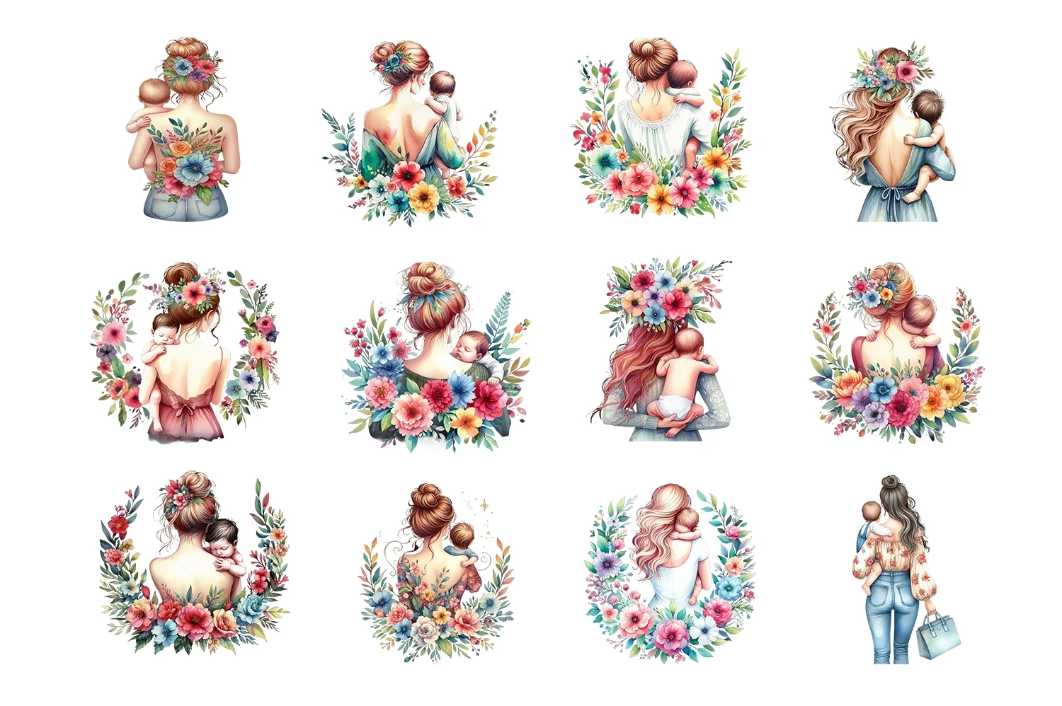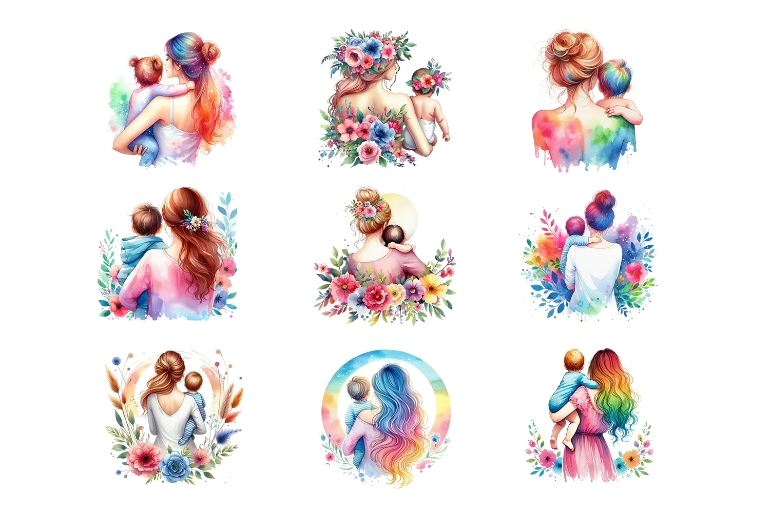Watercolor Mom & Baby Back Side Clipart Sublimation (AI-generated).