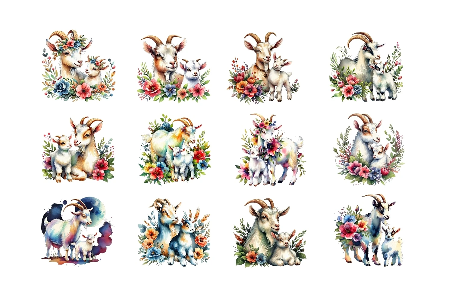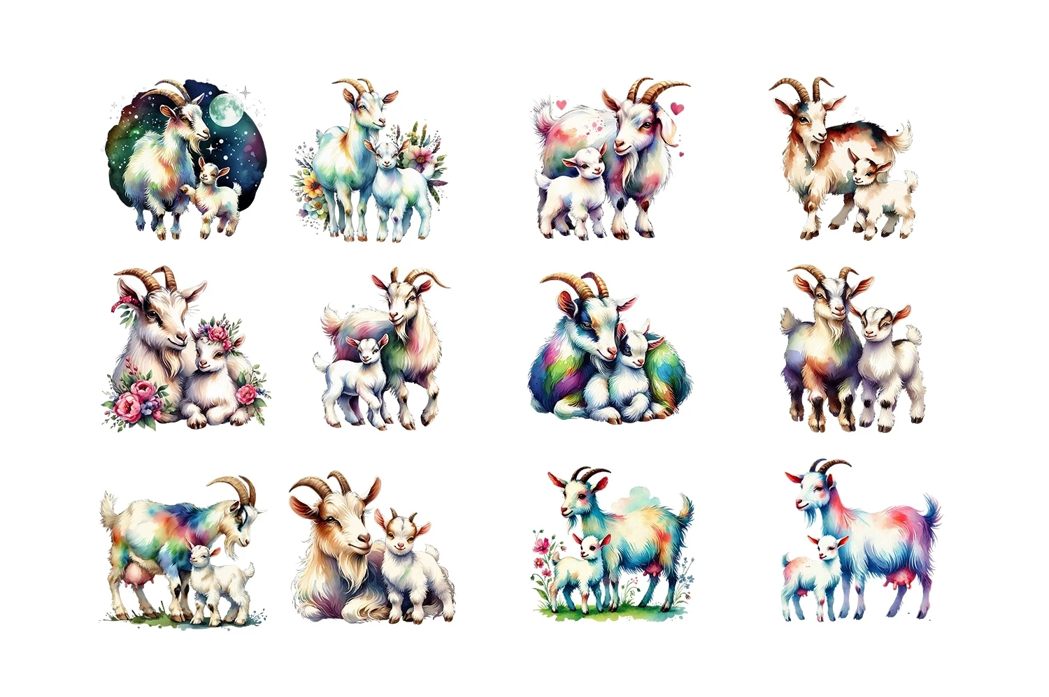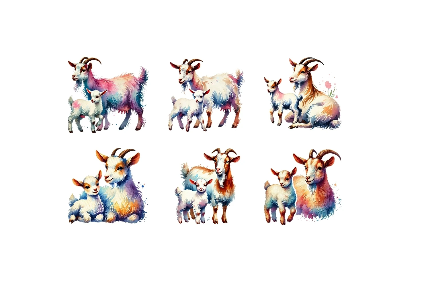Watercolor Mom & Baby Goat Clipart Sublimation PNG (AI-generated).
