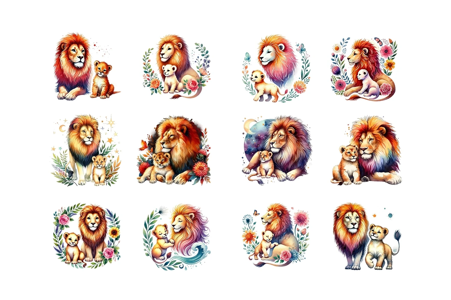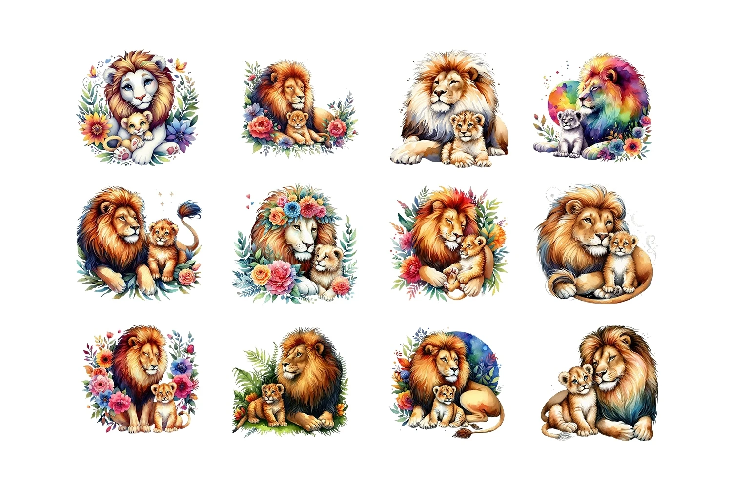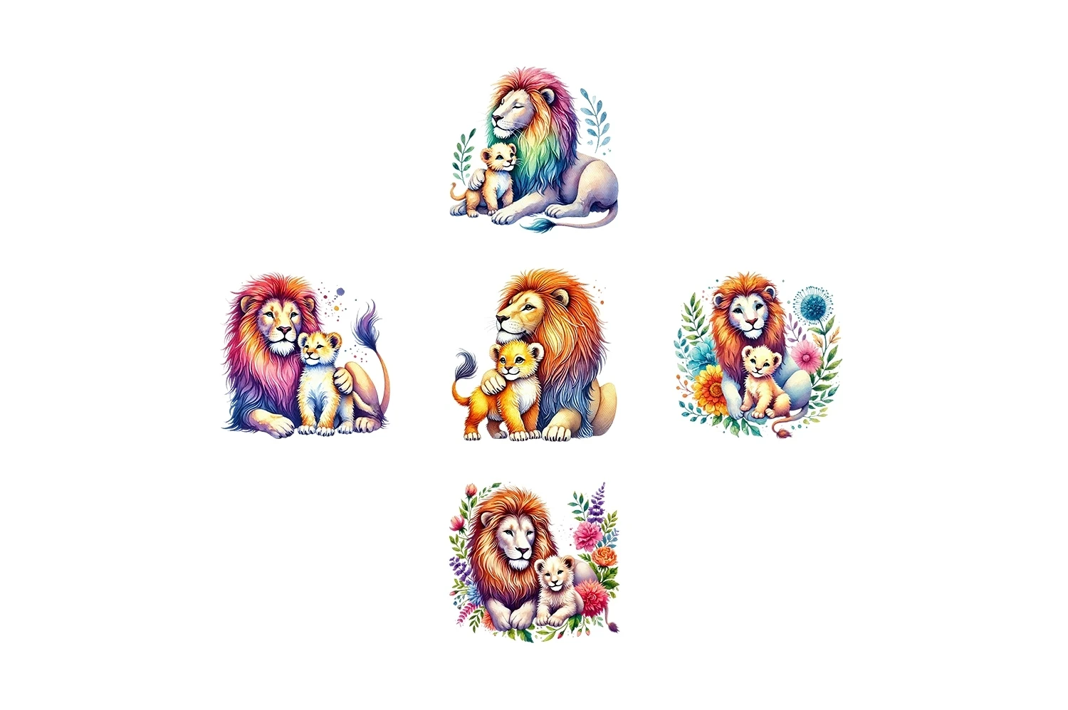 Watercolor Mom & Baby Lion Clipart Sublimation PNG (AI-generated).