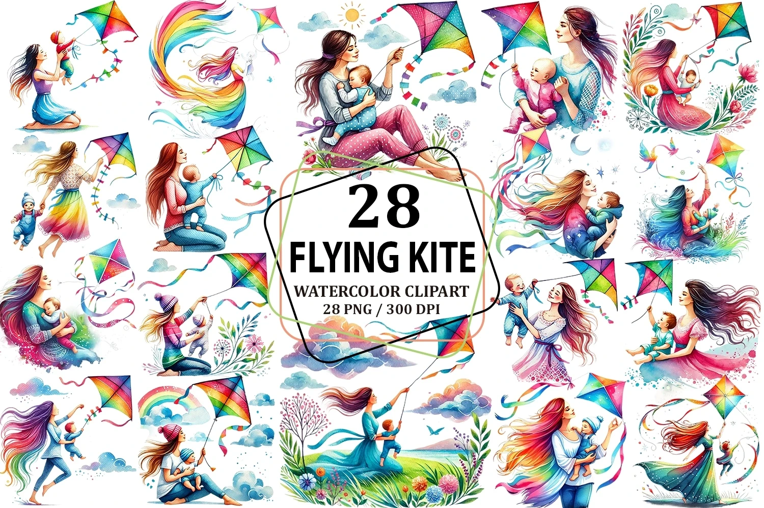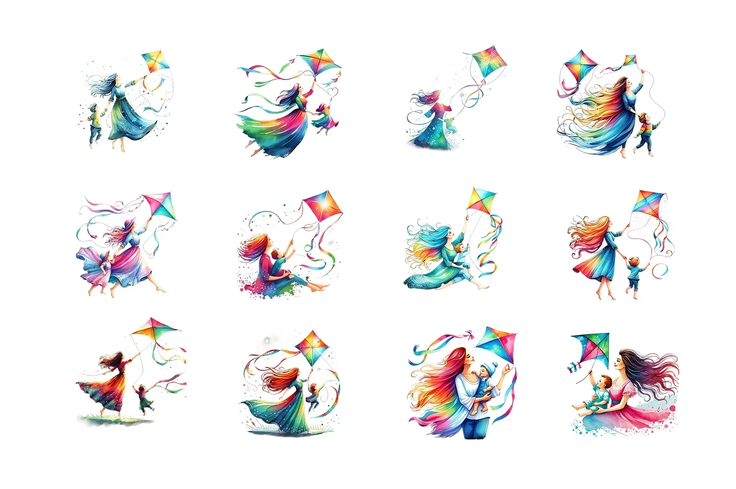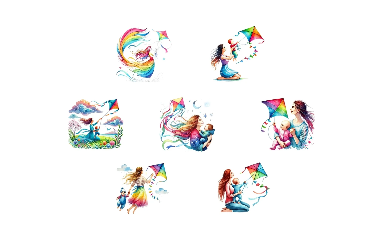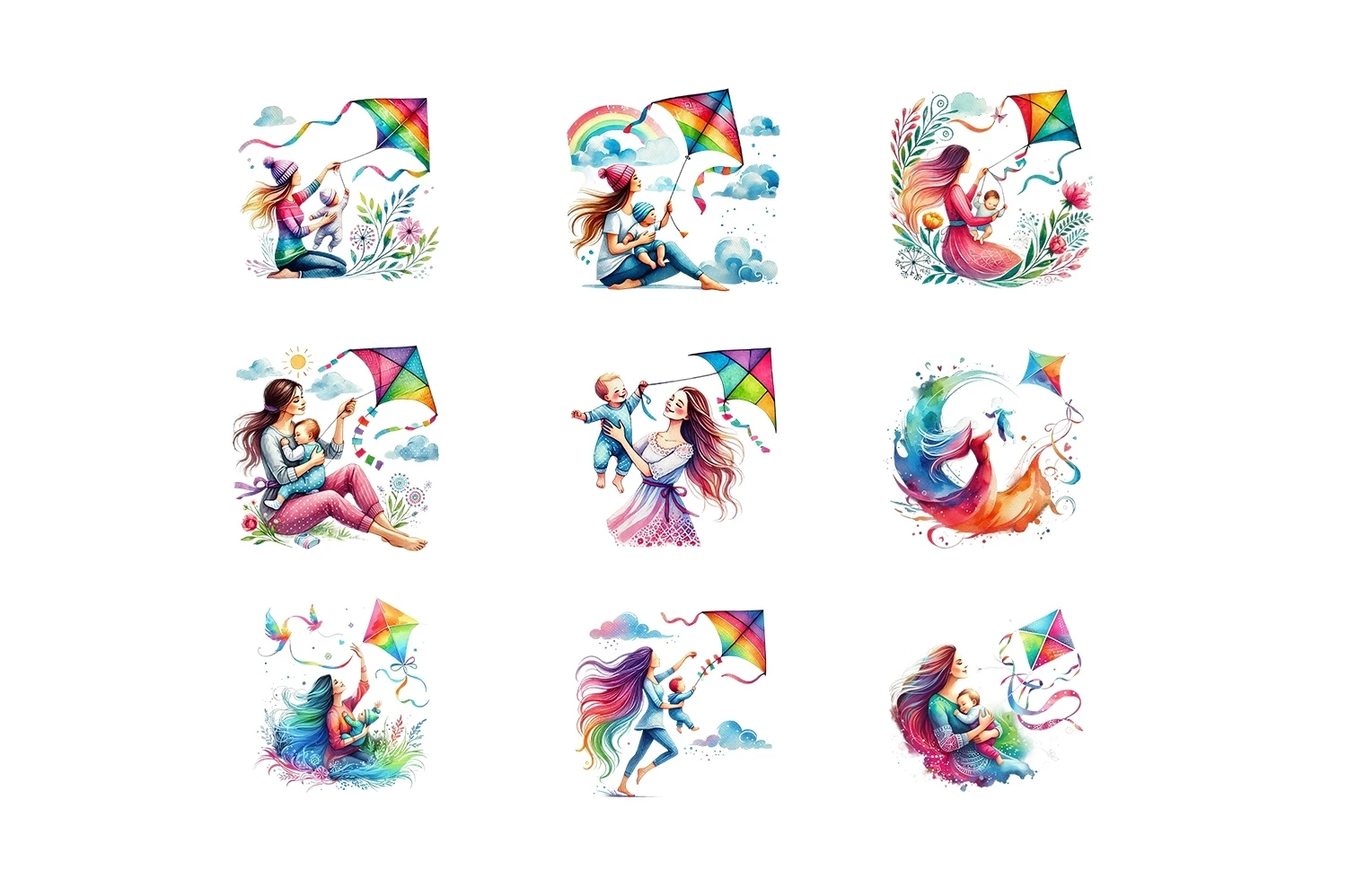 Watercolor Mommy & Baby Flying Kite Mother's Day Clipart PNG (AI-generated).