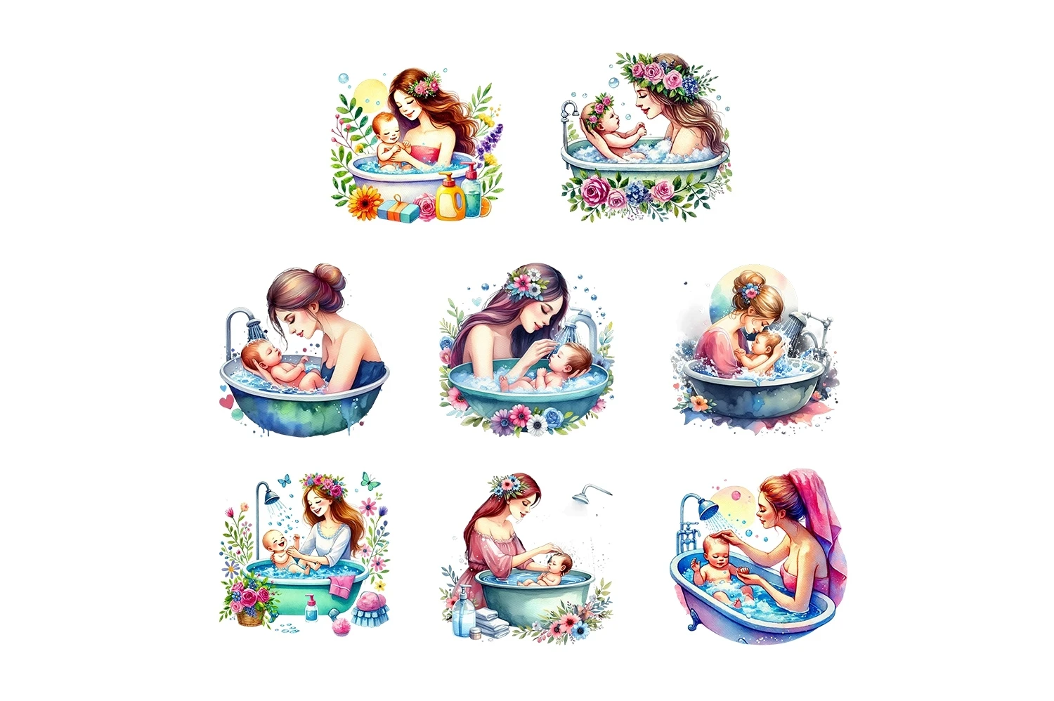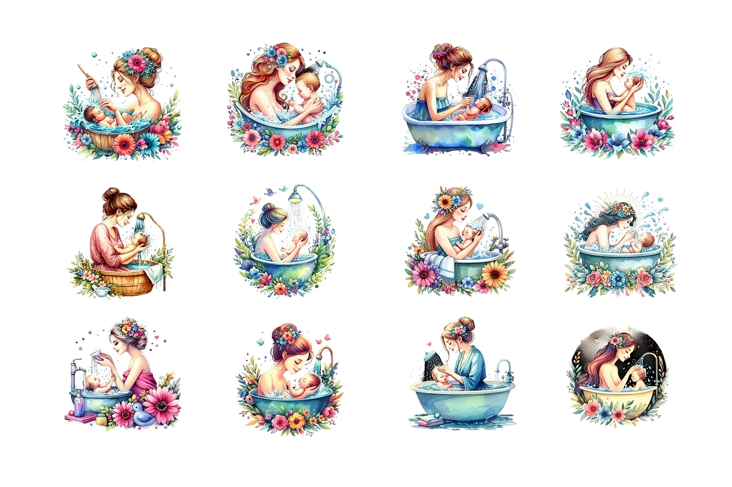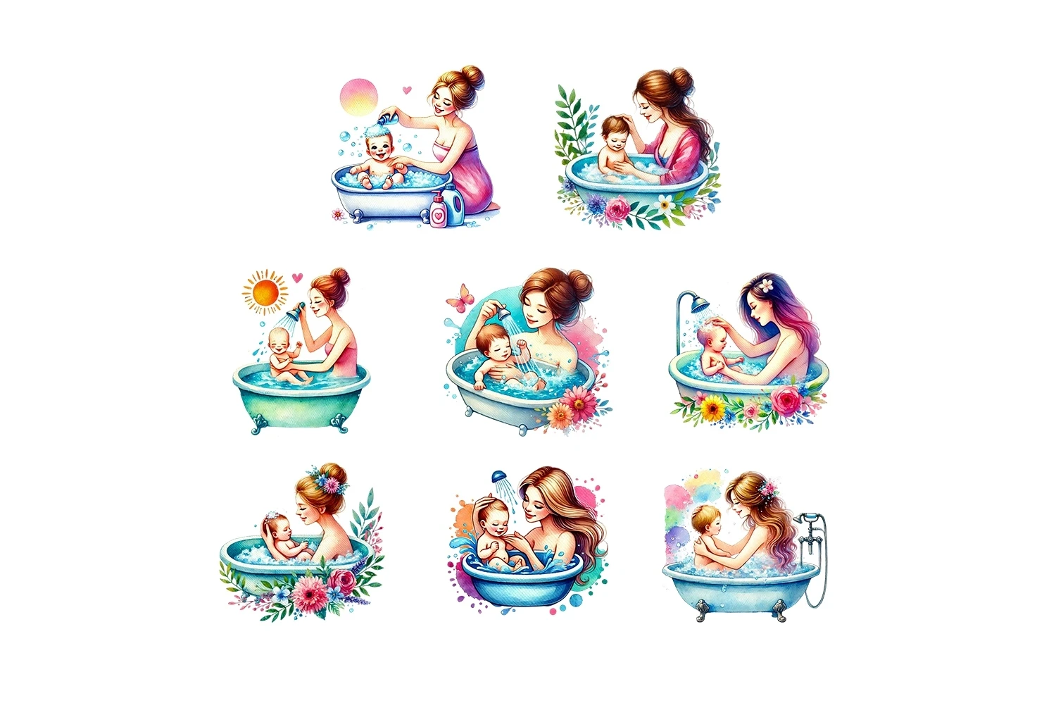 Watercolor Mother & Baby Bathing Clipart PNG (AI-generated).