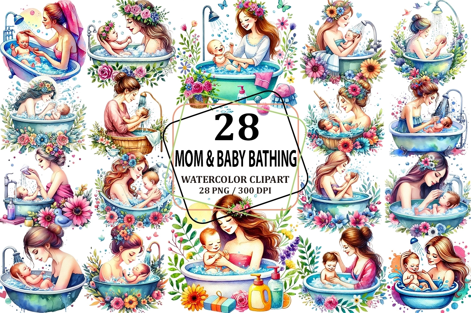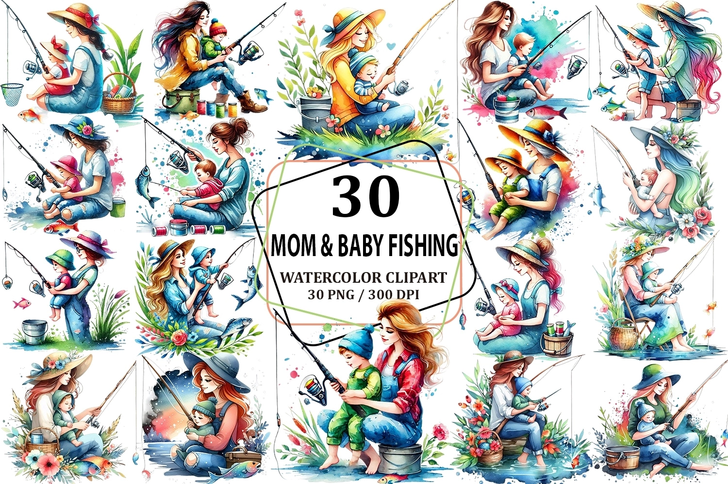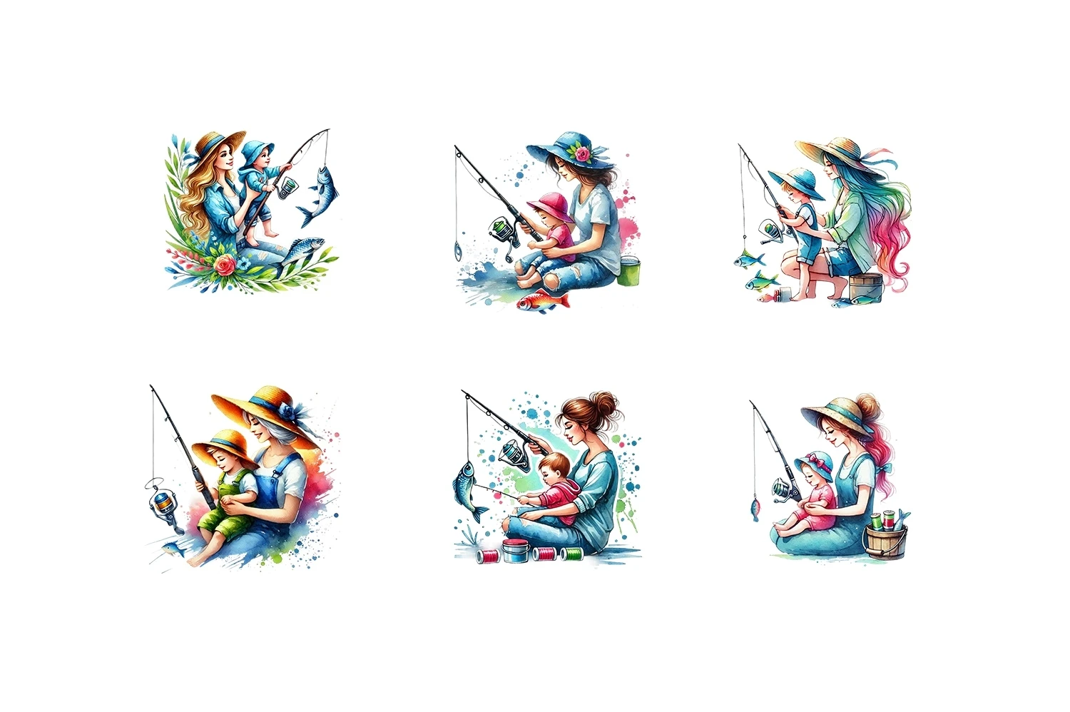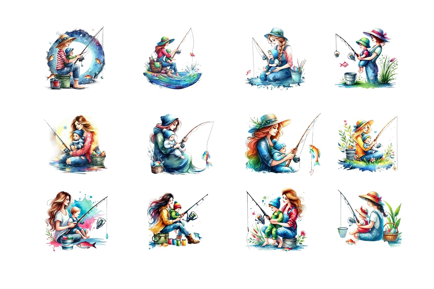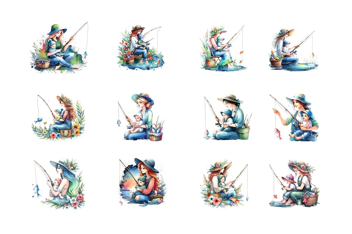 Watercolor Mother & Baby Fishing Mother's Day Clipart PNG (AI-generated).
