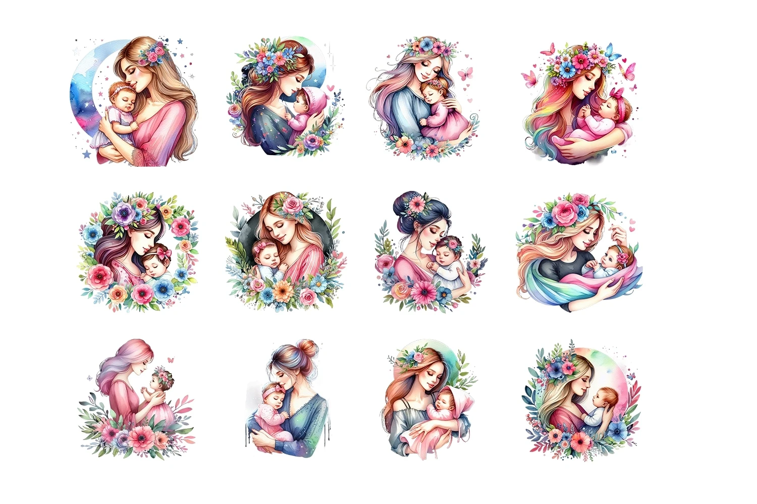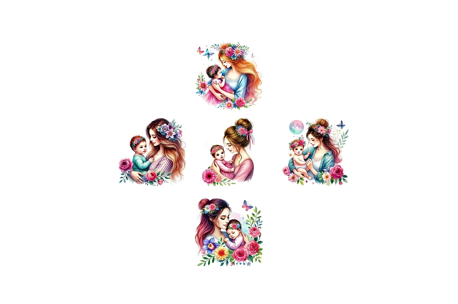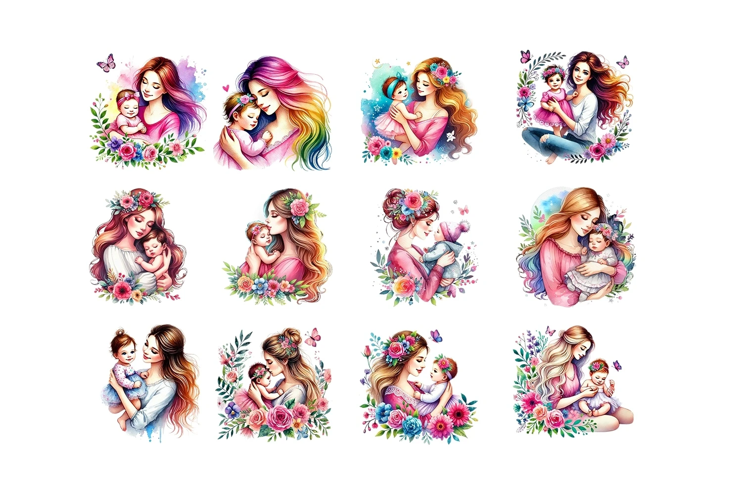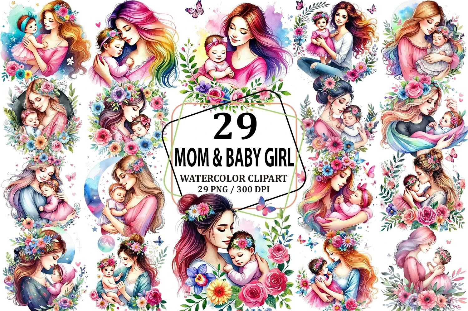 Watercolor Mother & Baby Girl Clipart PNG (AI-generated).