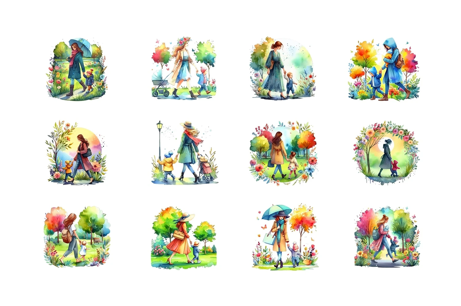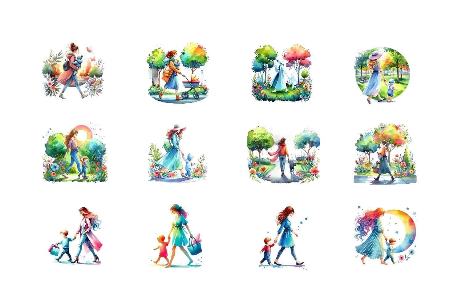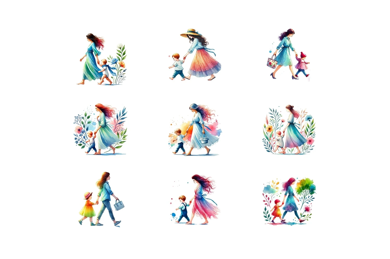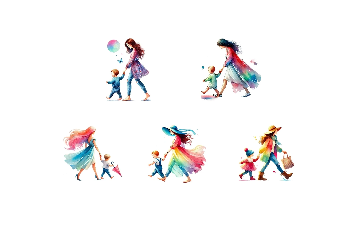 Watercolor Mother & Baby Walking Mother's Day Clipart PNG (AI-generated).