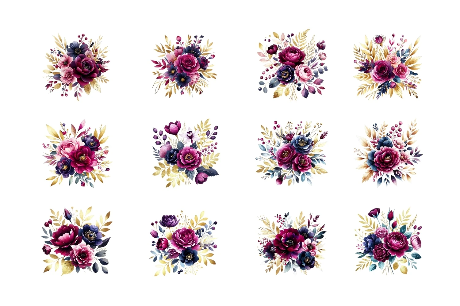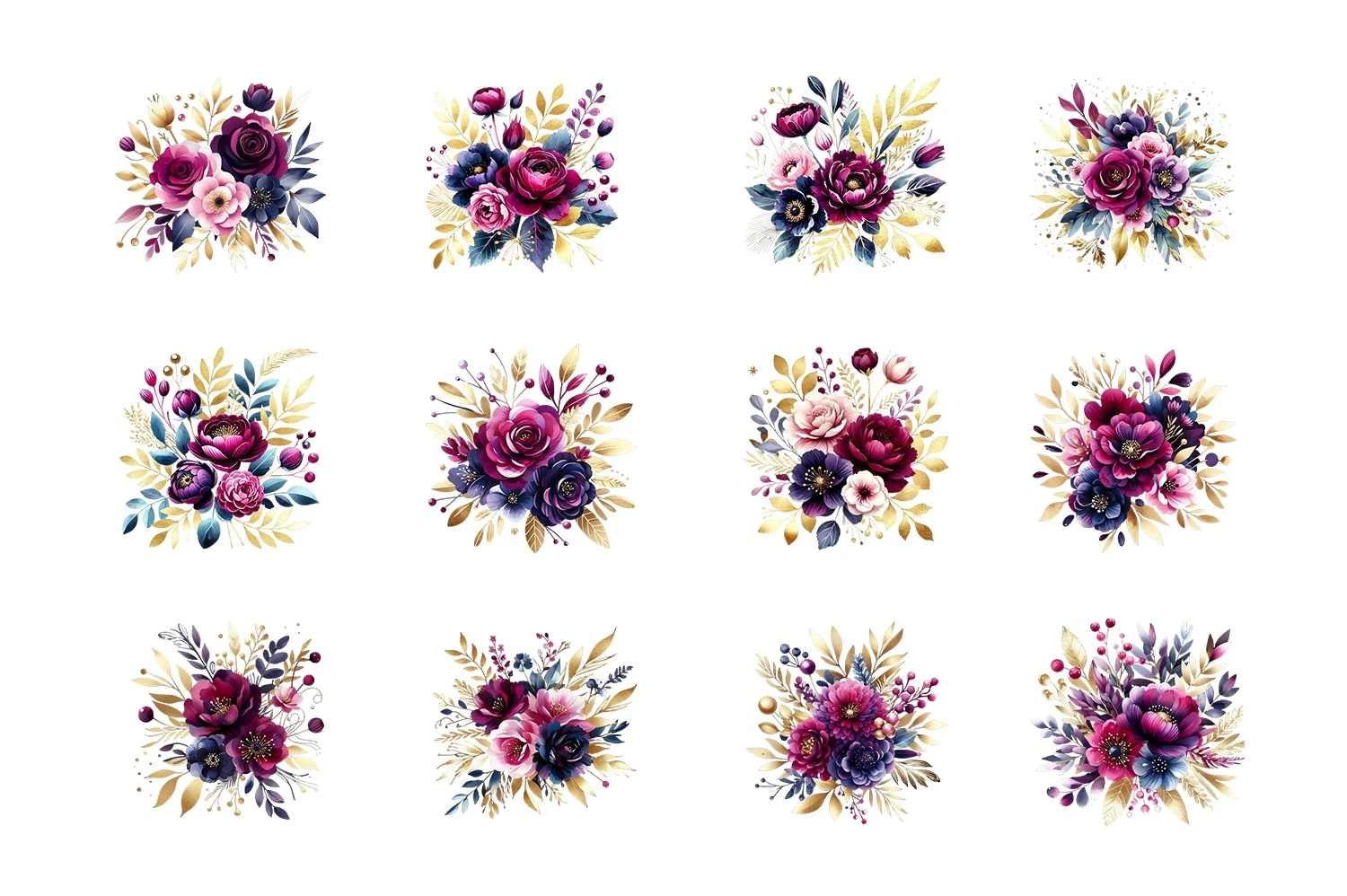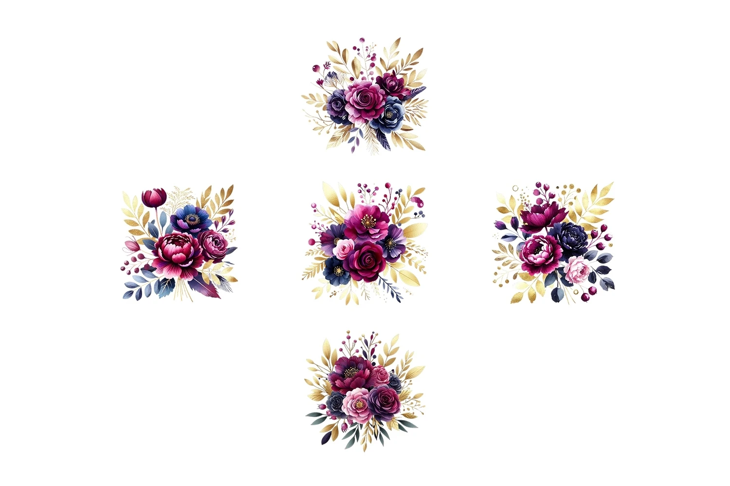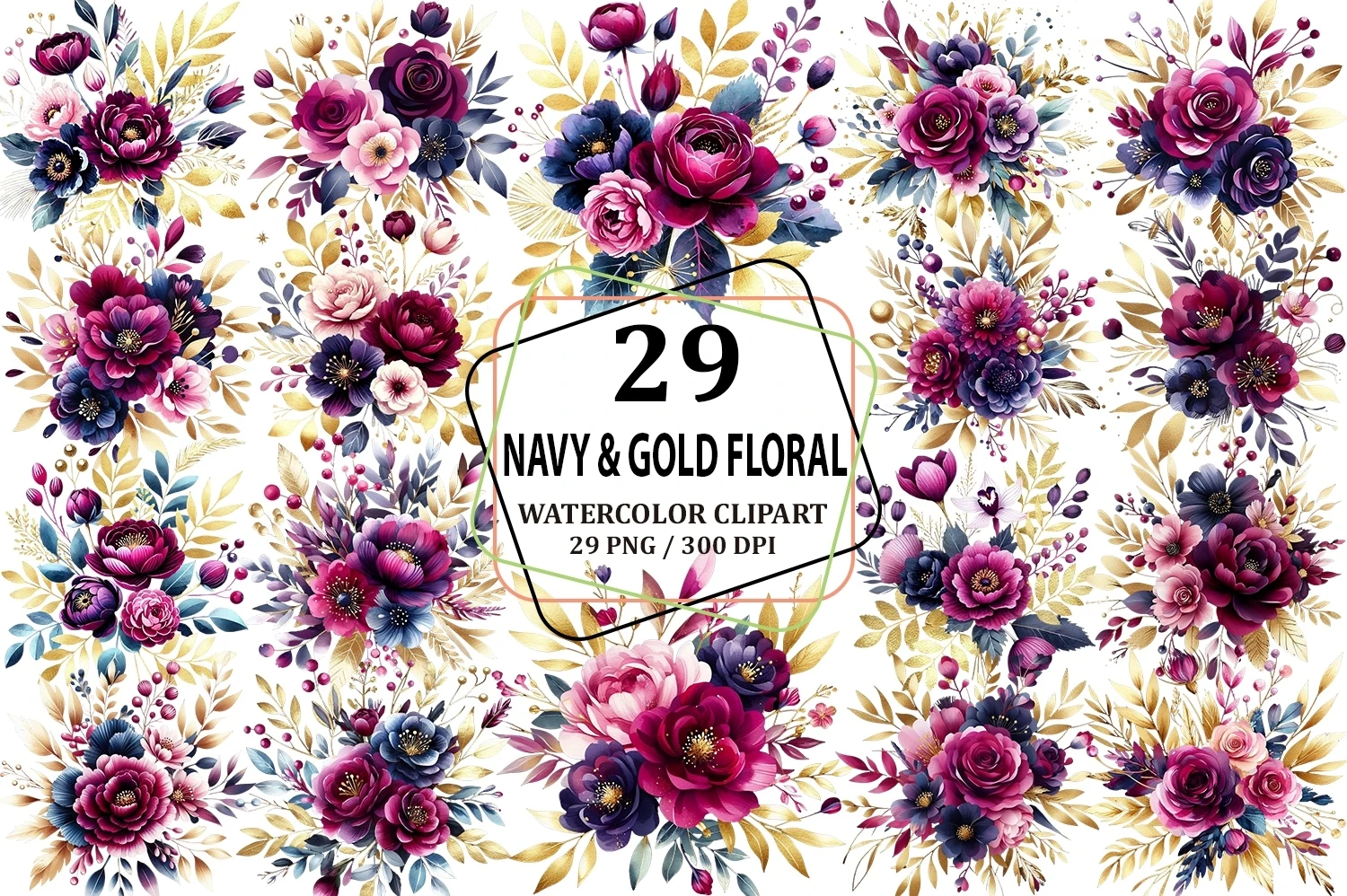 Watercolor Navy & Gold Florals Clipart PNG Sublimation (AI-generated).