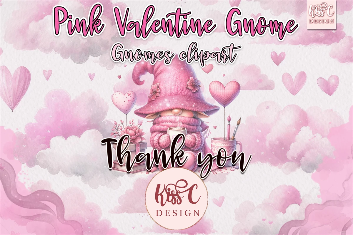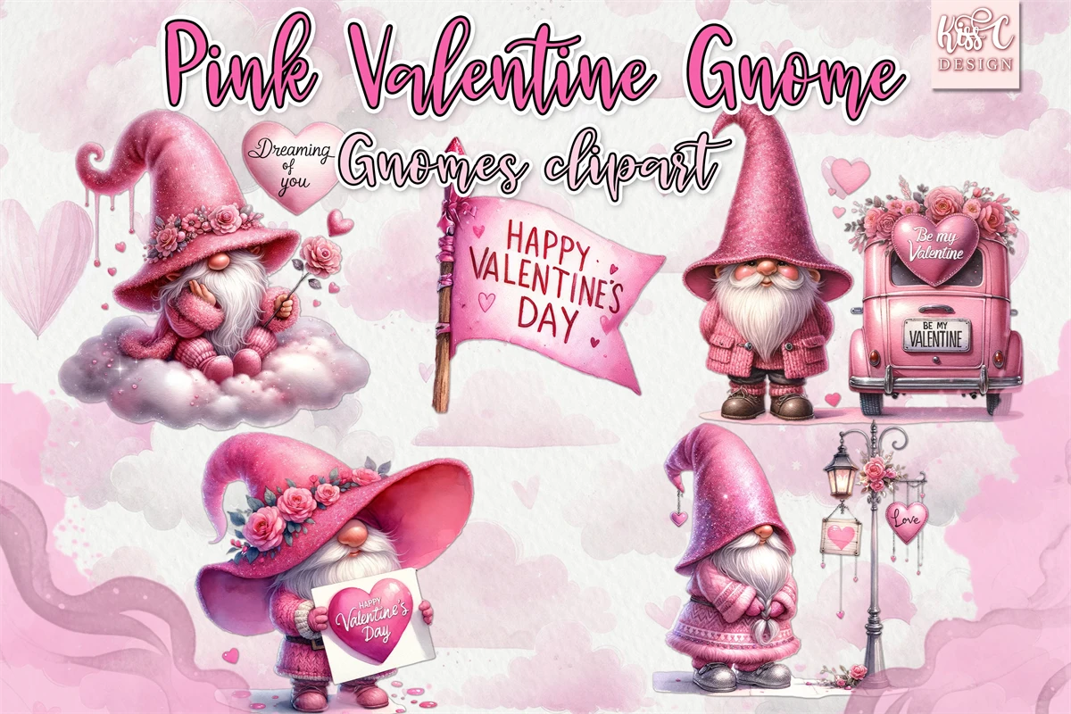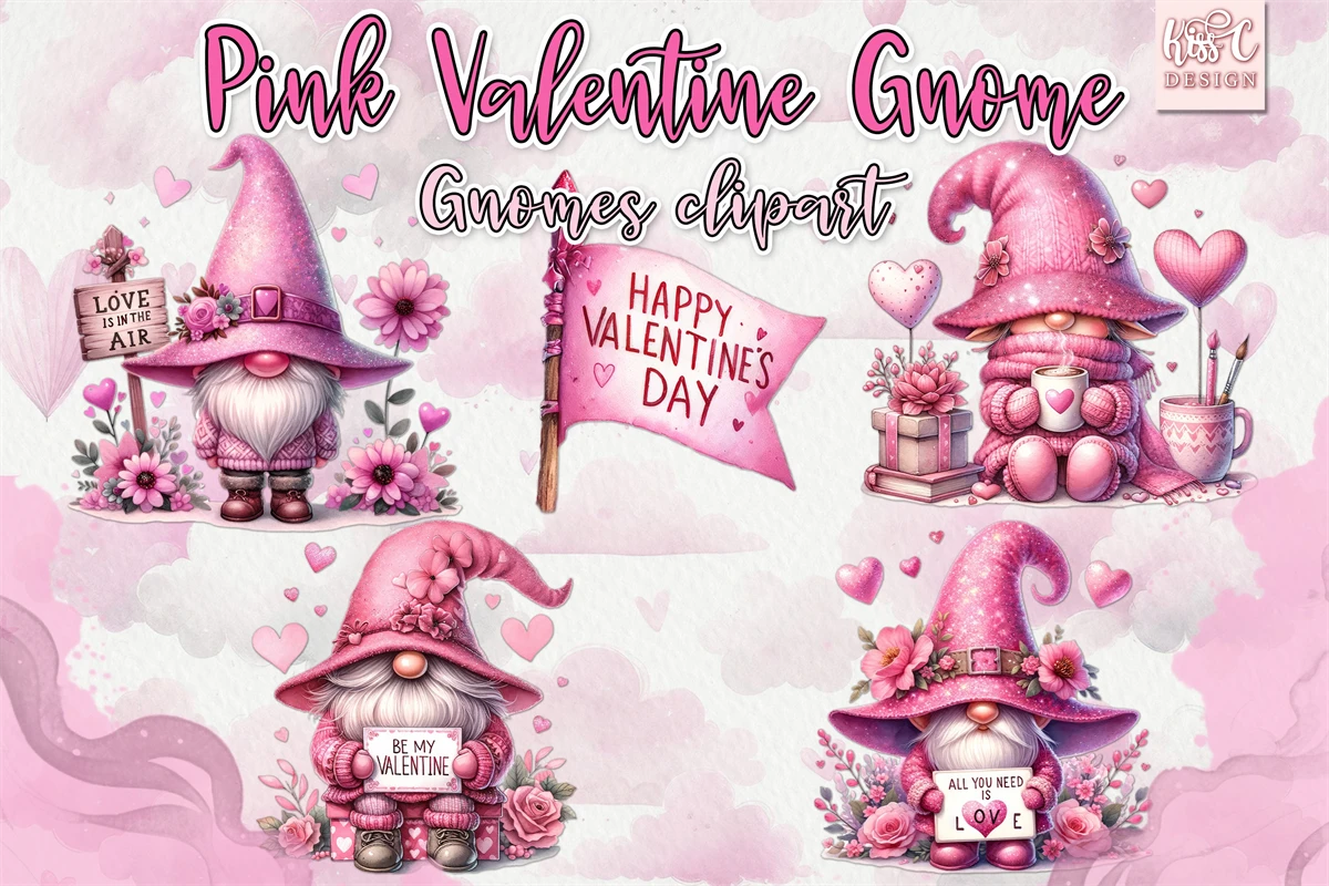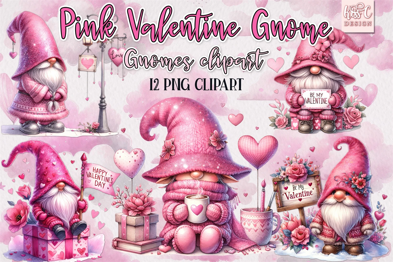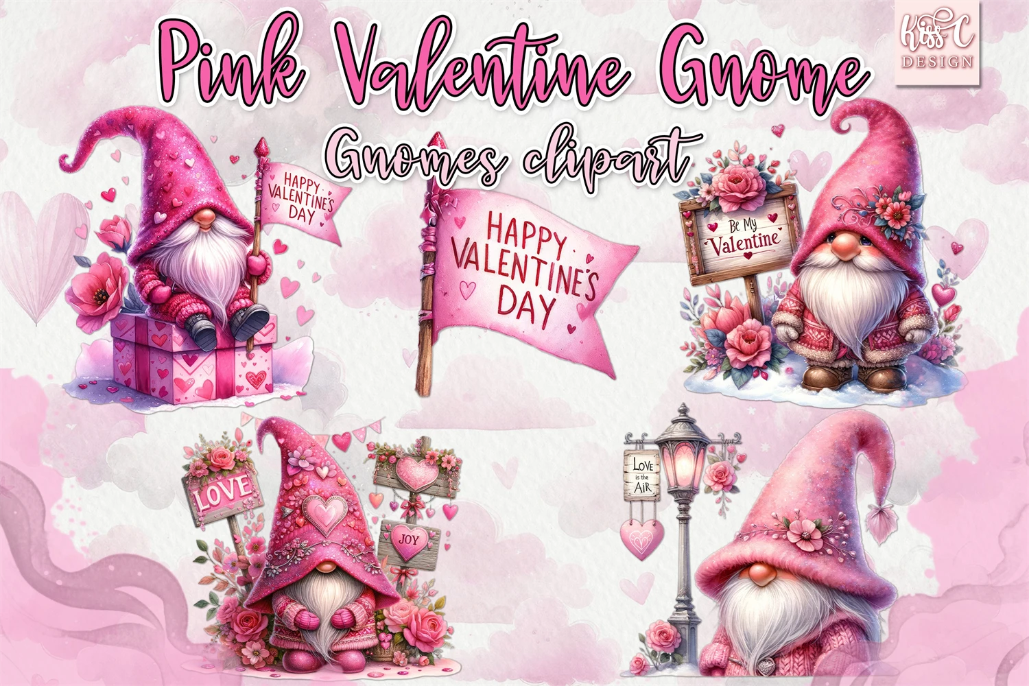Watercolor Pink Valentine Gnomes PNG Sublimation Clipart.