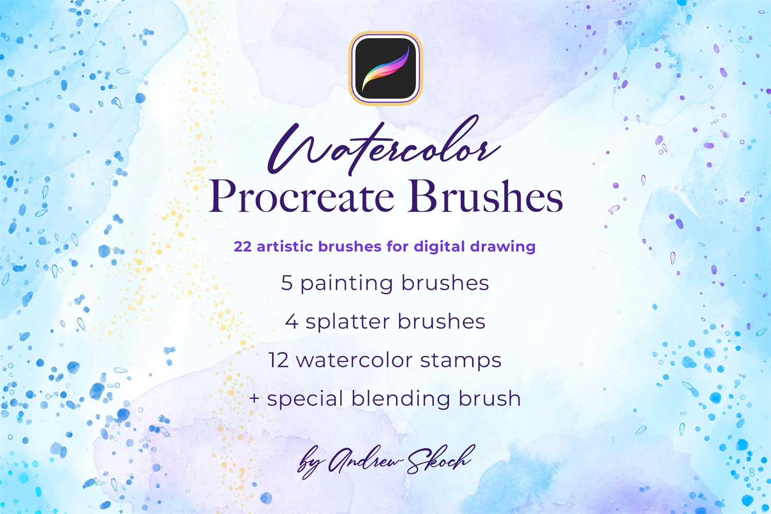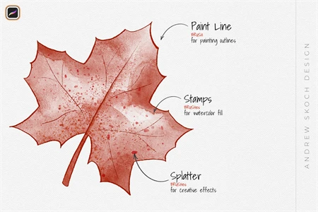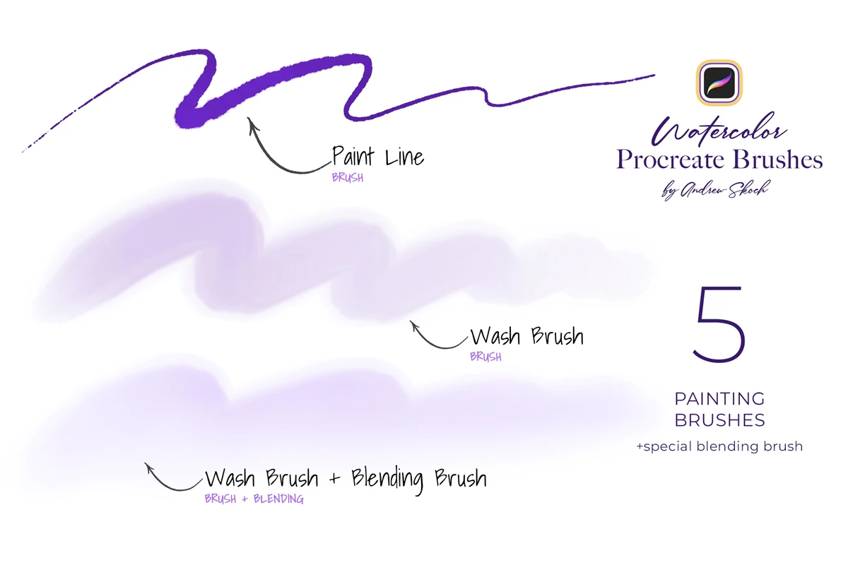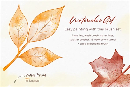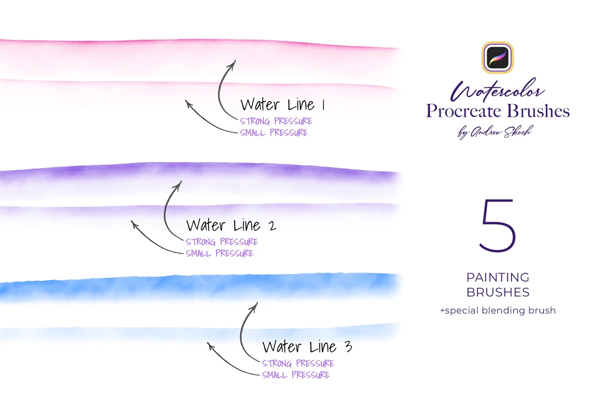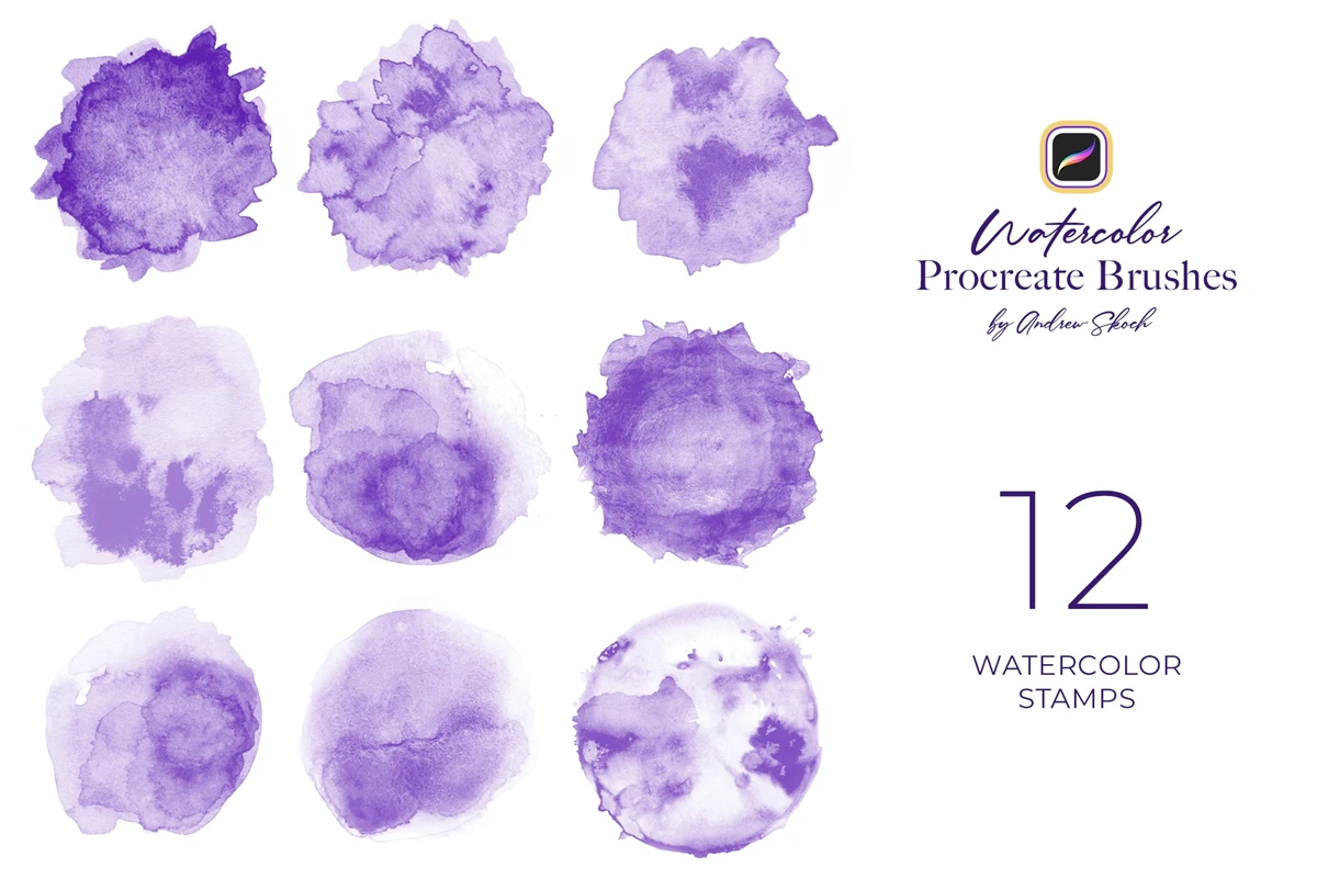 Get 22 brushes for procreate drawing. Easy to paint outlines with Paint Line brush. Easy to fill with Wash Brush. Easy to add watercolor drops with Splatter brushes. Easy to add water with special Blending Brush. Draw realistic watercolor lines with Water Lines brushes. And use ready watercolor stamps to save time!