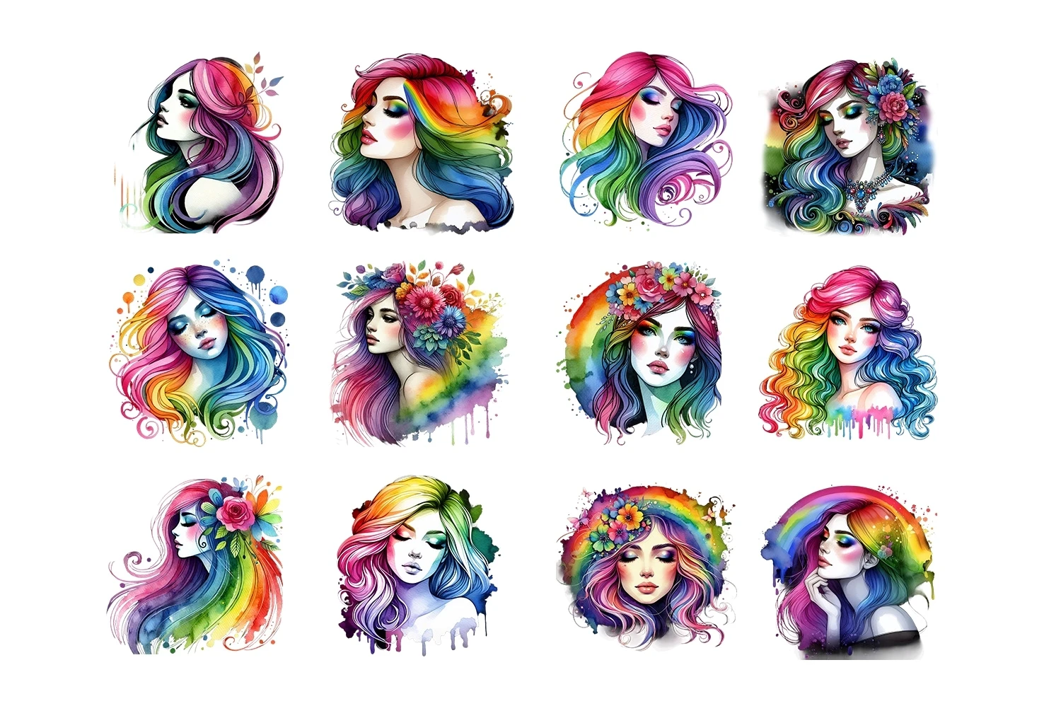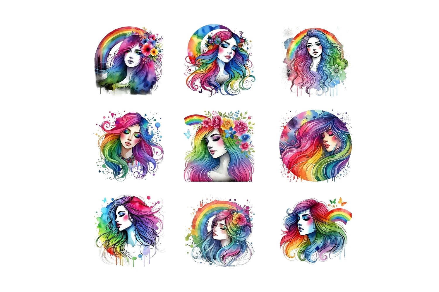 Watercolor Rainbow Colored Beautiful Girl Clipart PNG (AI-generated).