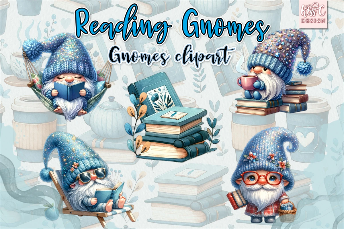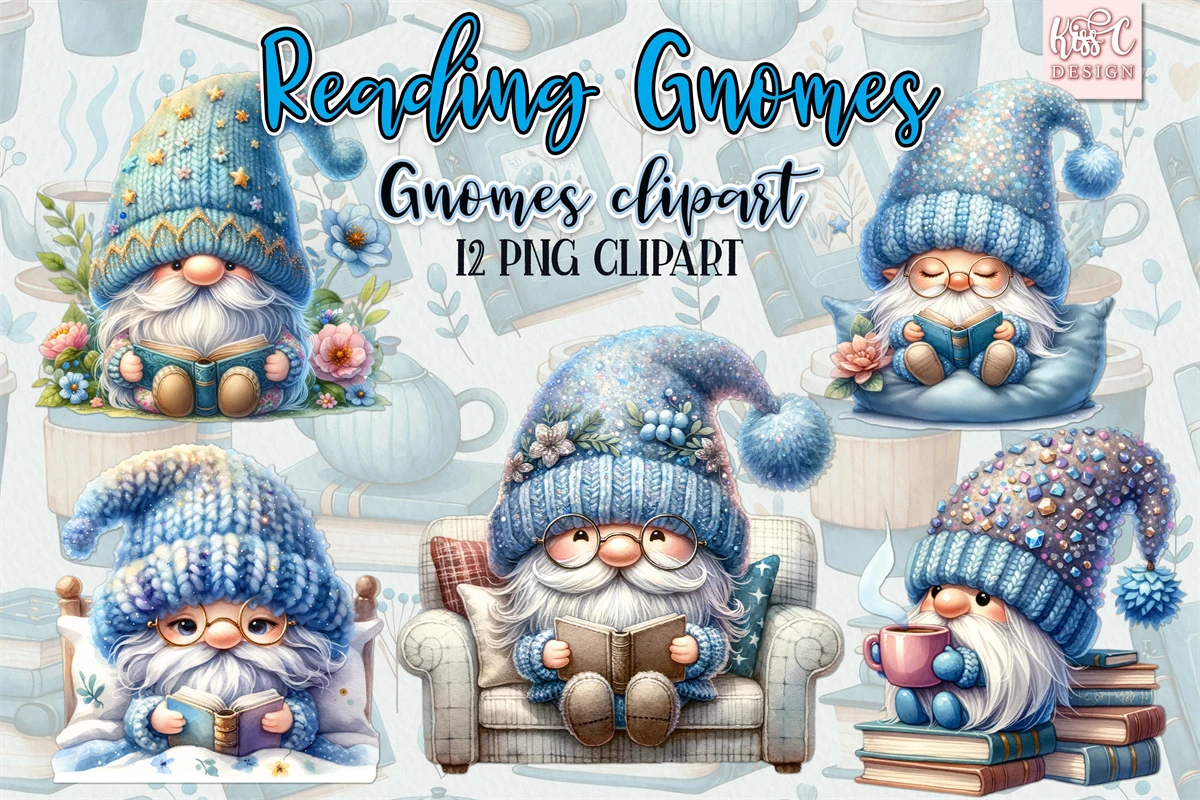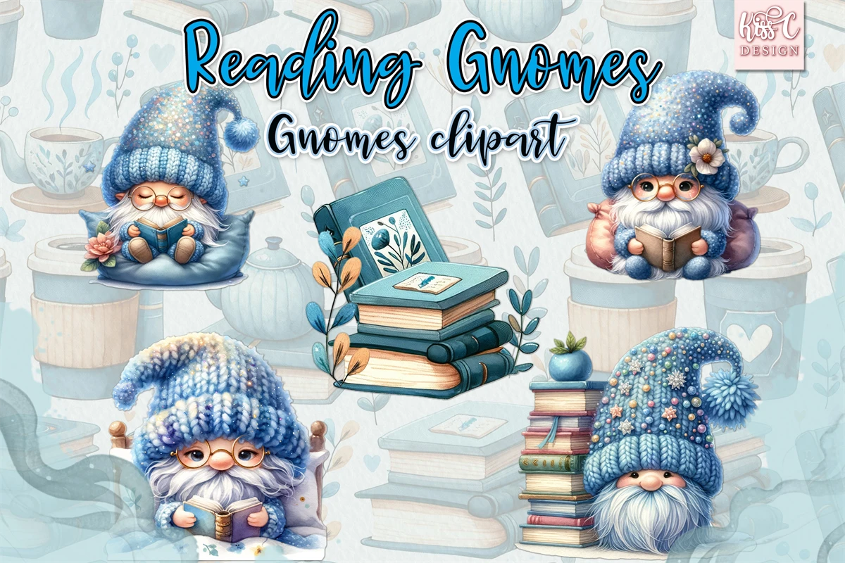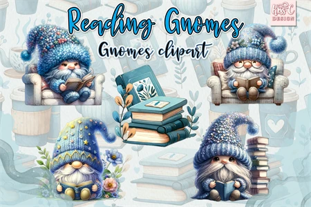 This delightful set includes 12 high-quality PNG watercolor illustrations featuring adorable gnome characters in serene reading poses, adorned with whimsical book lover-inspired details.
