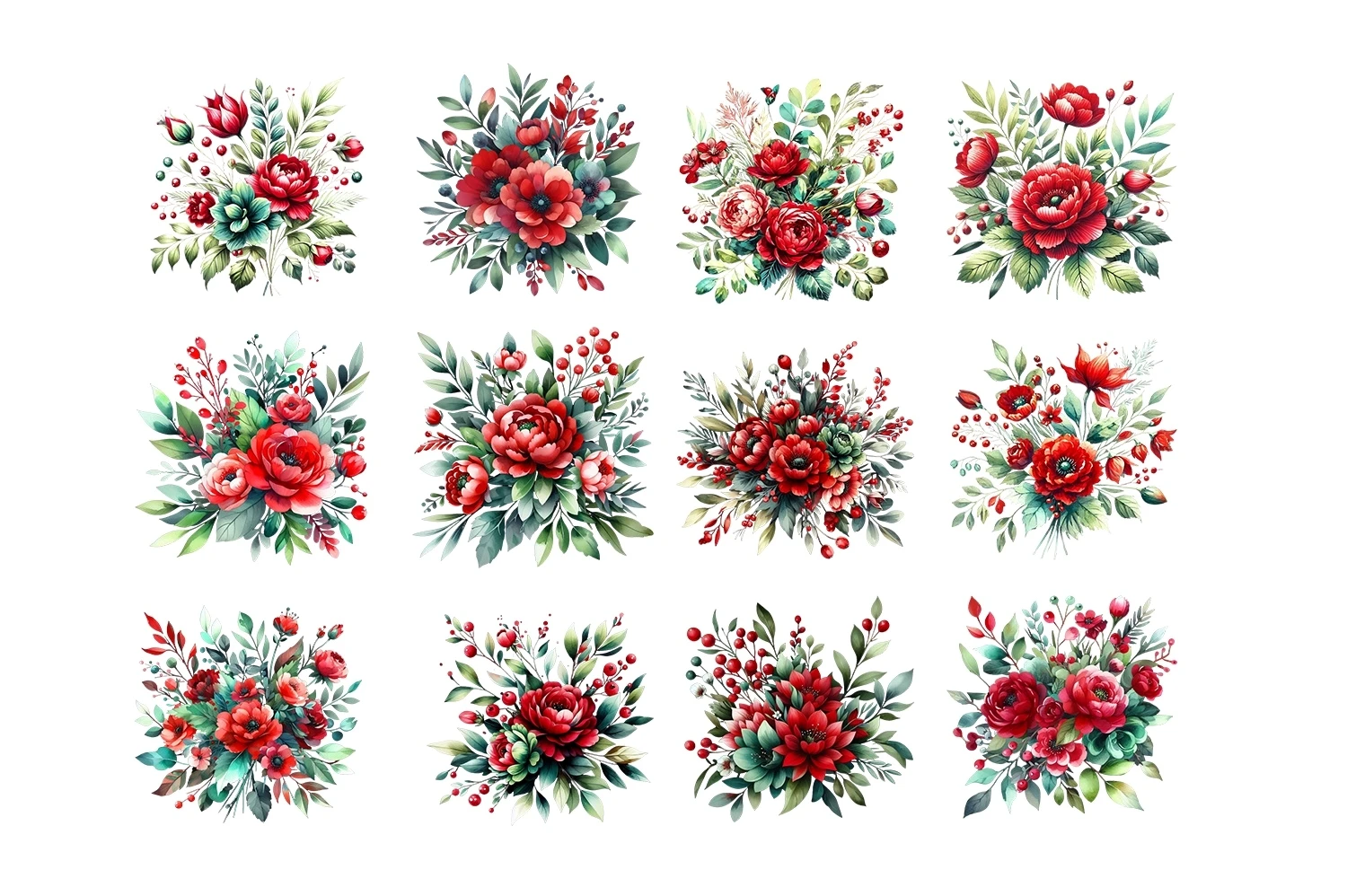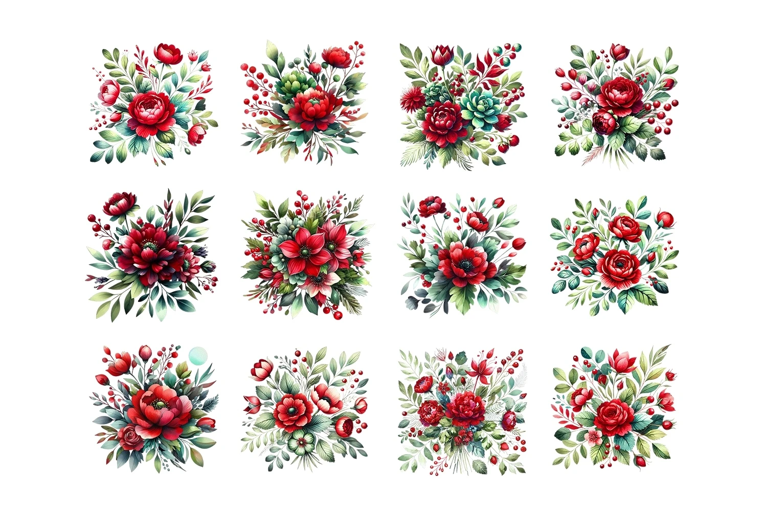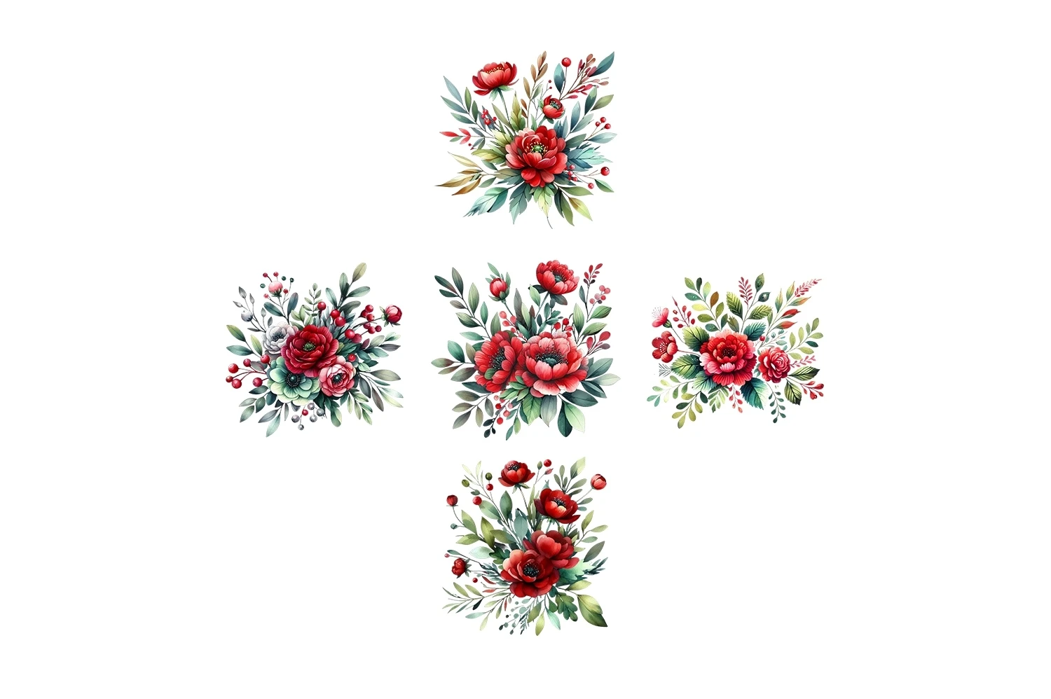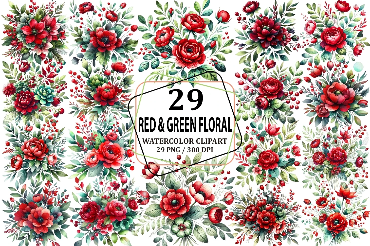 Watercolor Red & Green Floral Clipart Sublimation PNG (AI-generated).
