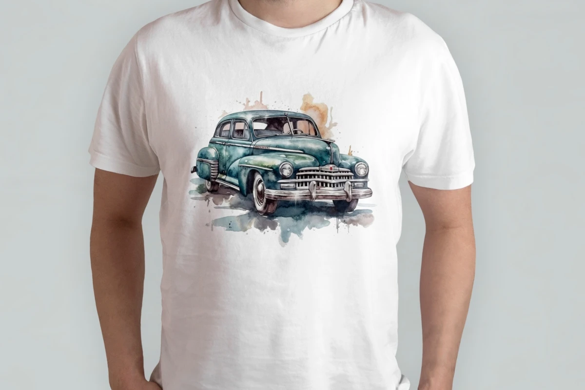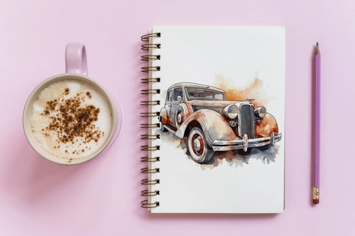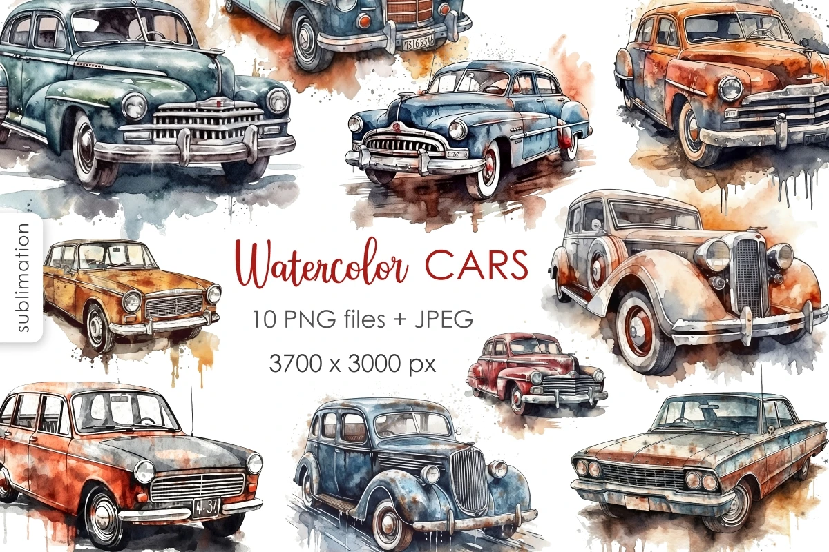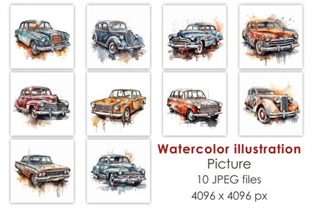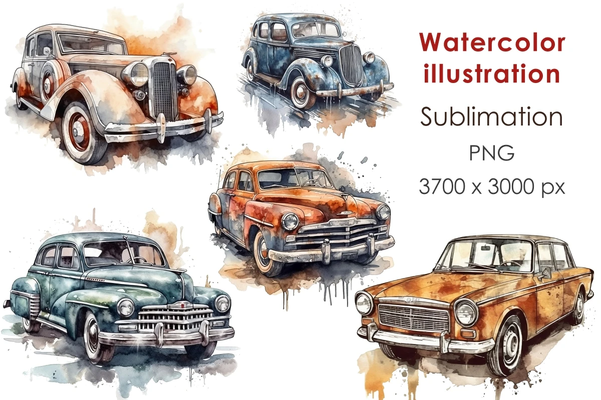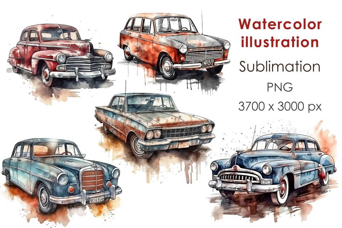 Collection of watercolor retro cars in sketch style. Cute hand draw illustrations with different machines for making prints, sublimations, stickers, covers, patterns. Use these images to print on t-shirts, mugs, bags, paintings, posters.