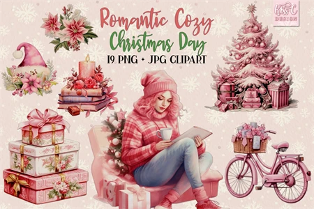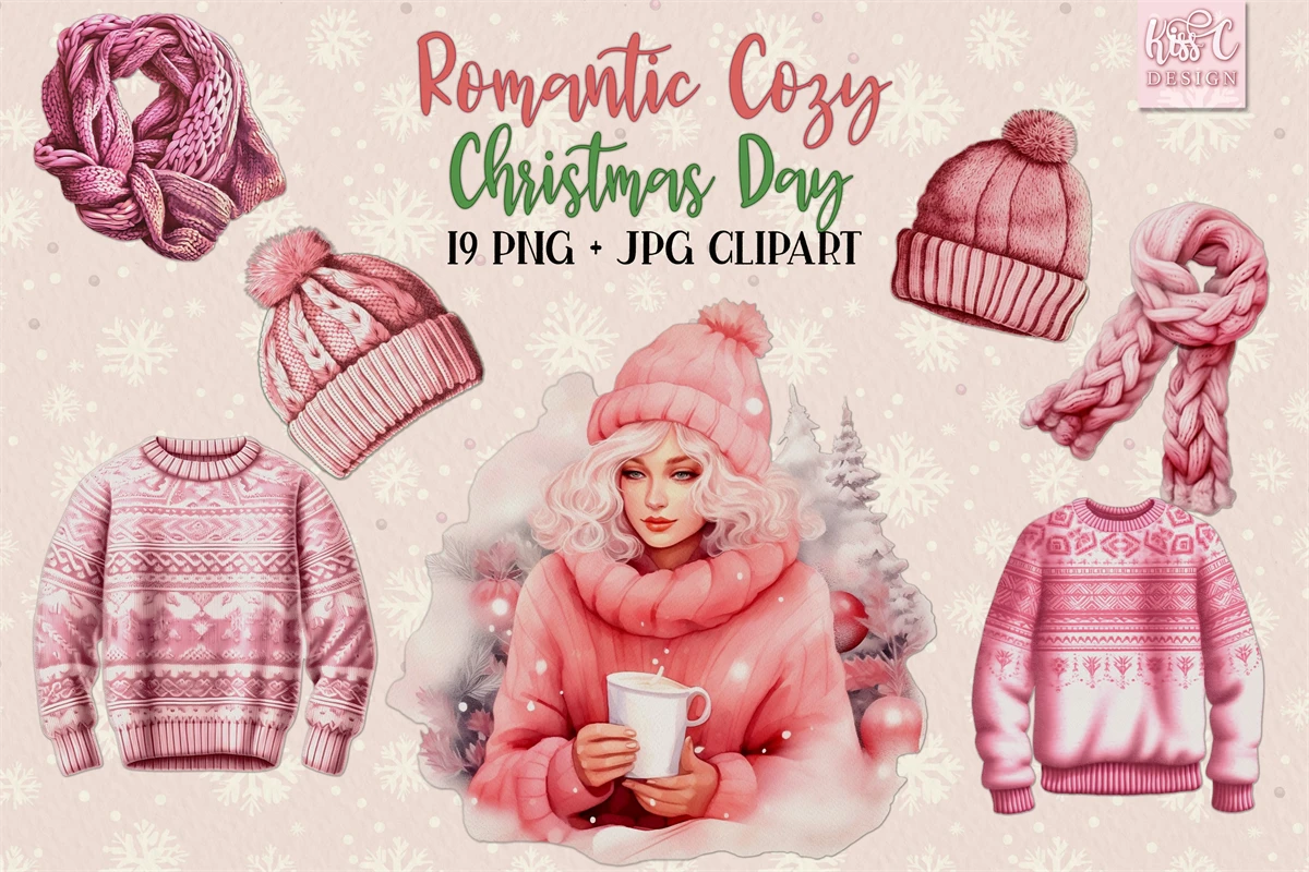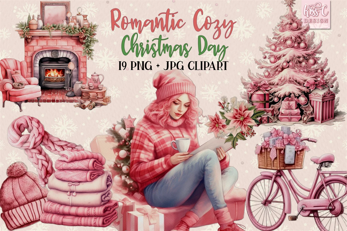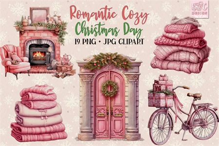 Watercolor Romantic Cozy Christmas Pink Illustration Clipart.