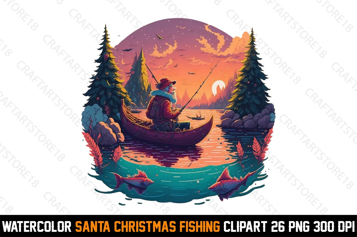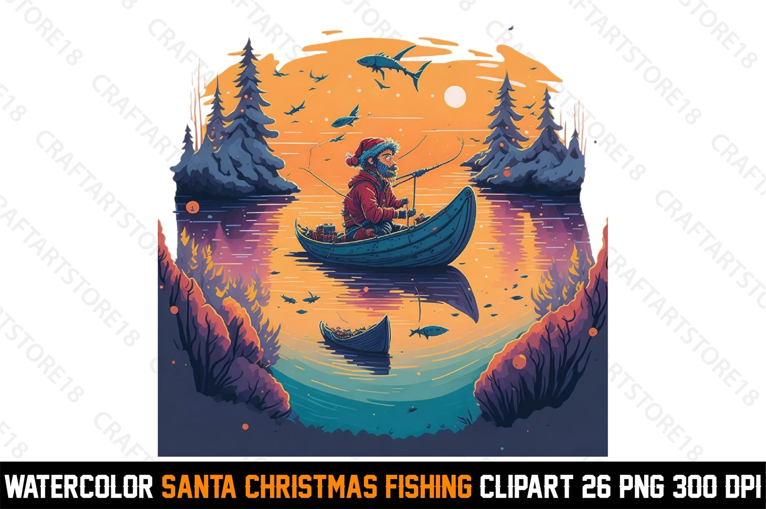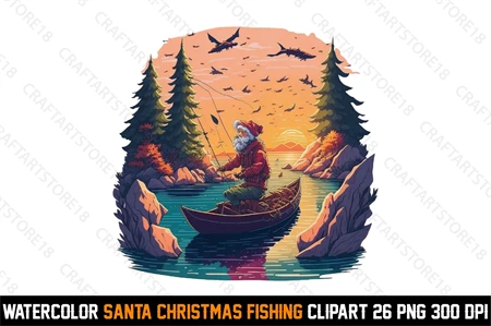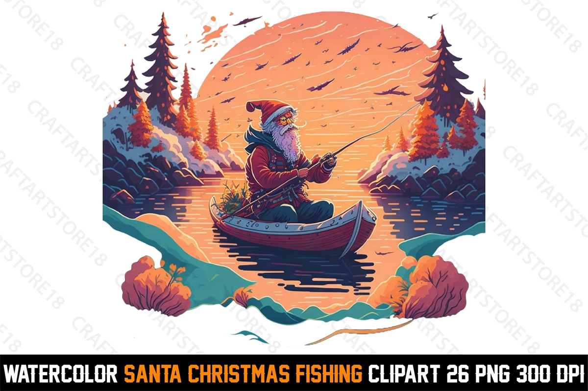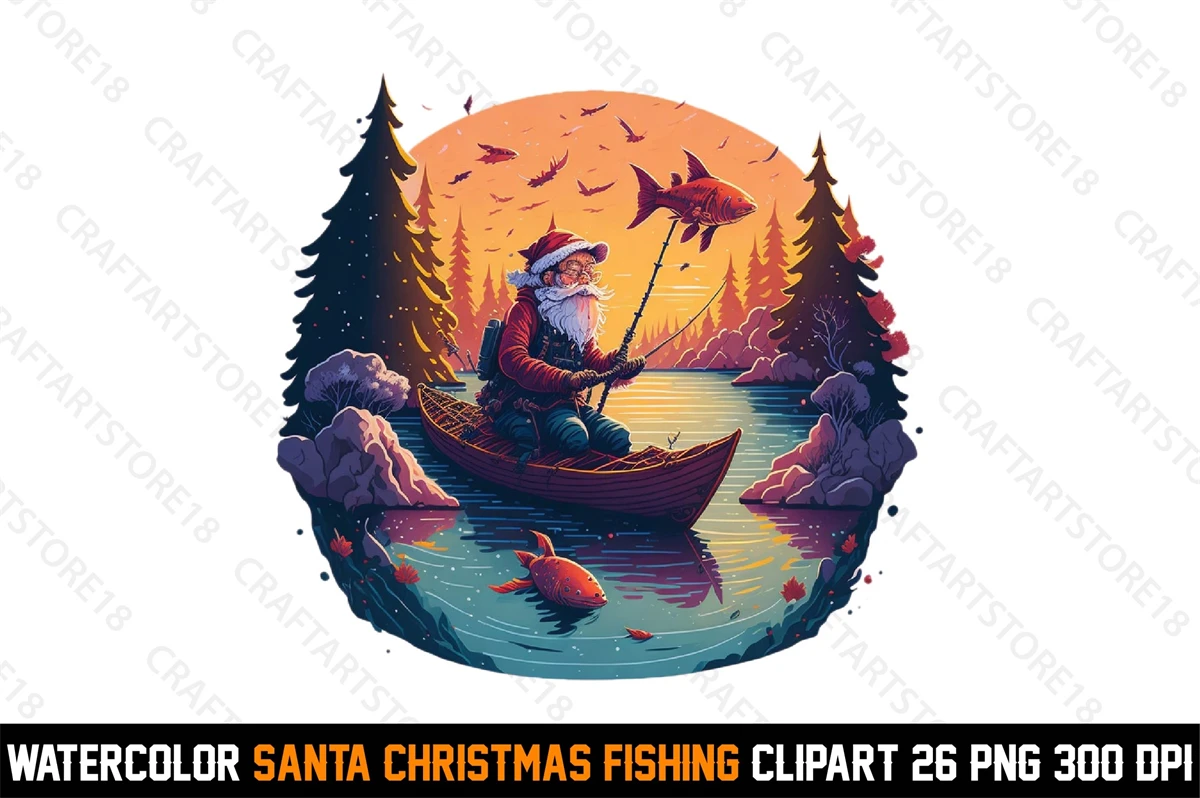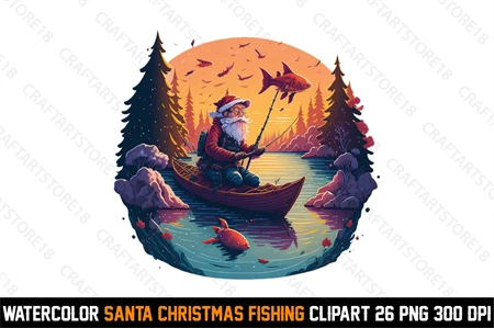 Watercolor Watercolor Santa Christmas Fishing Clipart Clipart T-Shirt Design Bundle digital download cutting file for Cricut And Silhouette