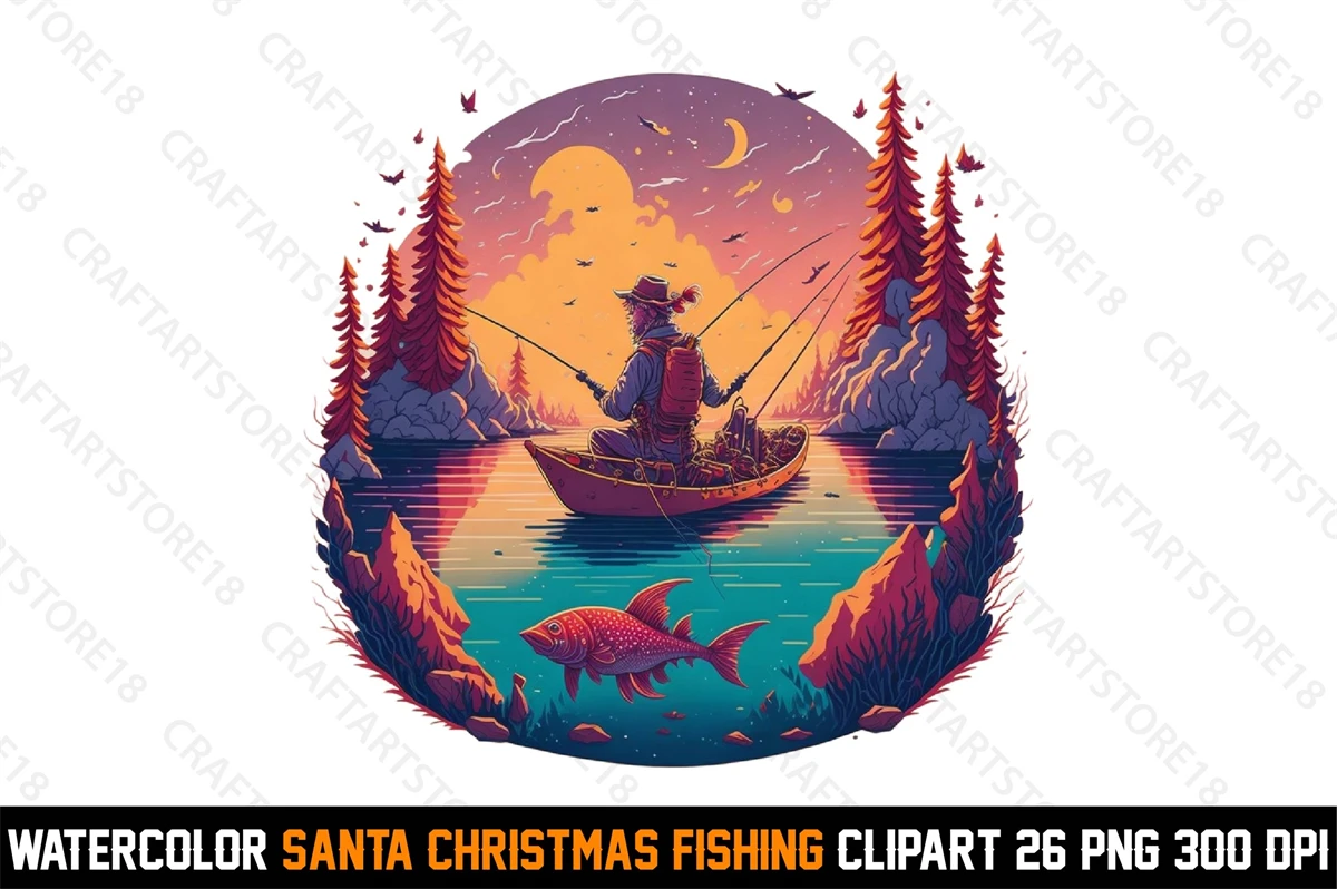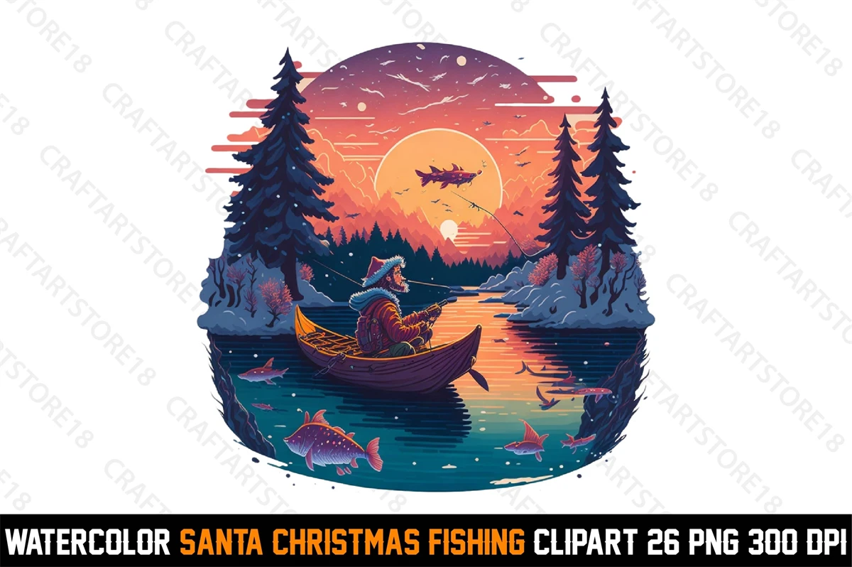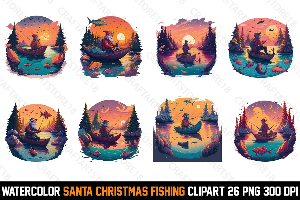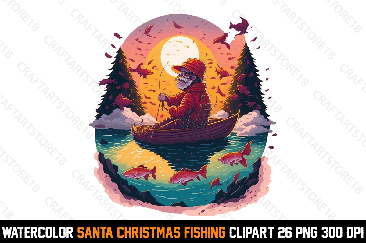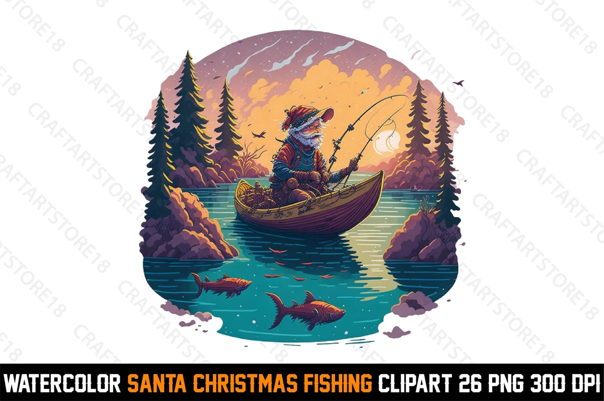 Watercolor Watercolor Santa Christmas Fishing Clipart Clipart T-Shirt Design Bundle digital download cutting file for Cricut And Silhouette