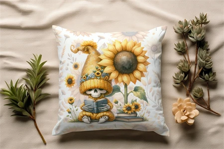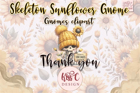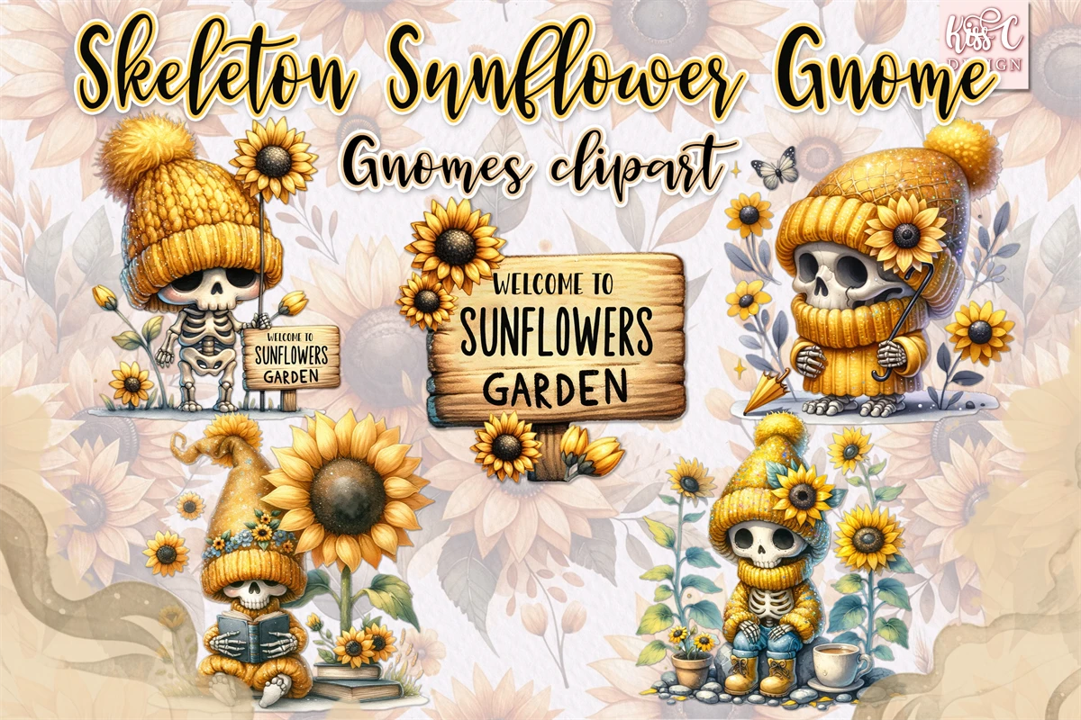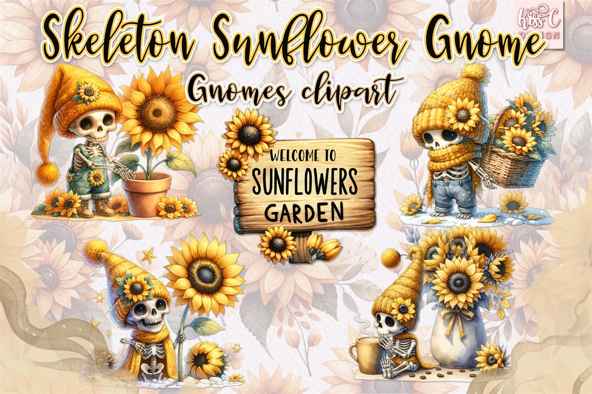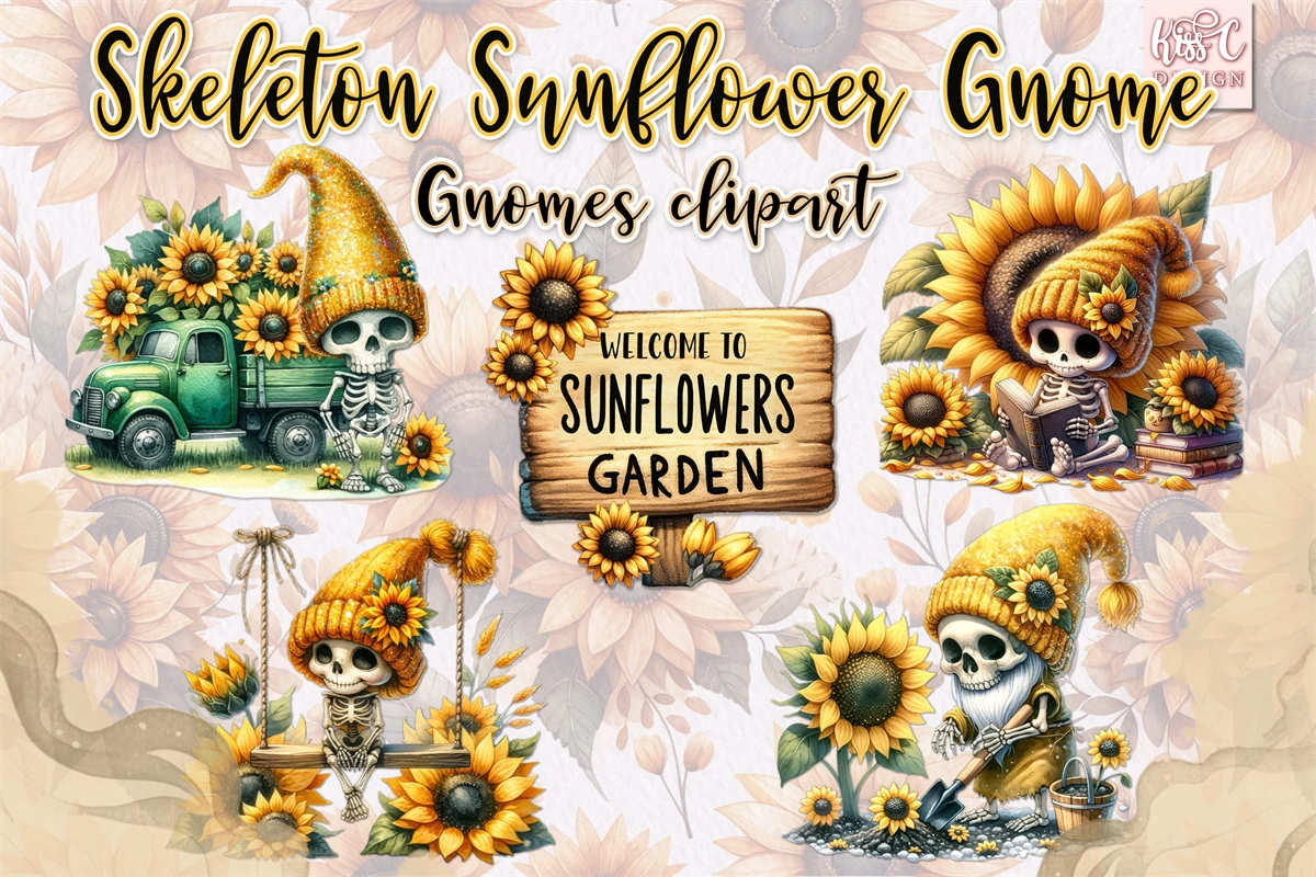 Skeleton Sunflower Gnomes Illustration Clipart.
