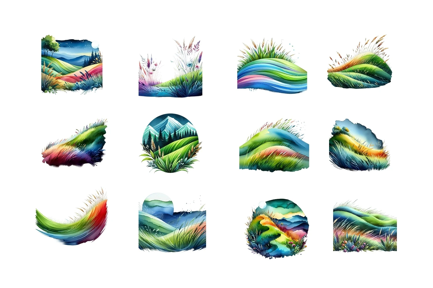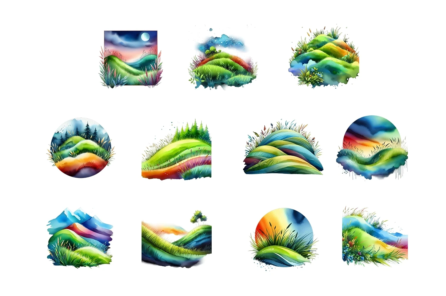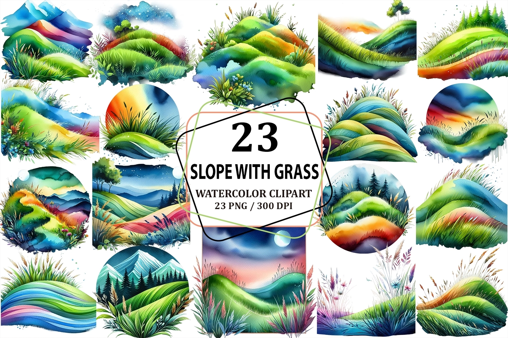 Watercolor Slope with Grass Clipart Sublimation PNG (AI-generated).