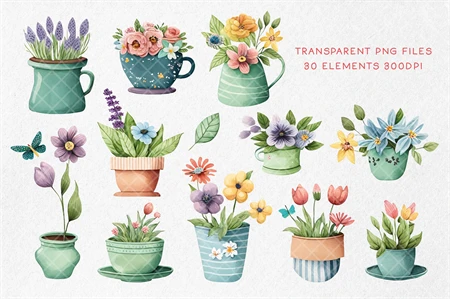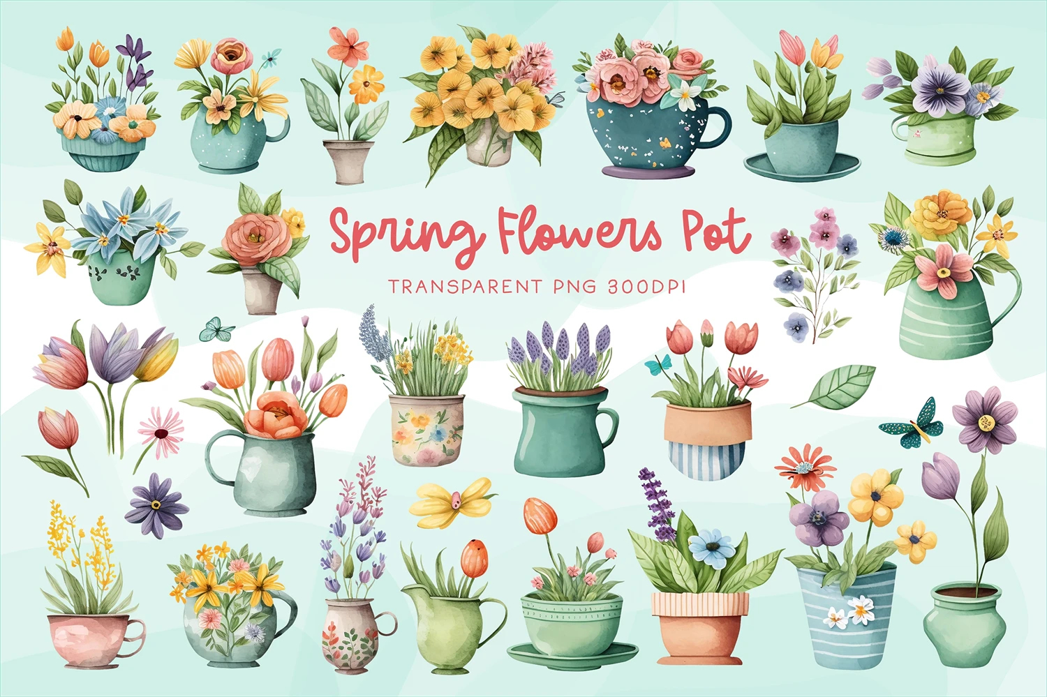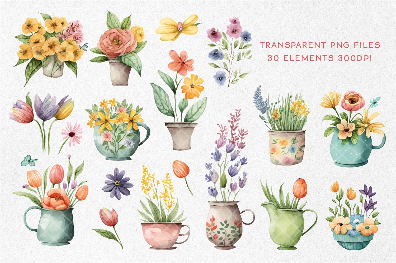 Watercolor Spring Planters Clipart, Spring Flowers Pots, Farmhouse spring clipart, Plant pots, Watercolor Flower Pot. All elements are high-resolution (300dpi) PNG files with transparent backgrounds.