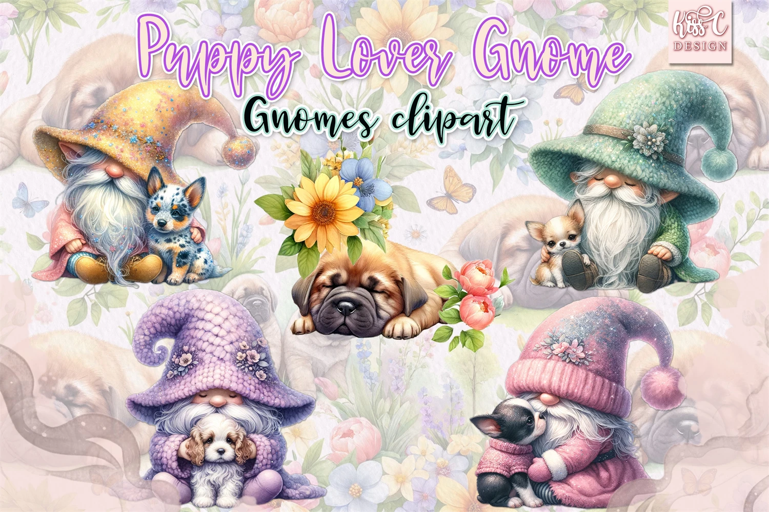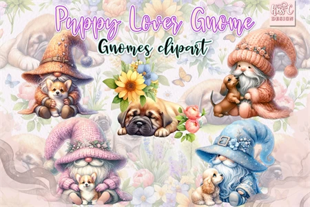 This delightful set includes 12 high-quality PNG watercolor images featuring adorable gnome characters with adorable puppy in spring-themed.
