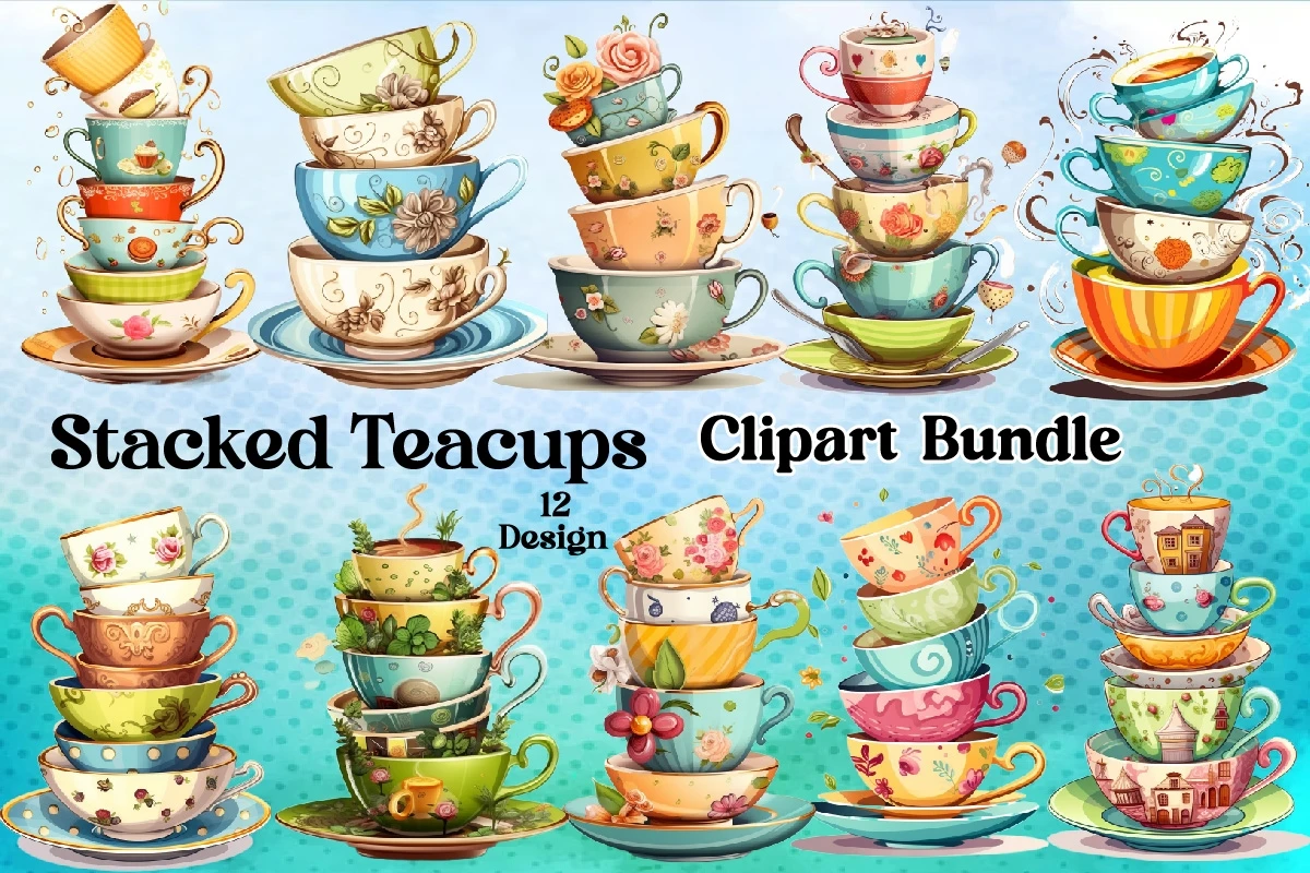 Watercolor Stacked Teacups PNG Sublimation Bundle