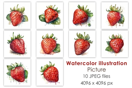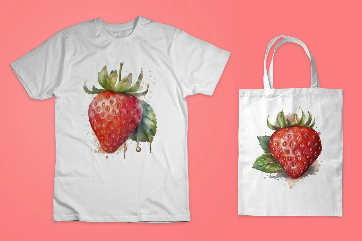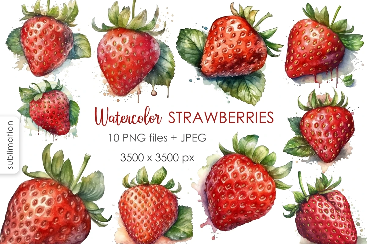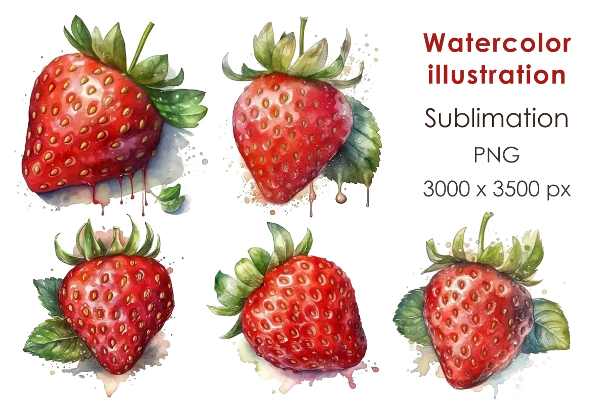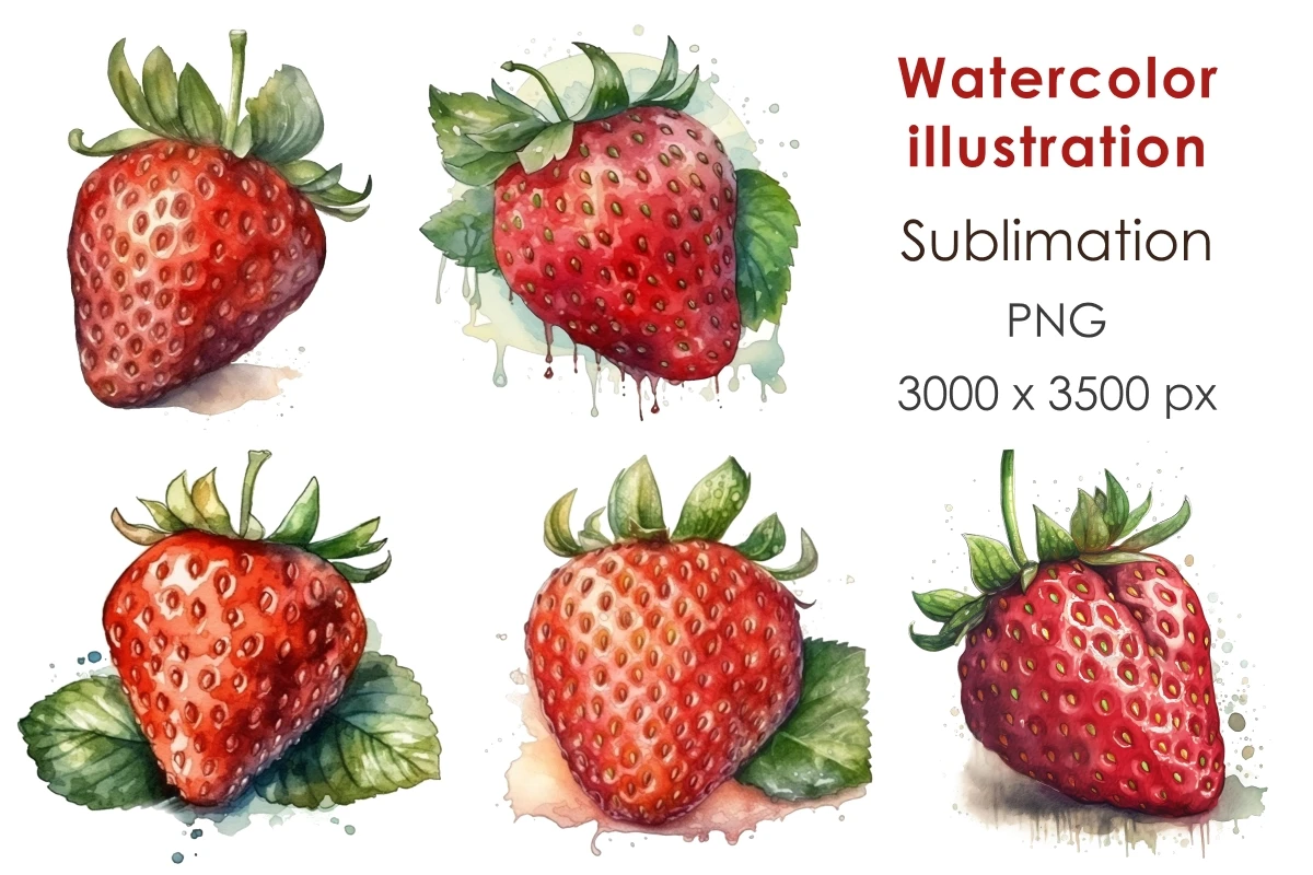 Collection of watercolor strawberries in sketch style. Cute hand draw illustrations with strawberries for creating prints, sublimations, stickers, covers, patterns. Use these images to print on t-shirts, mugs, bags, paintings, posters.