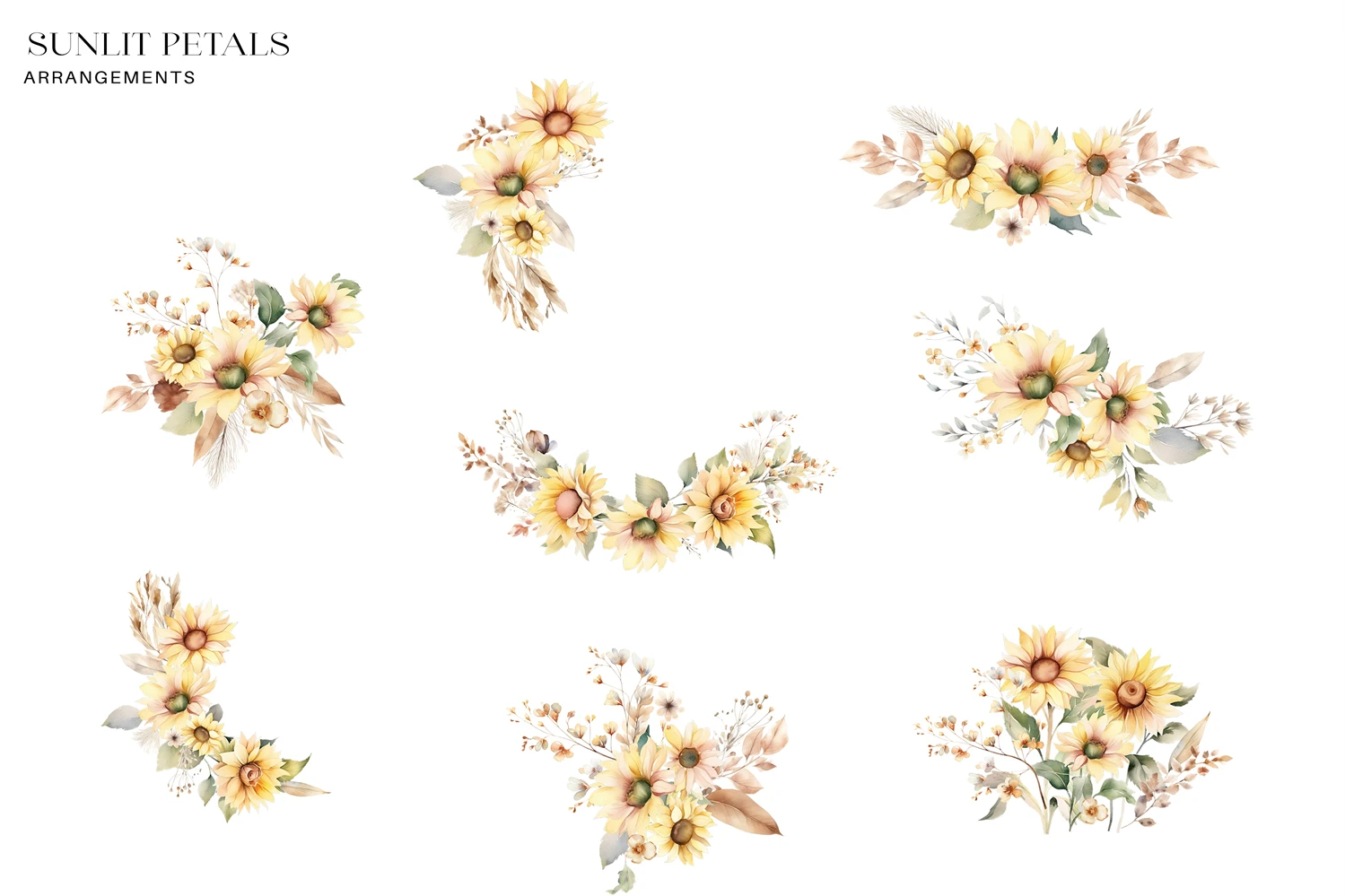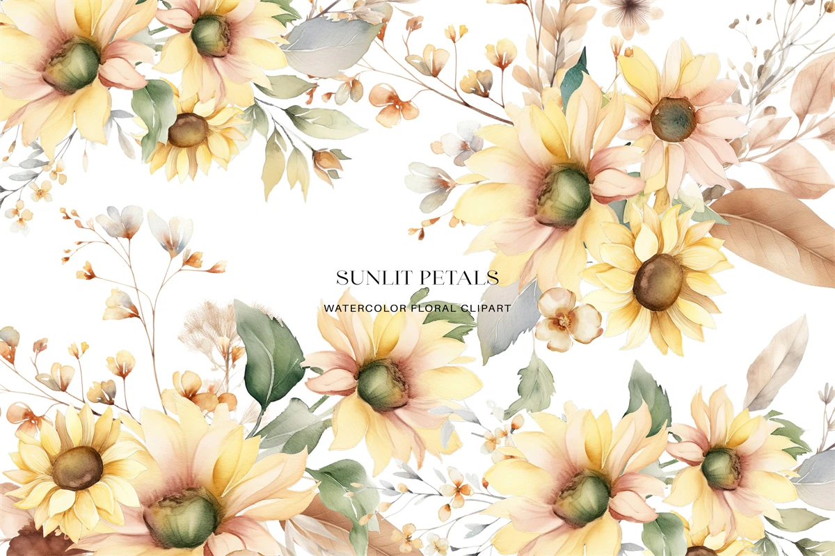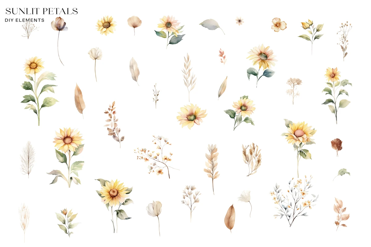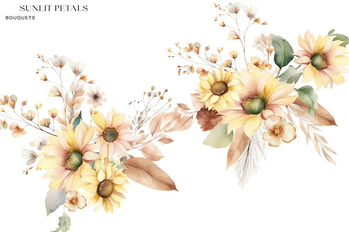 Experience the radiant charm of summer with our exquisite Watercolor Sunflower Clipart Set! This set features a collection of hand-painted sunflower illustrations in vibrant watercolor hues. From budding sunflower buds to fully bloomed blossoms, these whimsical creations are perfect for adding a touch of nature's warmth to your designs. Use them for greeting cards, invitations, posters, and more to infuse your projects with the golden glow of sun-kissed petals. Let these sunflowers brighten your day and your artistic endeavors!