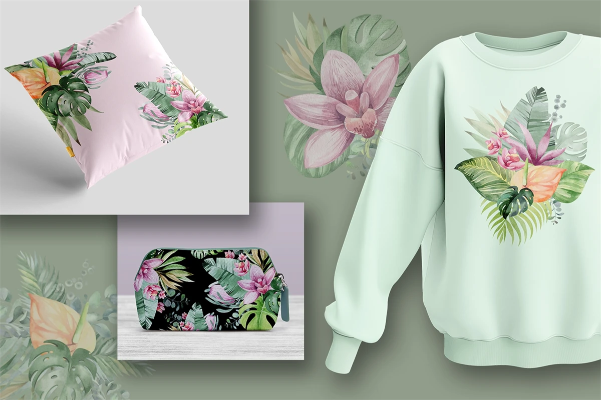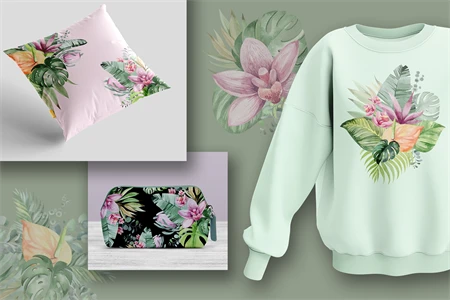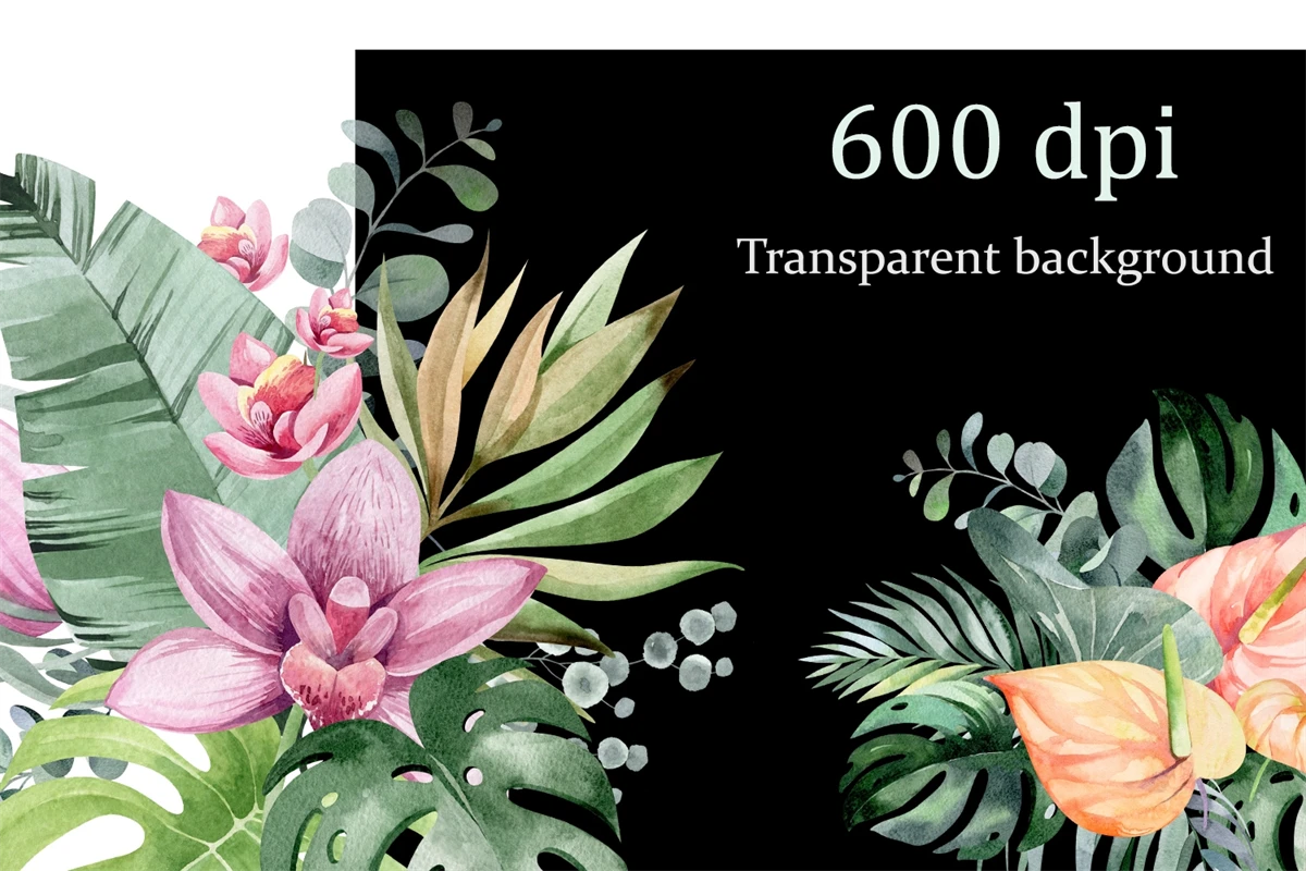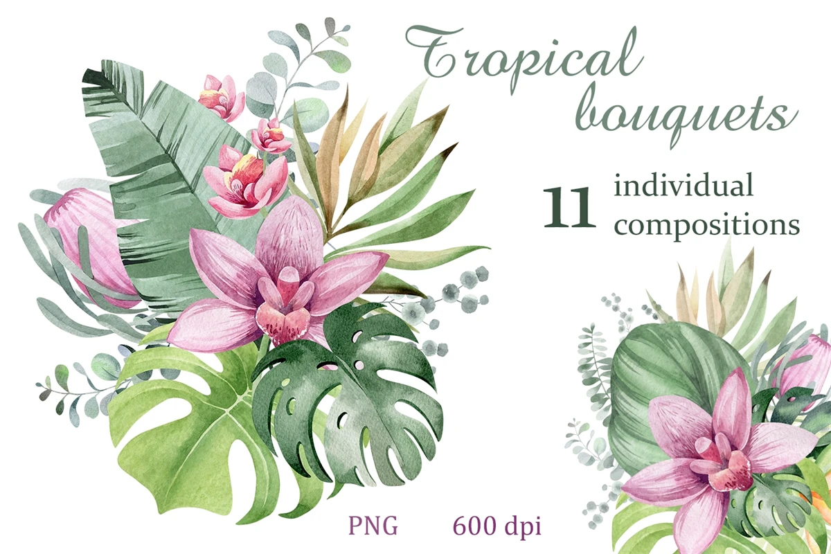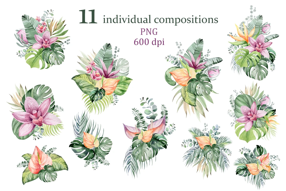 This is a set of tropical flowers and plants. 11 flower compositions on a transparent background, png format. Made in watercolor technique. Perfect design for crafts, sublimation, wedding invitations, greeting cards, apparel, blogs, posters, decor and more.