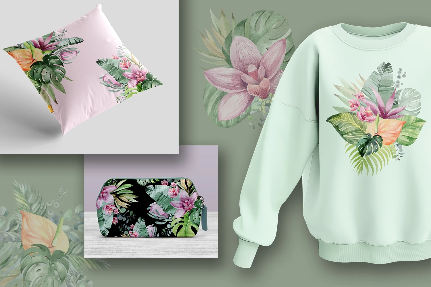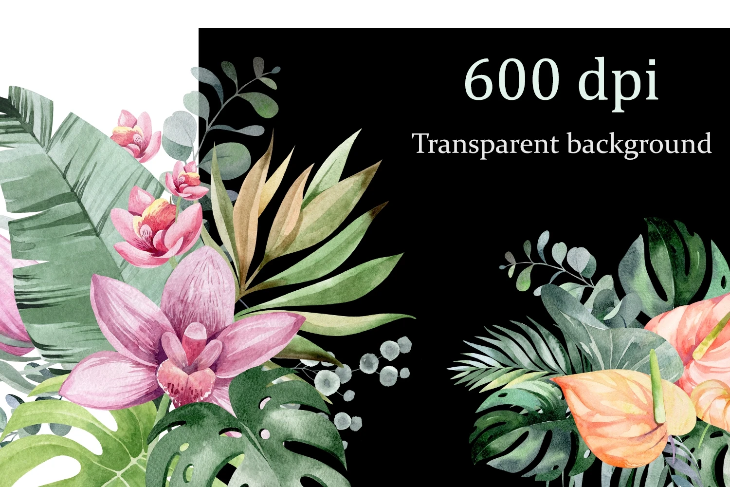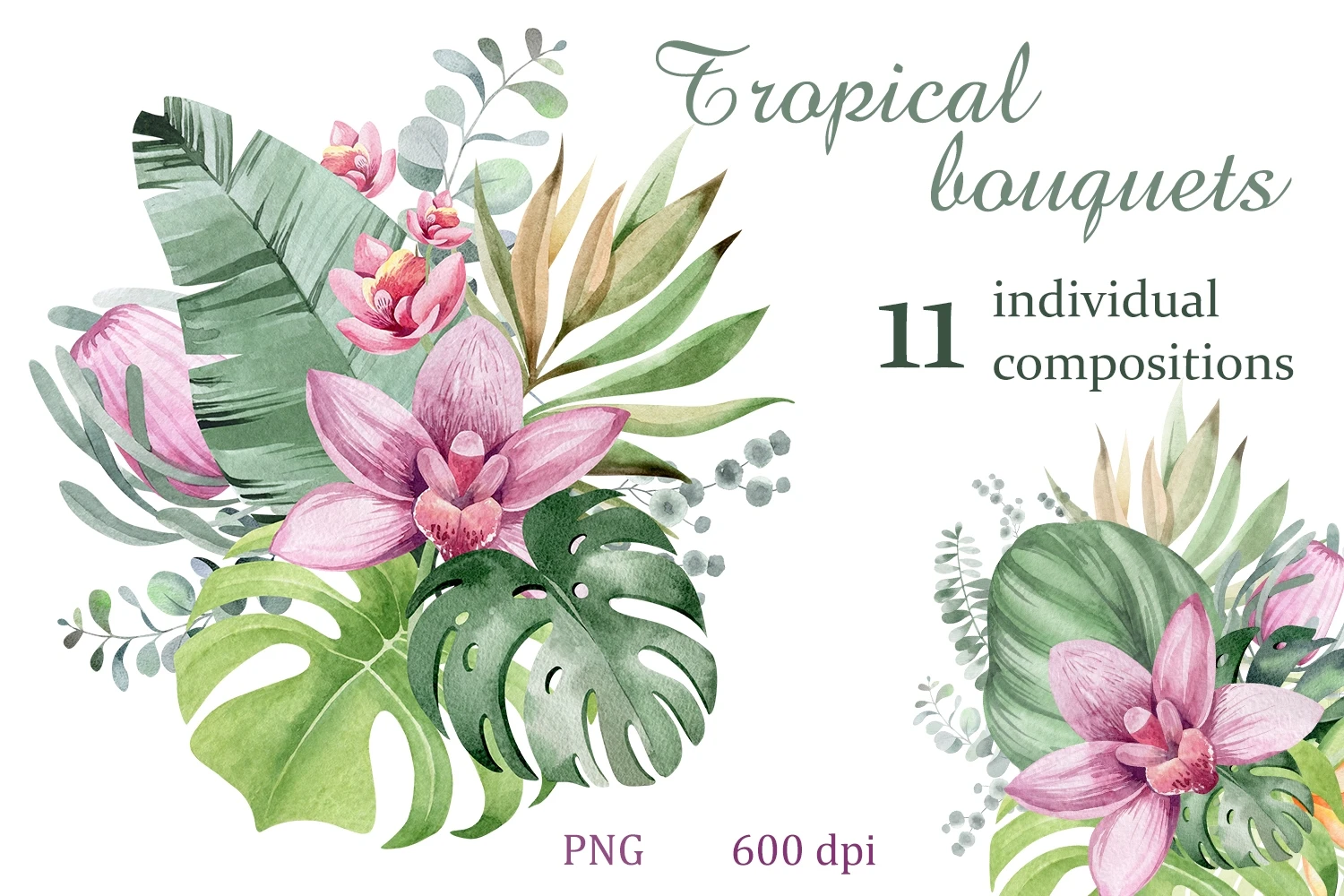 This is a set of tropical flowers and plants. 11 flower compositions on a transparent background, png format. Made in watercolor technique. Perfect design for crafts, sublimation, wedding invitations, greeting cards, apparel, blogs, posters, decor and more.