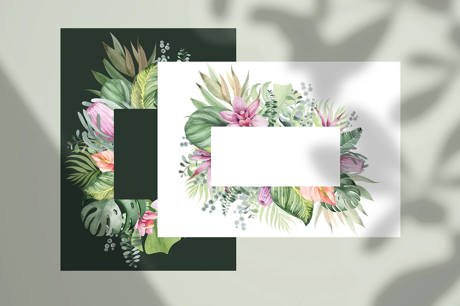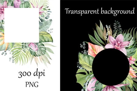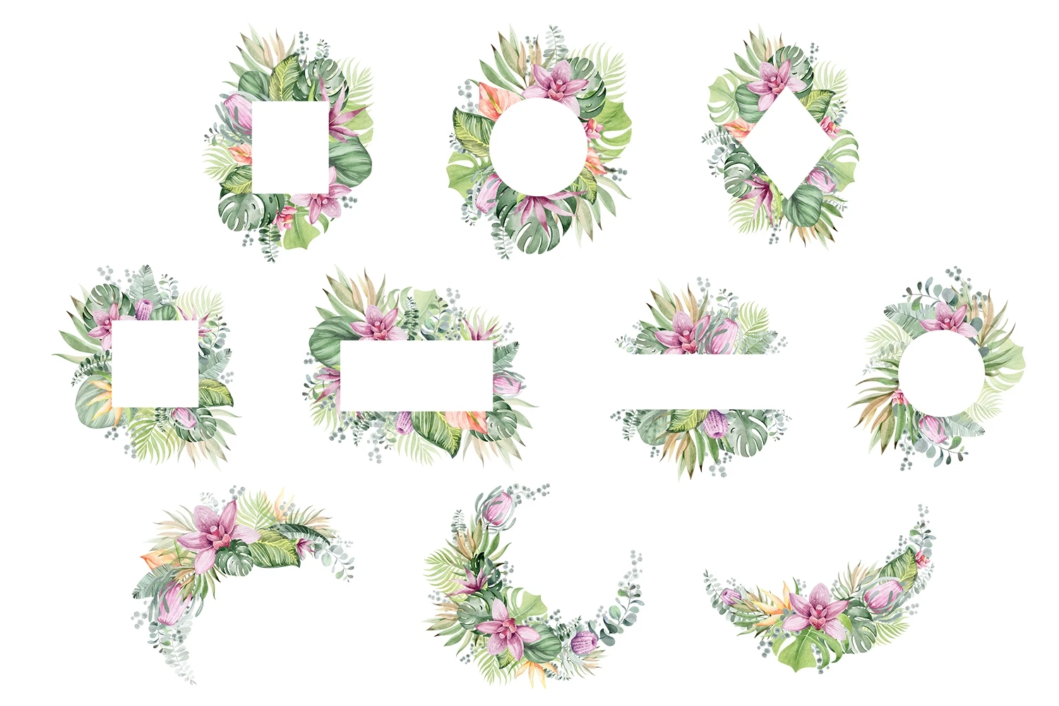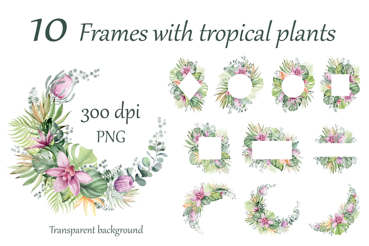 This is a floral clipart of quality frames with tropical flowers. Made in watercolor technique. Perfect design for wedding invitations, greeting cards, posters and more.