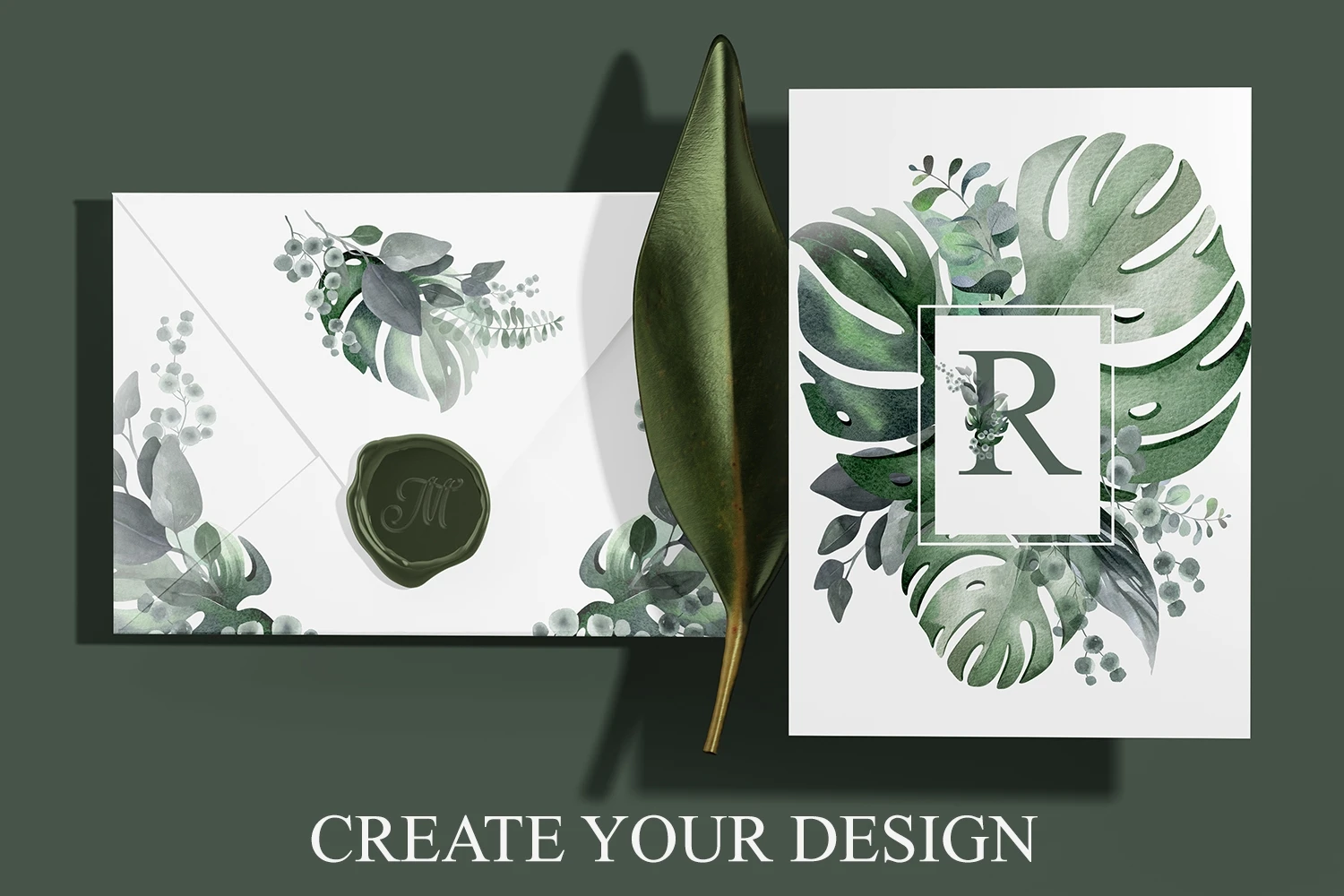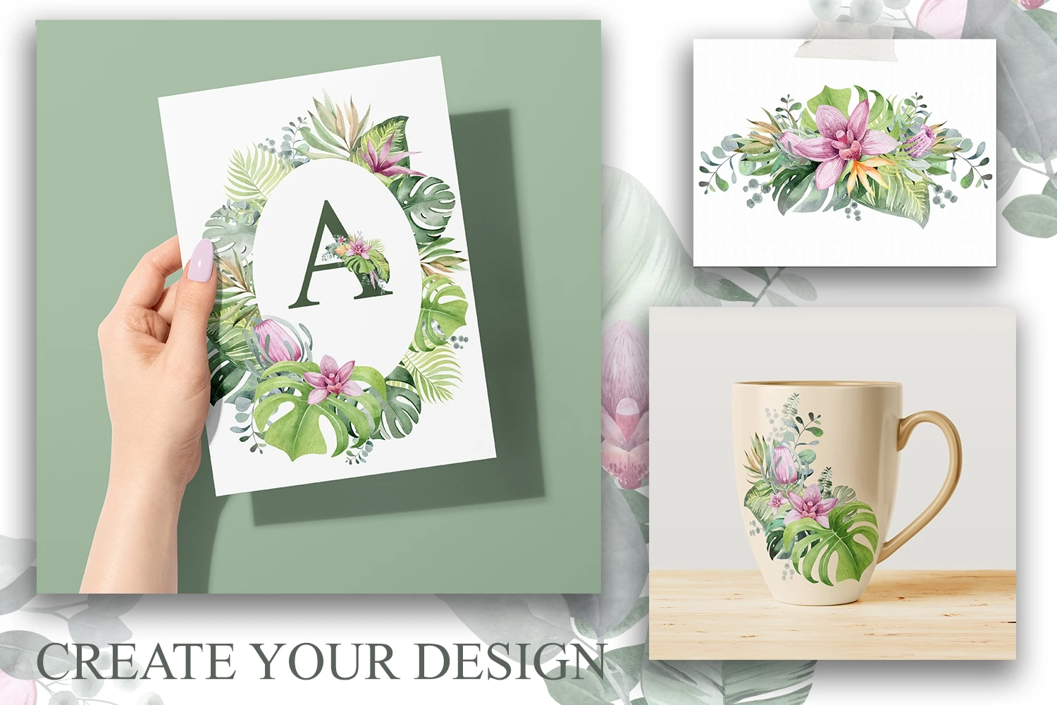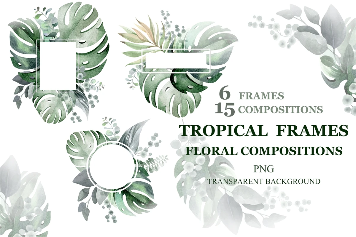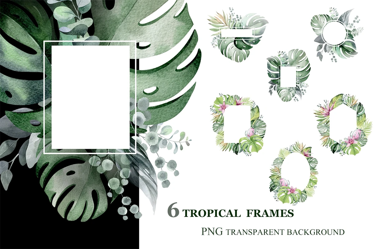 Watercolor hand painted tropical wedding decor clipart for creating wedding invitations, greeting cards, posters, logos and brands.