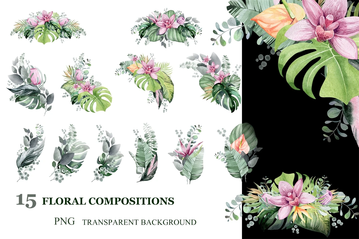 -15 flower compositions (600 dpi, PNG, 5000 px on the larger side)