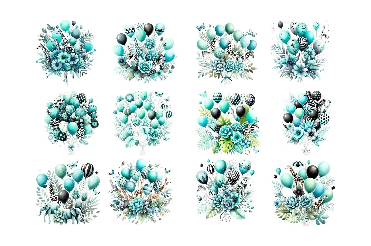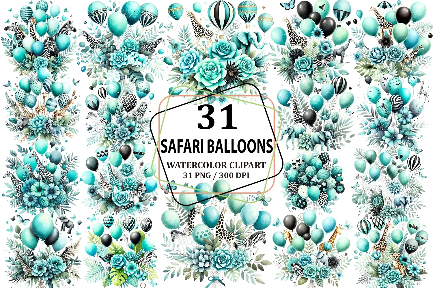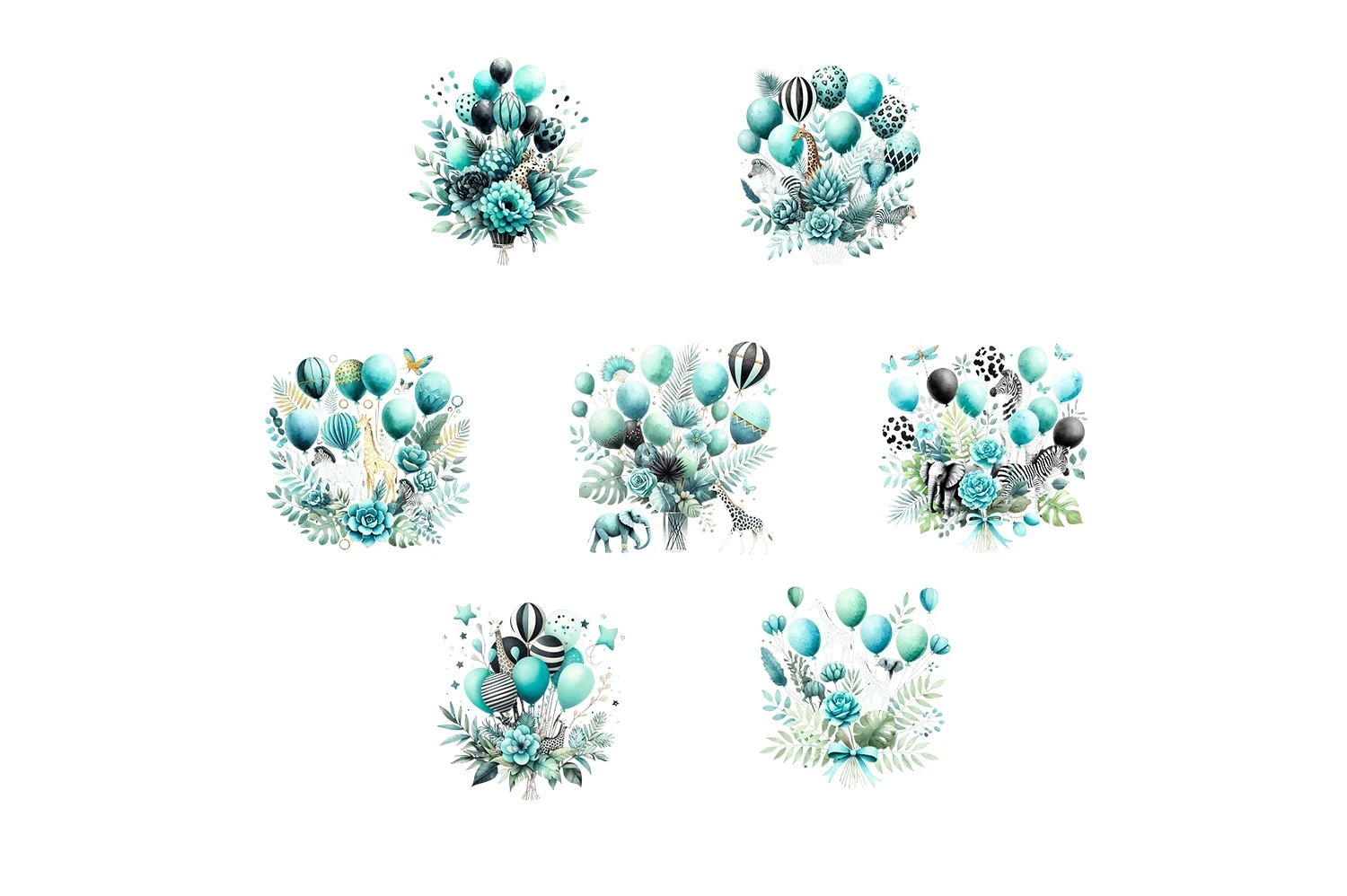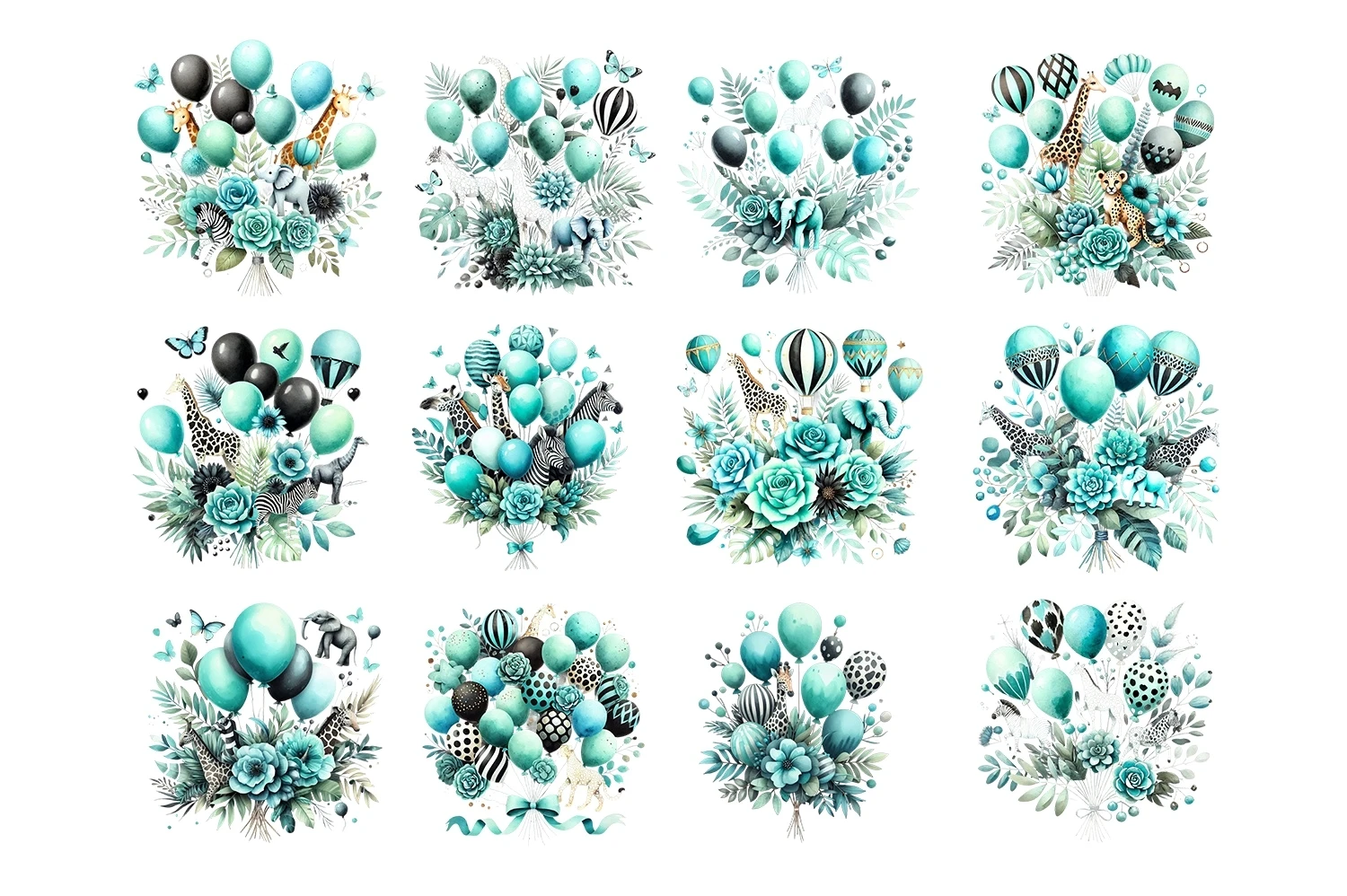 Watercolor Turquoise & Black Safari Balloons Clipart PNG (AI-generated).
