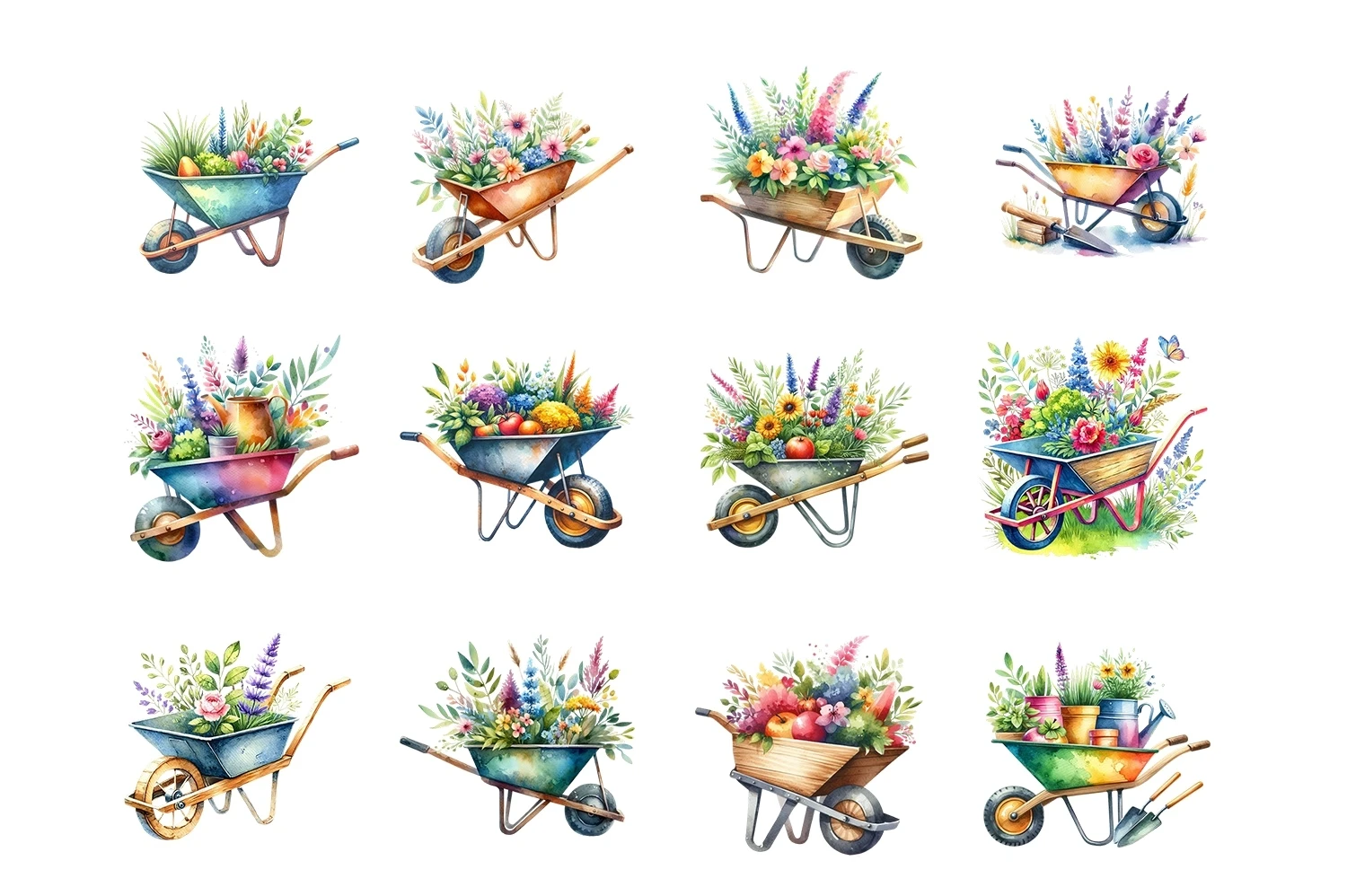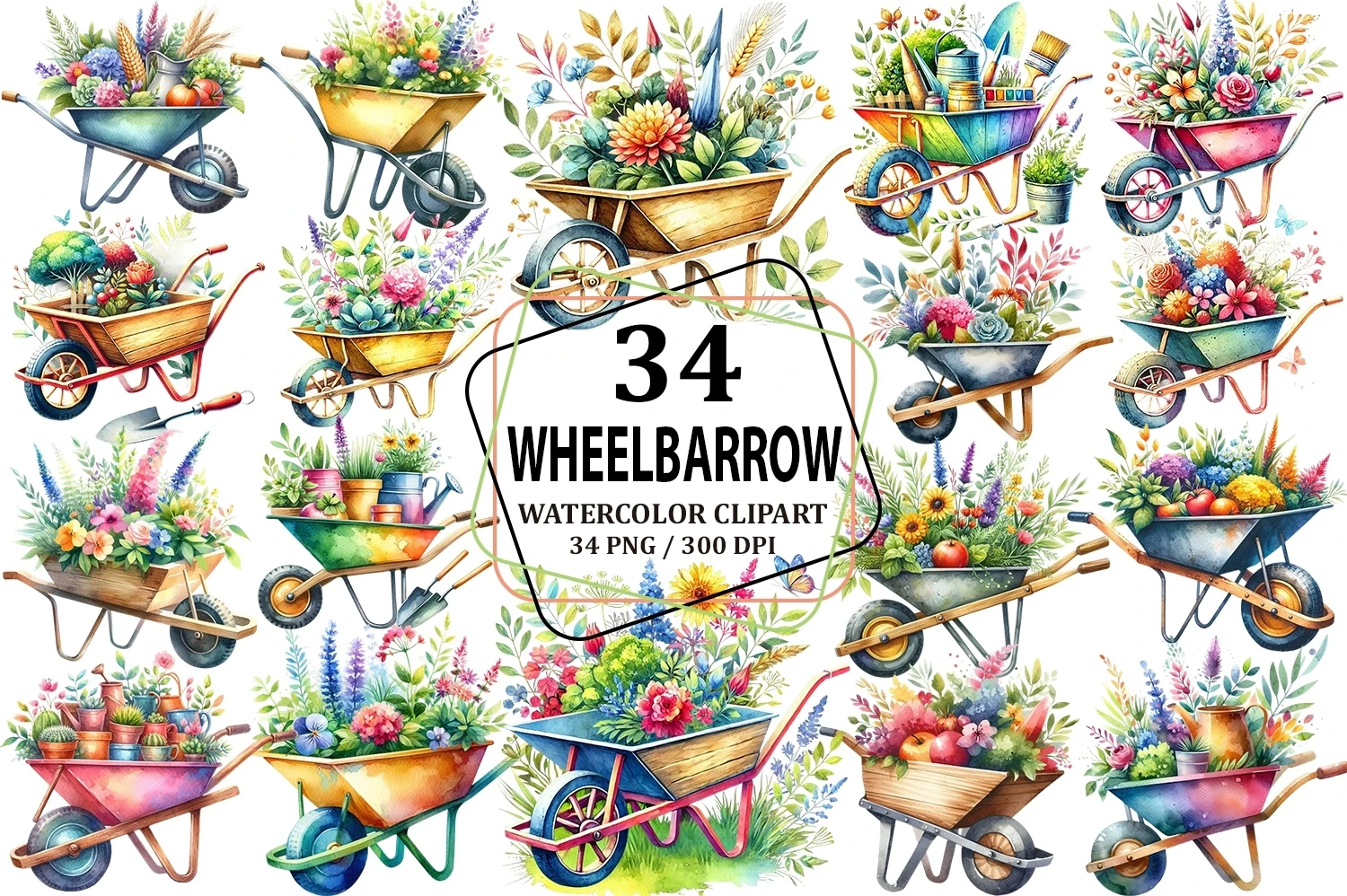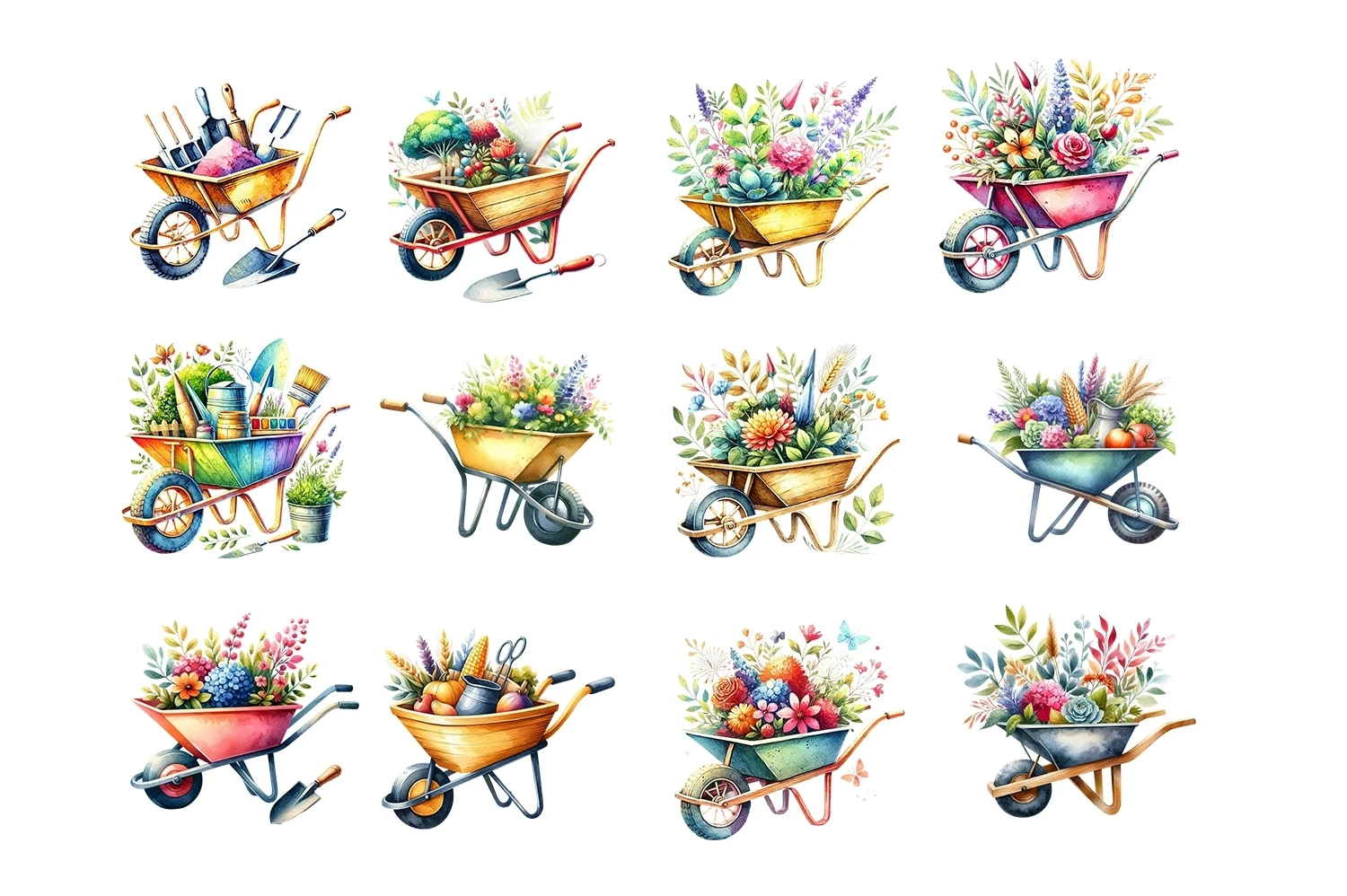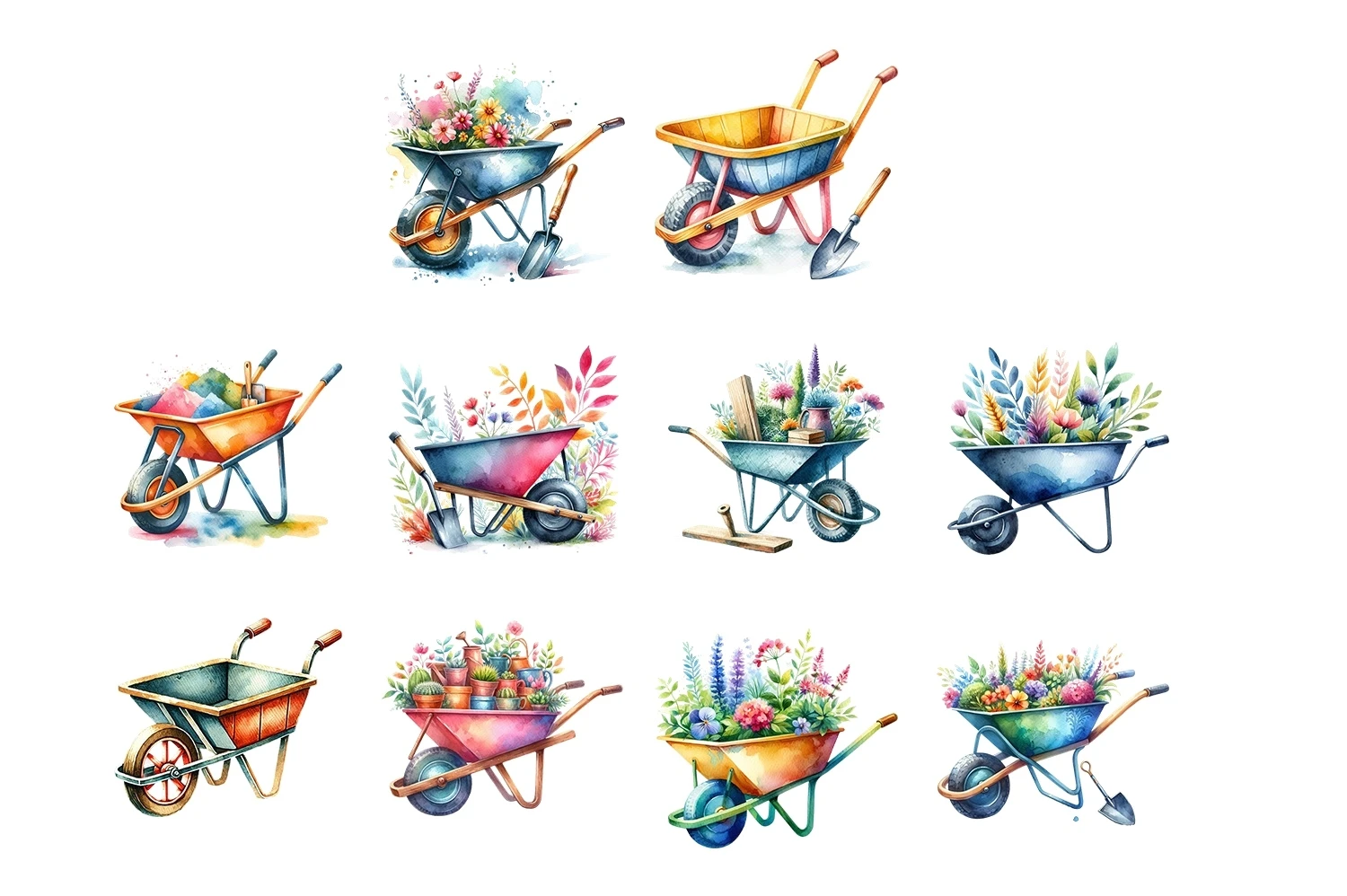 Watercolor Wheelbarrow Clipart Sublimation PNG (AI-generated).