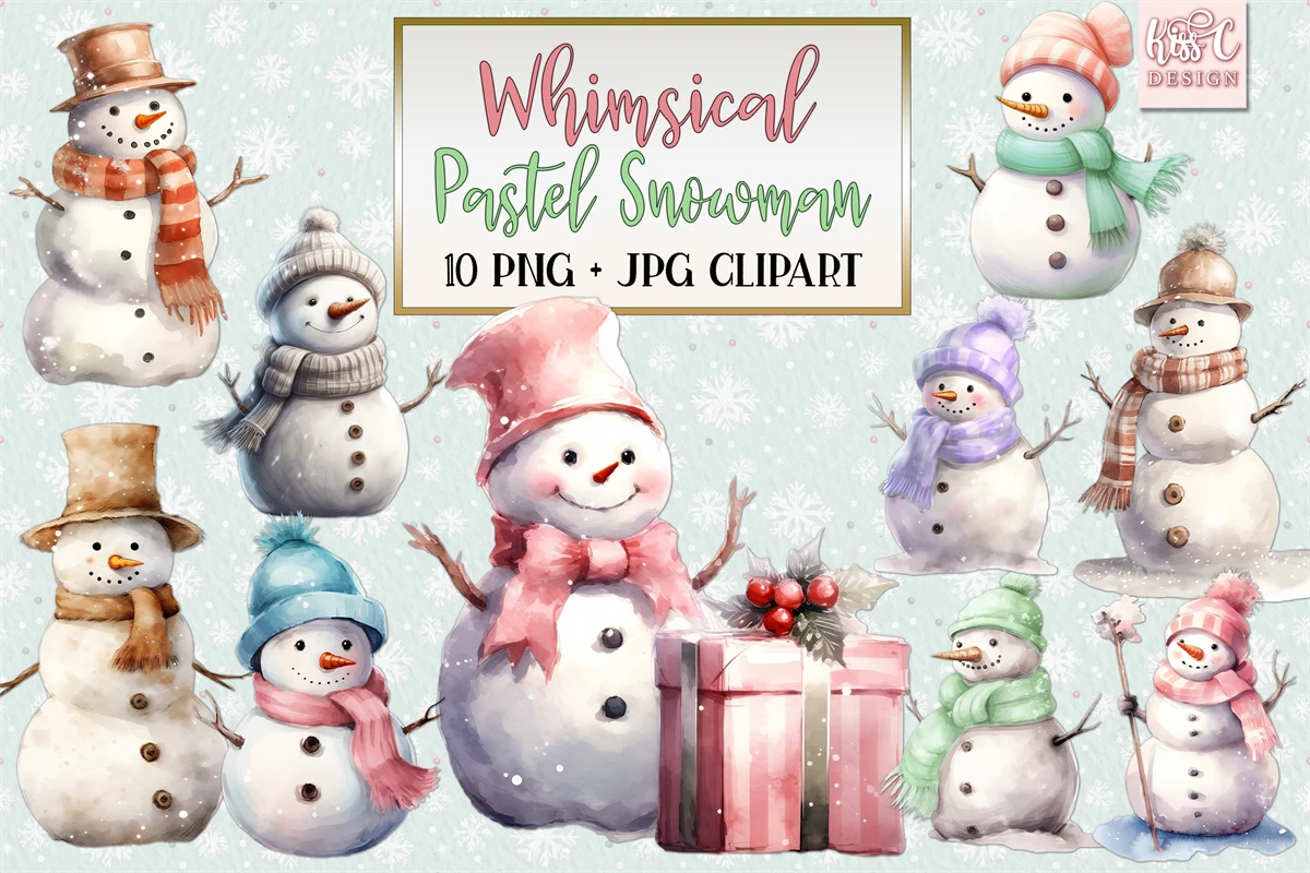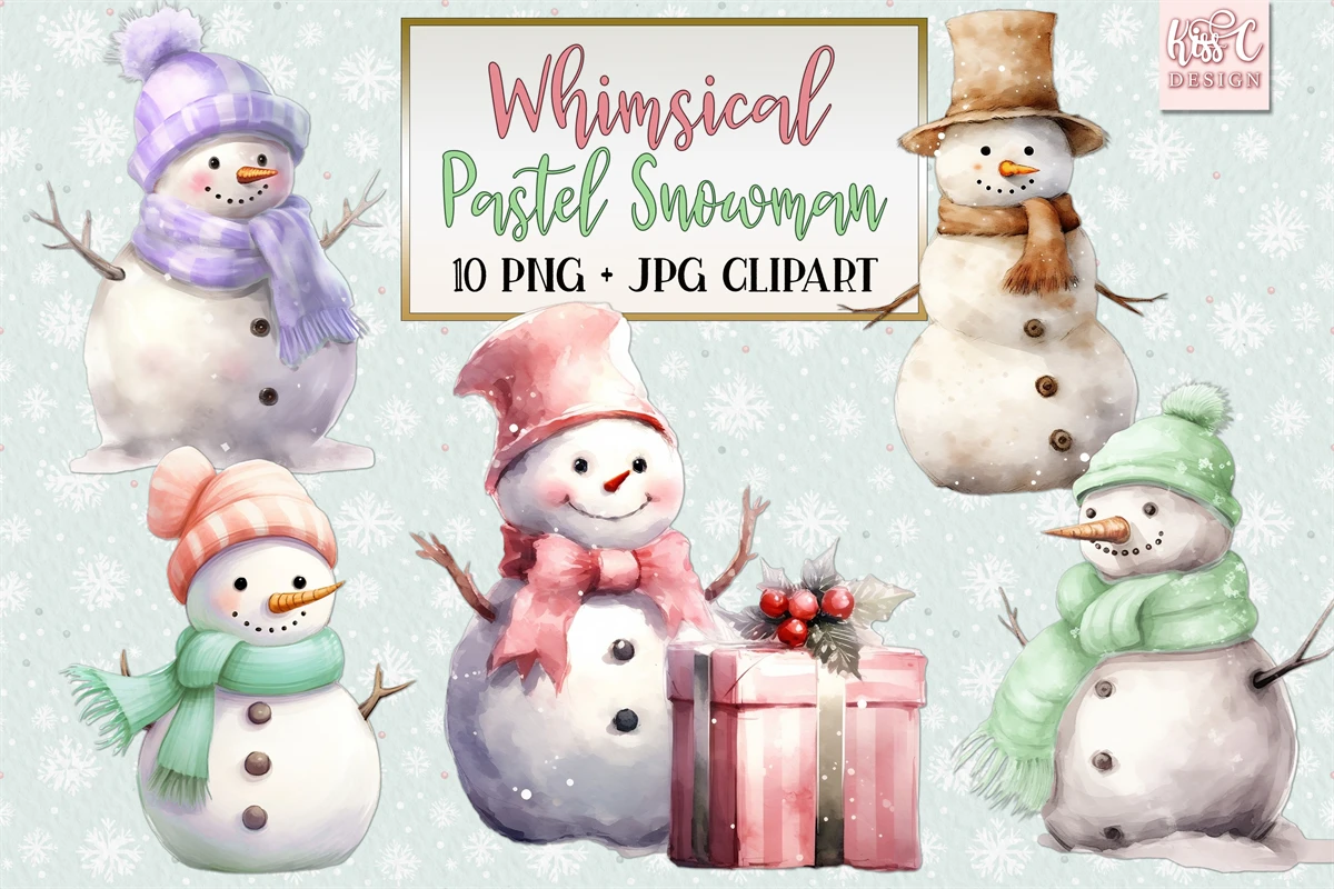 Watercolor Whimsical Pastel Snowman Clipart Christmas Illustration PNG graphics for Sublimation