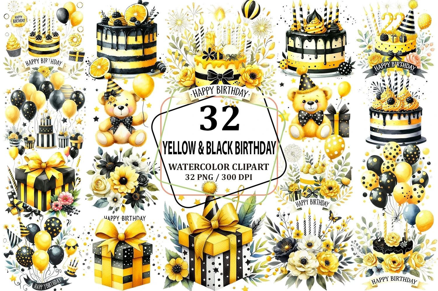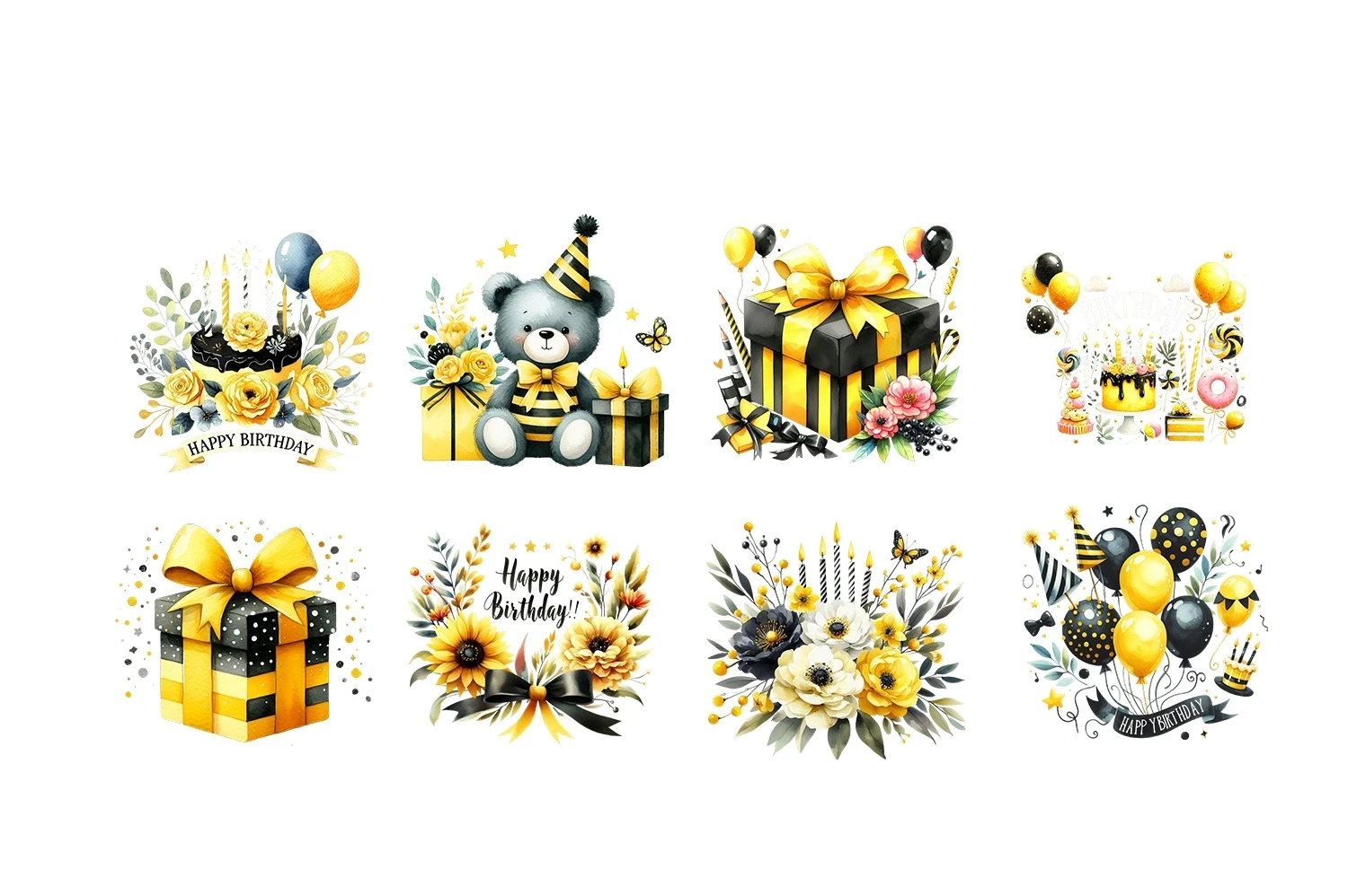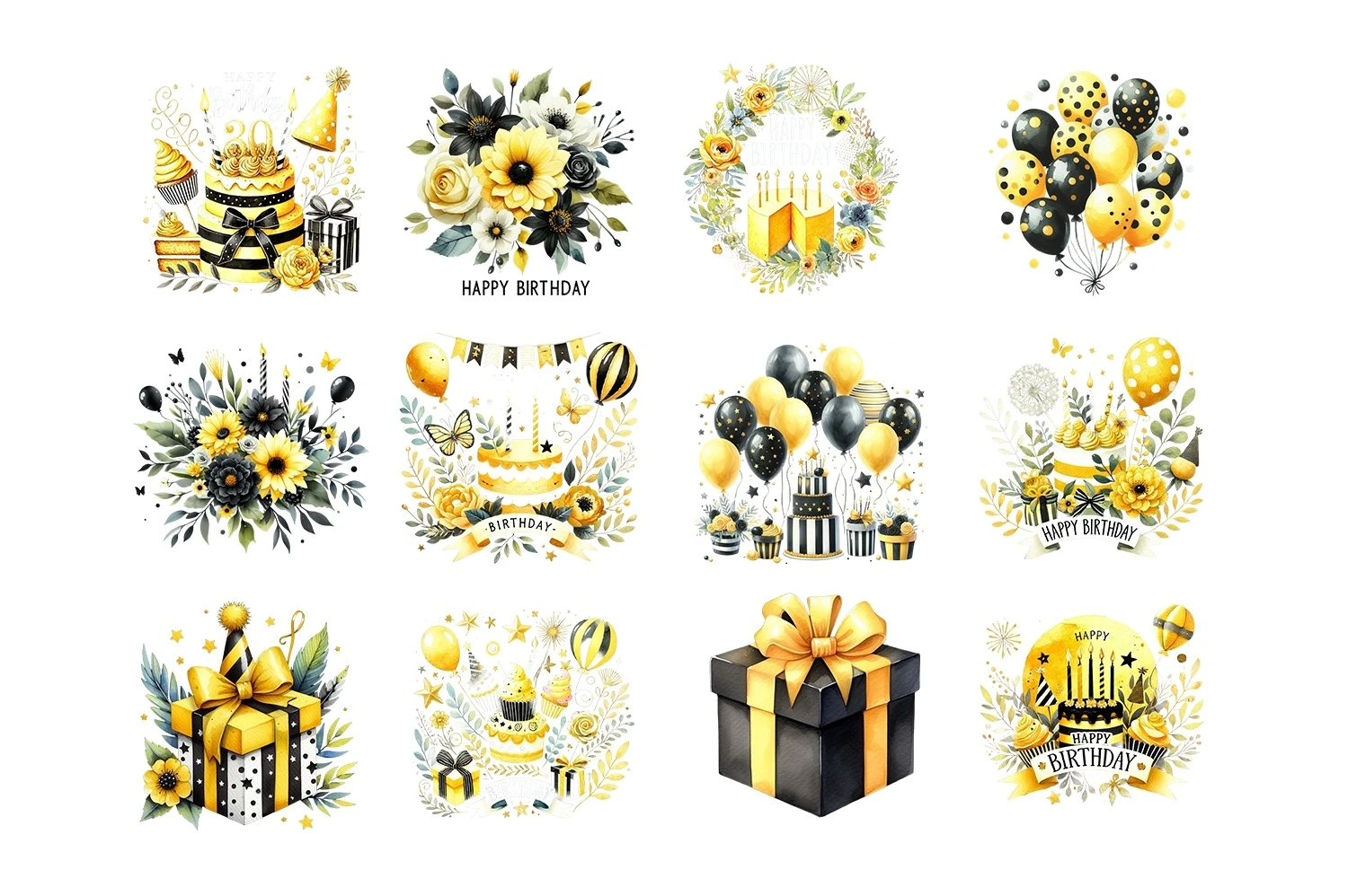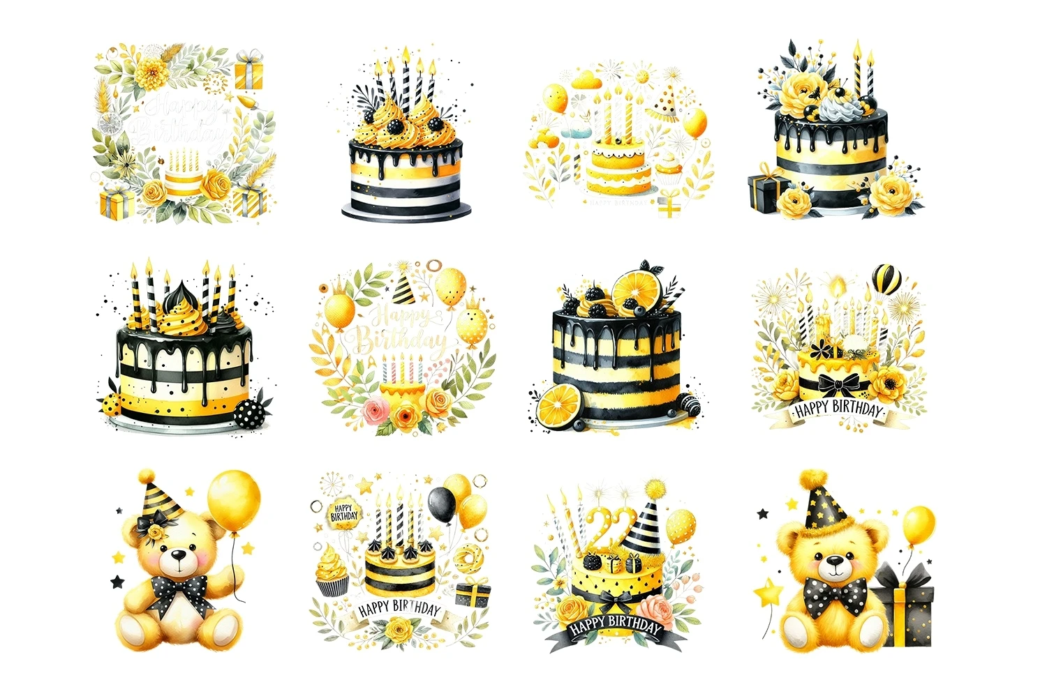 Watercolor Yellow & Black Birthday Clipart Sublimation Bundle (AI-generated).