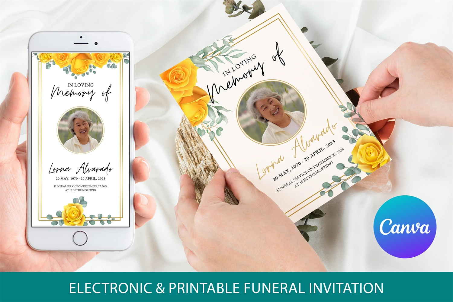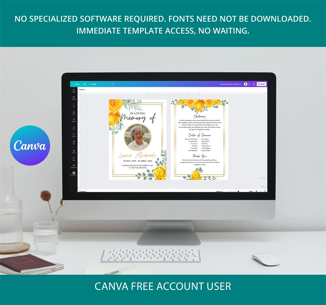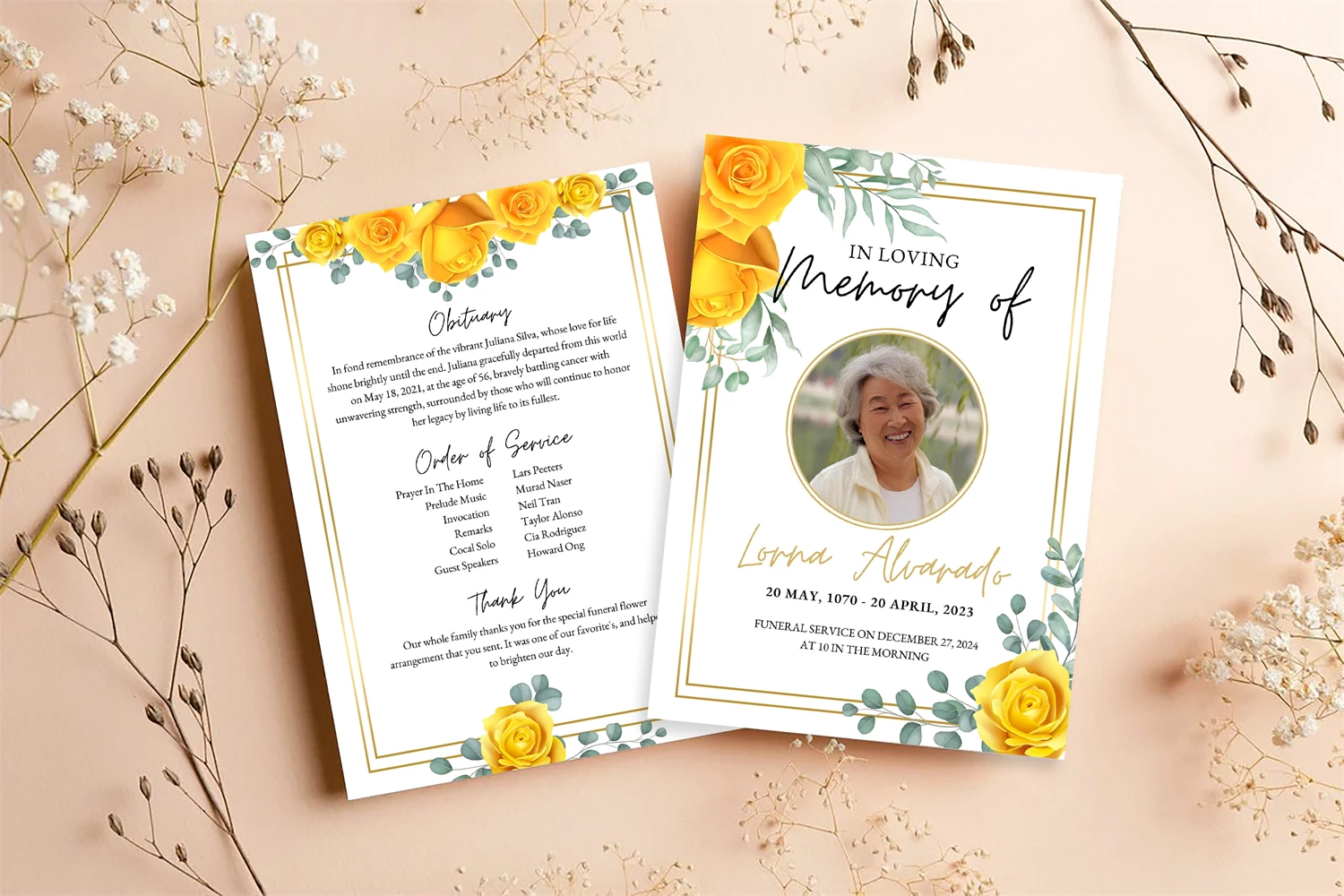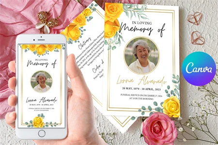 Minimalist Funeral Program Template, Simple Funeral Memorial Program, Funeral program, Funeral program template for woman, Funeral announcement, Funeral program template canva, Funeral program with yellow roses.