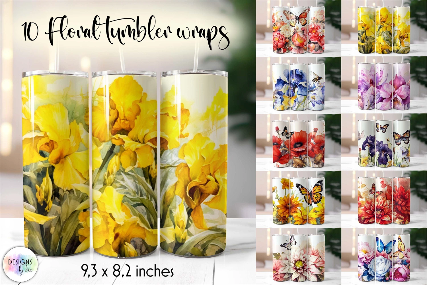 20 oz Tumbler wrap sublimation bundle with elegant watercolour iris flowers, marigold flowers, dahlia flowers and peony flowers.